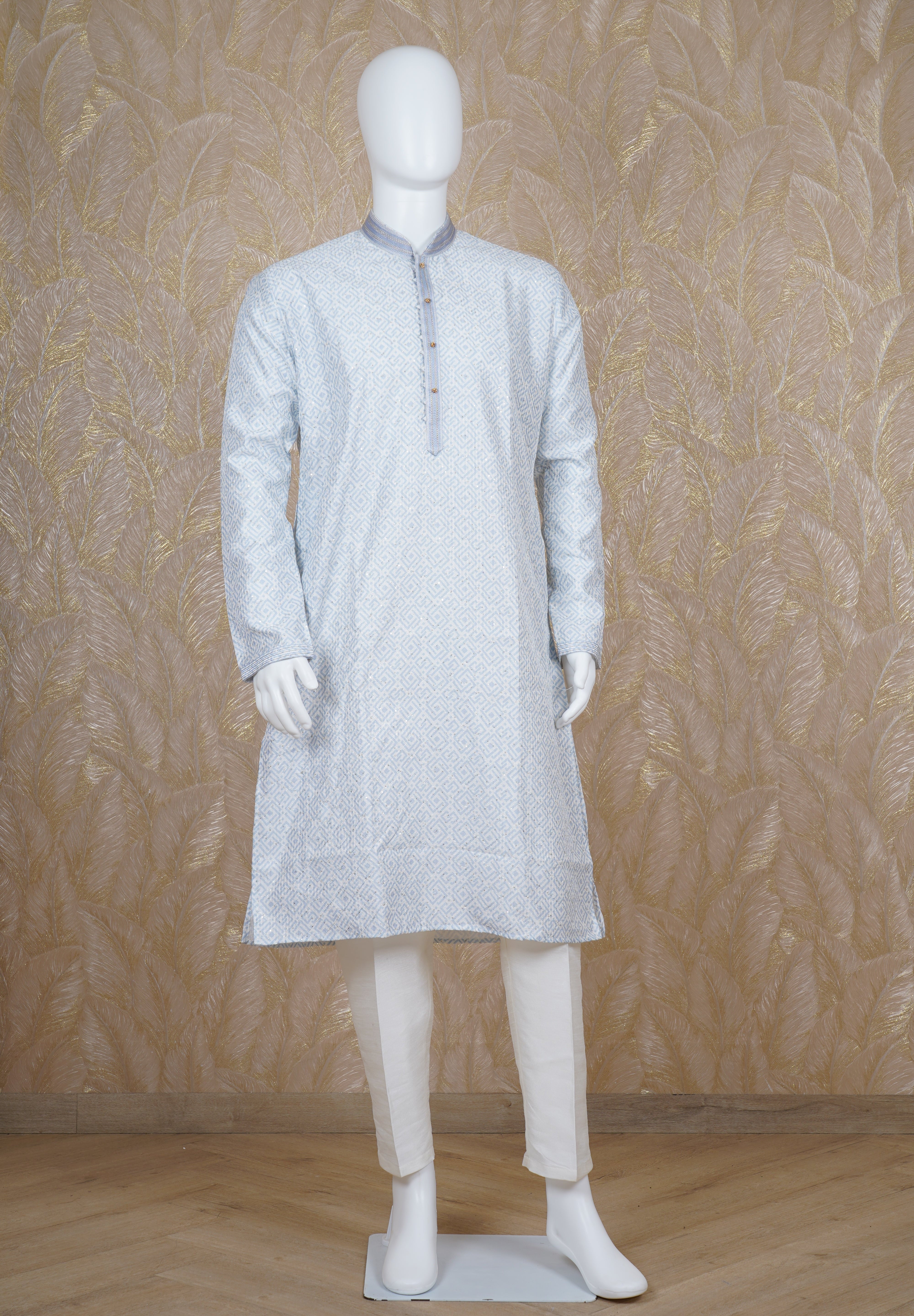 Blue geometric print kurta adorned with thread embroidered and sequins work. Paired with a cotton pants. Model is wearing size, “Medium”.
