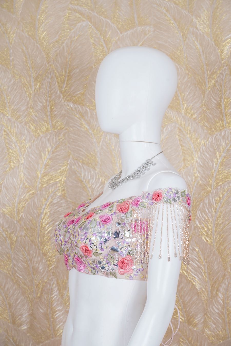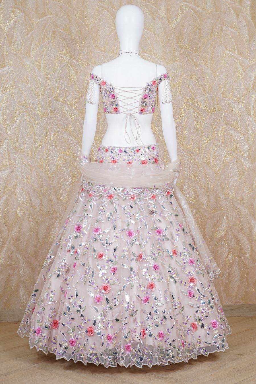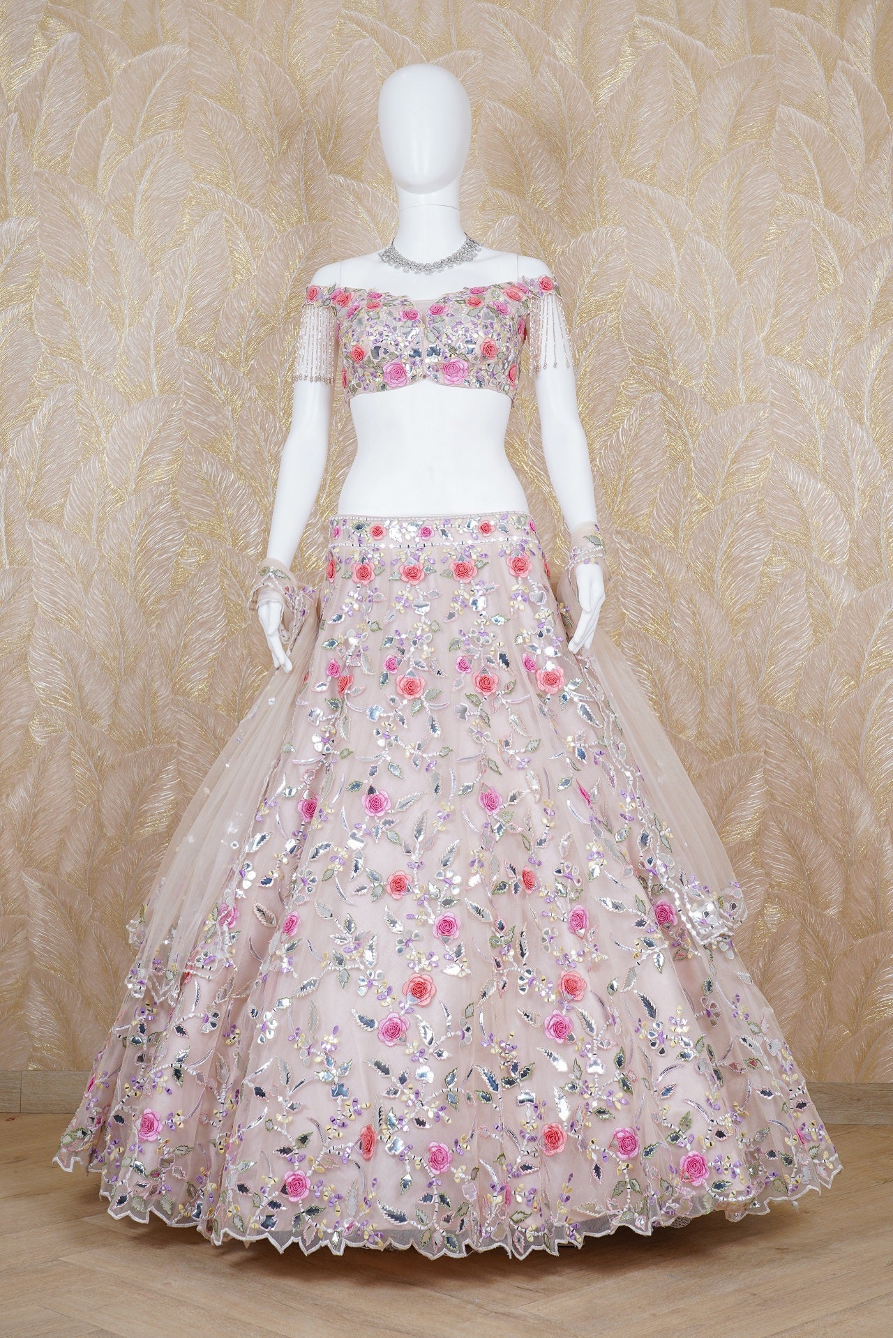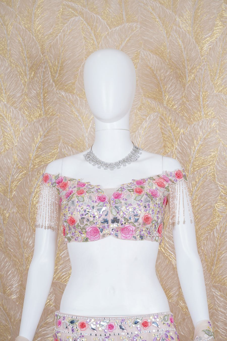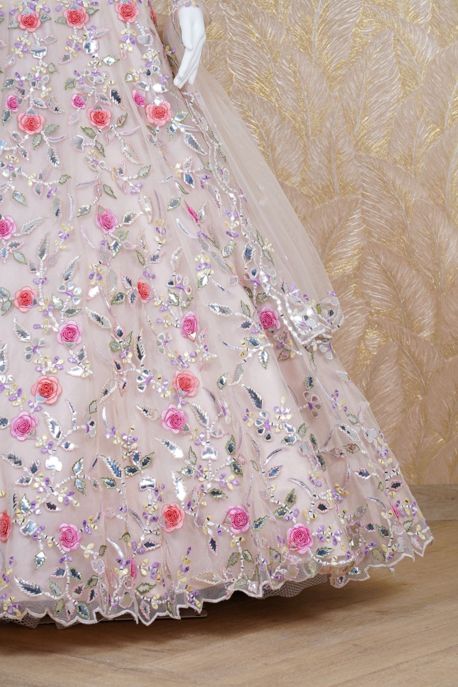 Baby Pink Tulle Lehenga adorned with 3D flowers, mirror, resham, kardana and foil embroidered, paired with matching embroidered blouse and cut worked dupatta. Model is wearing size, “Medium”.