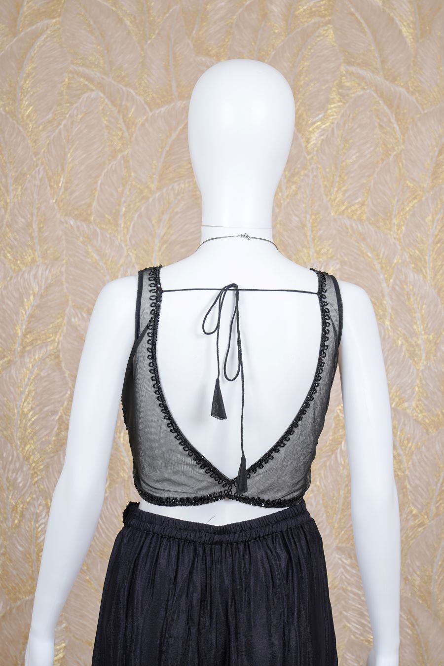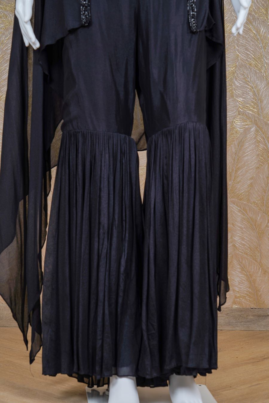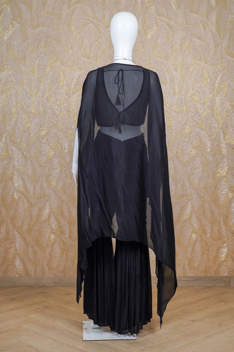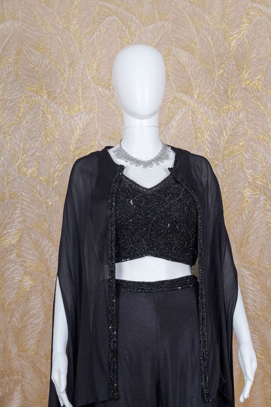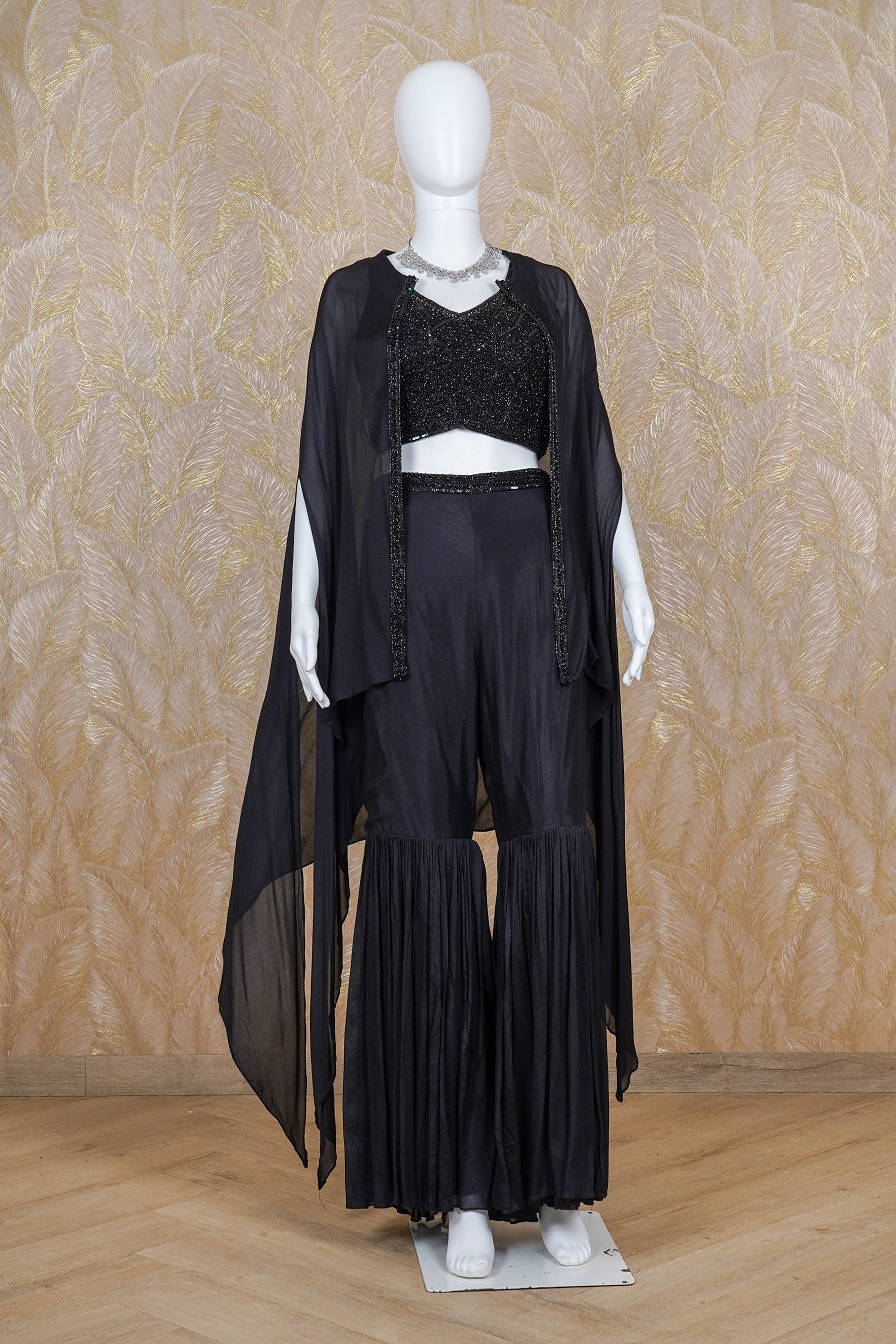Black Cape Set embellished with kardana, sequins and crystals pearls embroidered crop top. Comes with an embroidered bordered cape and sharara pants. Model is wearing size, “Medium”.