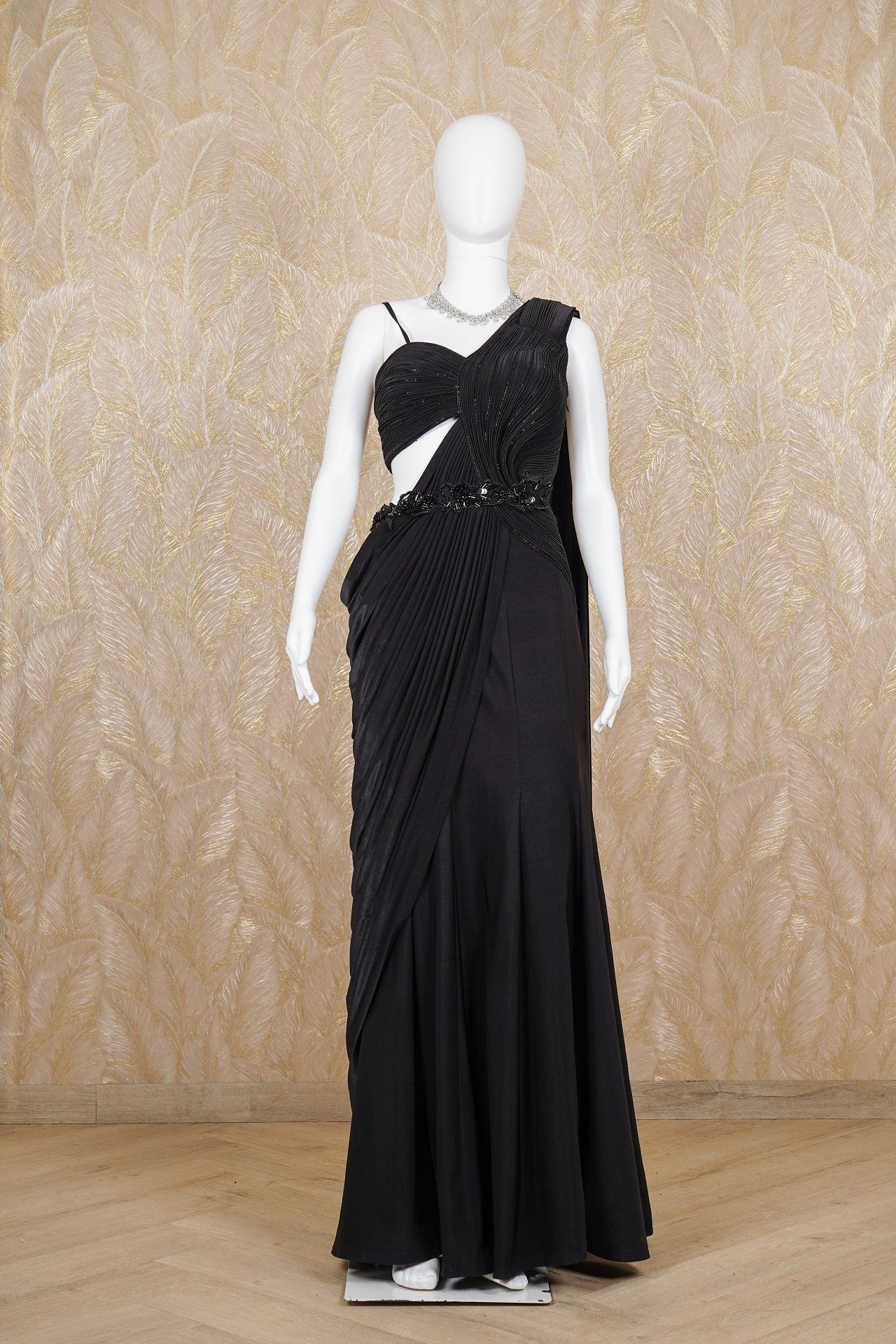 Black drape embellished with sequins, kardana. Styled with an embroidered cut work belt. Model is wearing size, “Medium”.