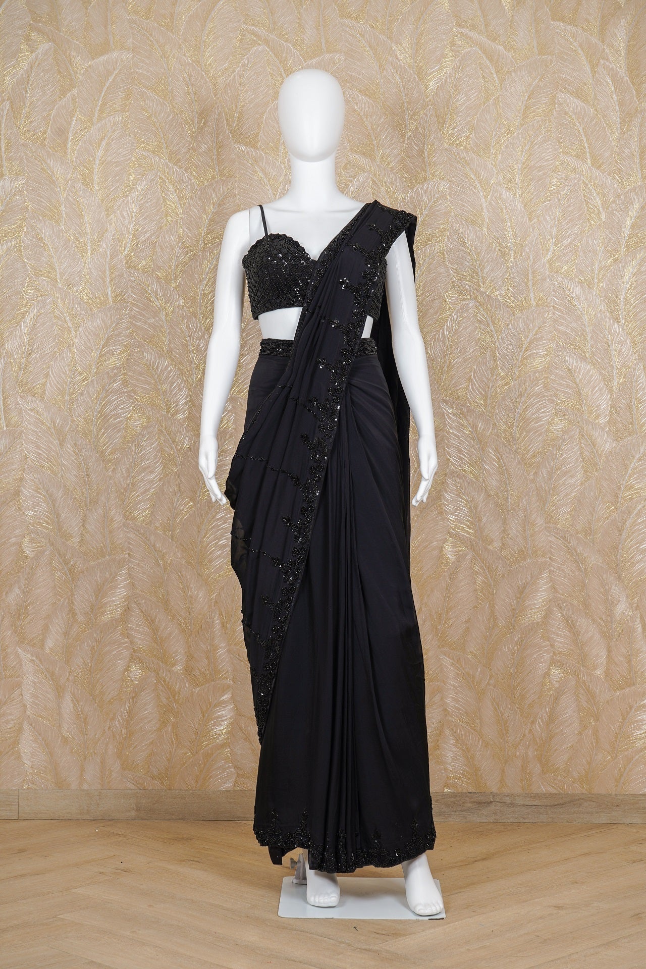 Black organza pre-draped saree adorned with sequins, kardana and beads embroidered, Paired with a embroidered handcrafted blouse. Model is wearing size, “Medium”.
