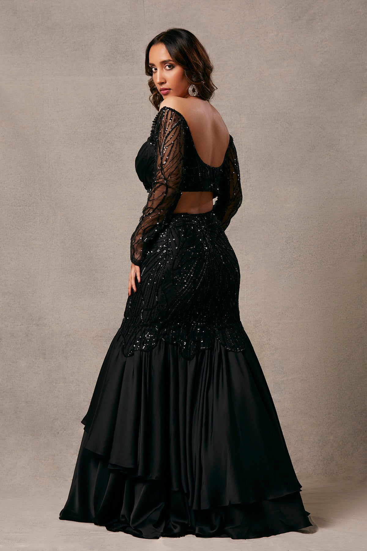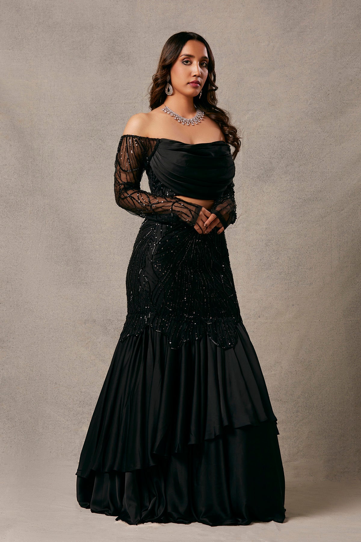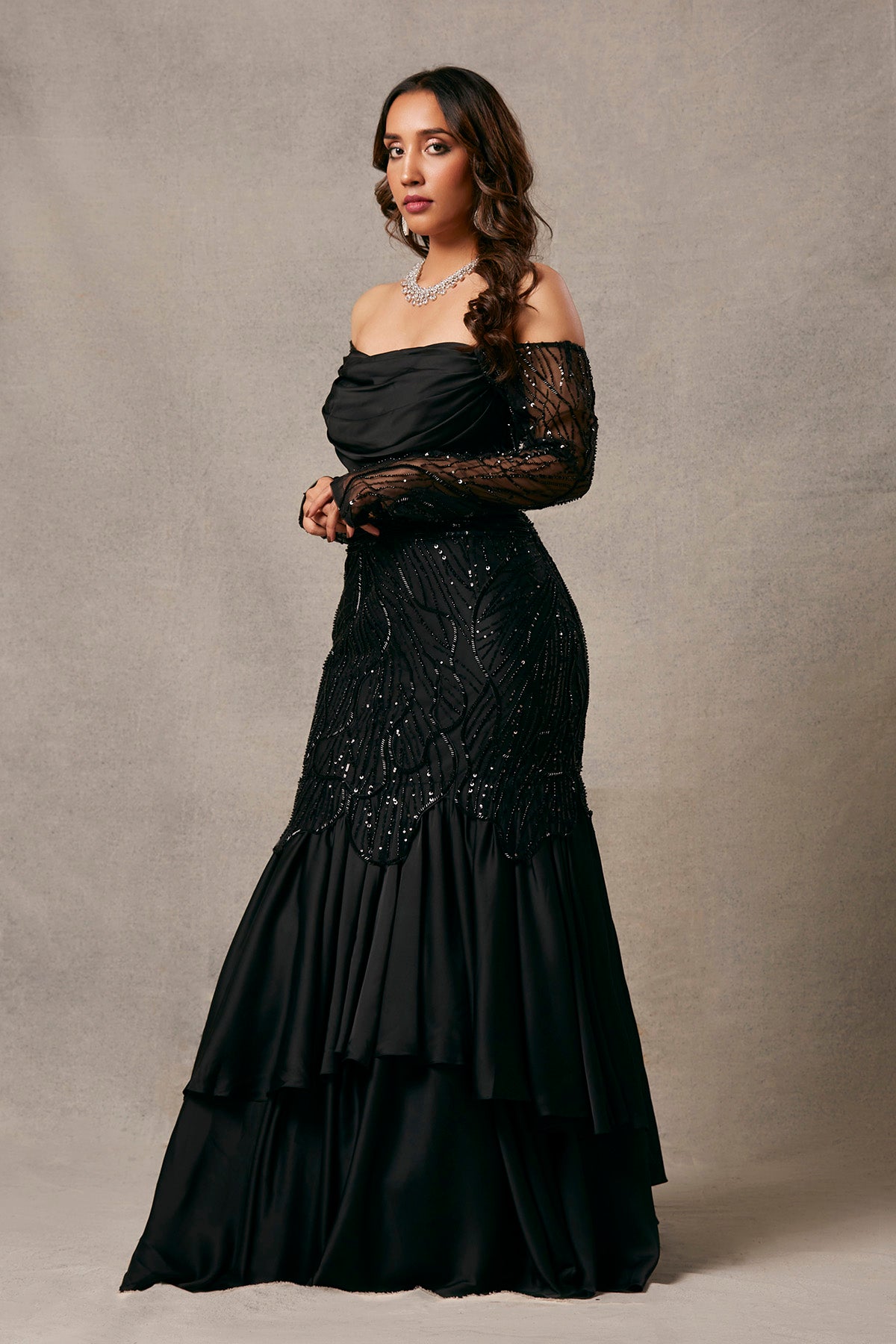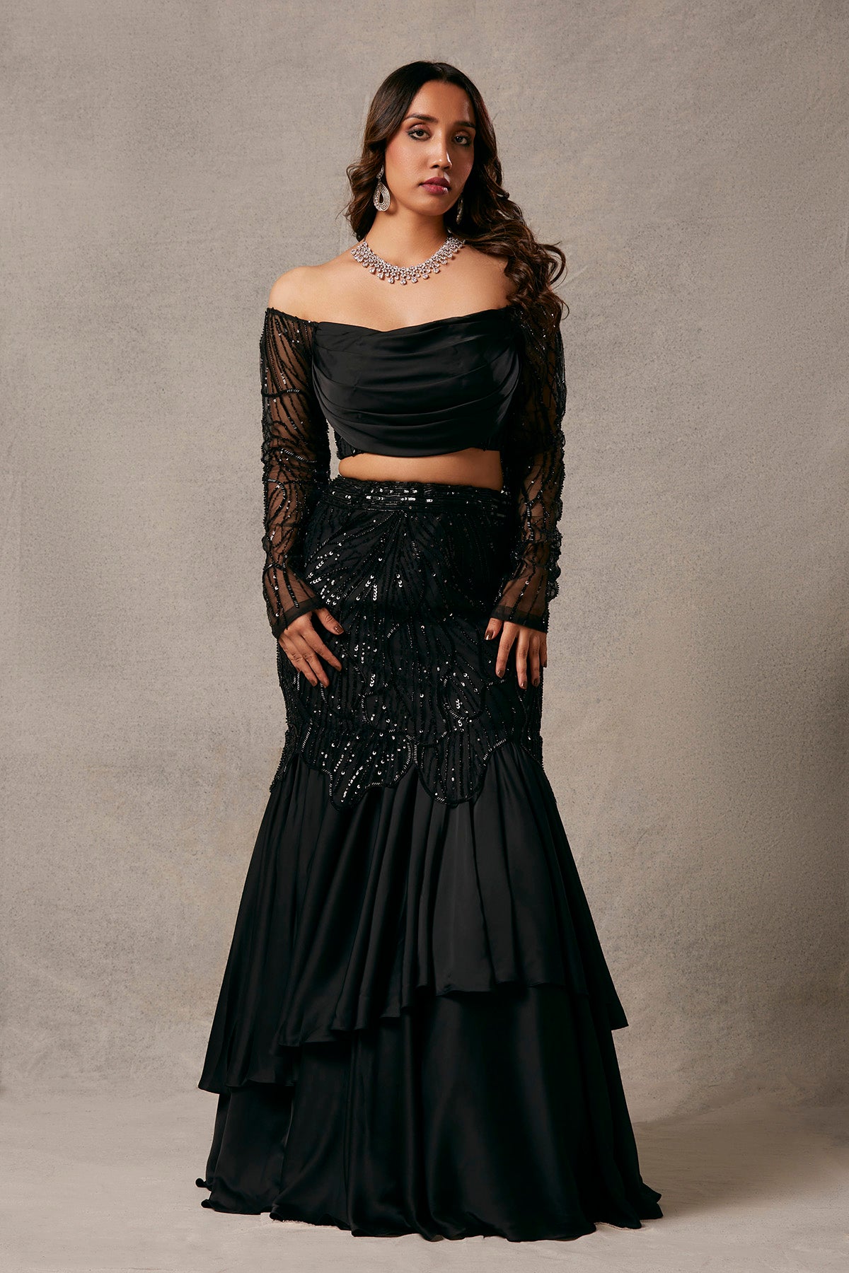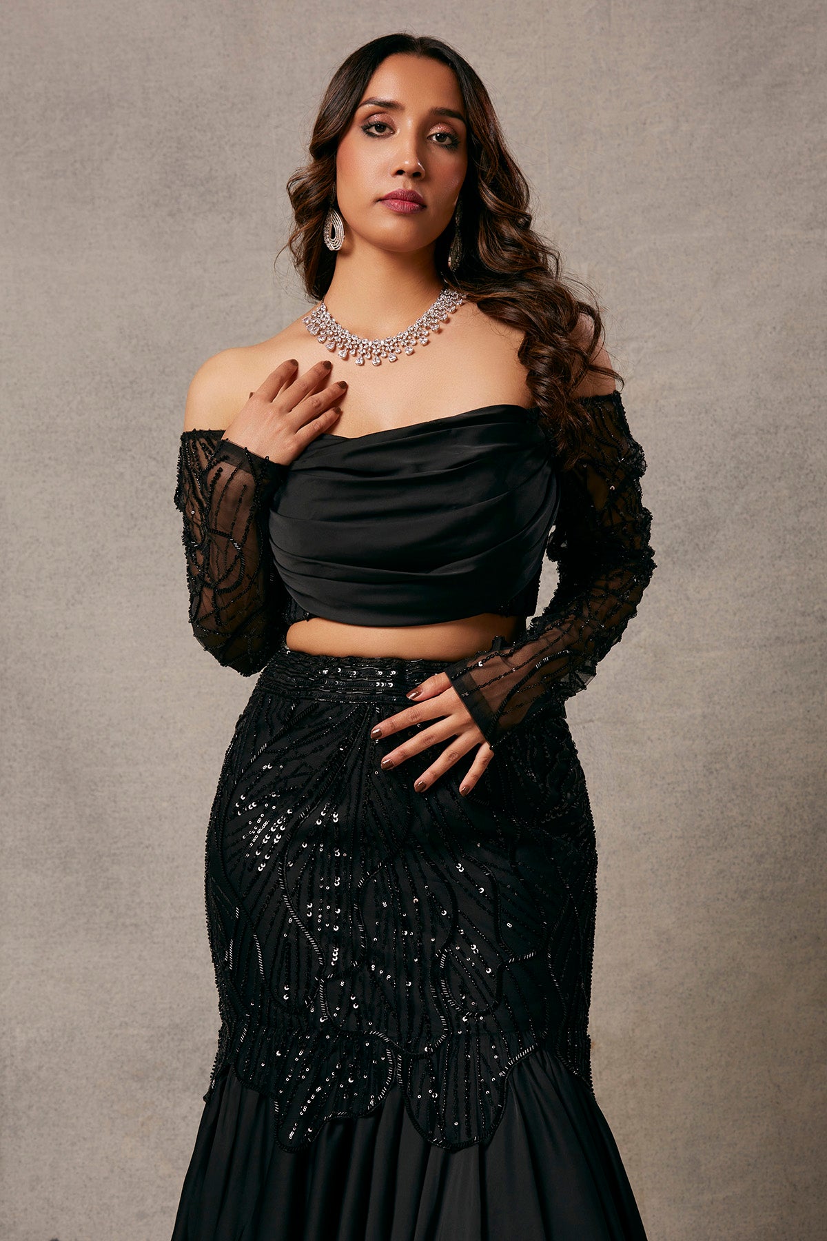 Elegant satin fishcut lehenga adorned with a cowl blouse featuring full sleeves and an elegant off-shoulder design, complemented by a luxurious satin ruffle stole.