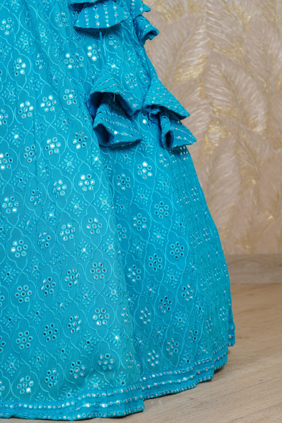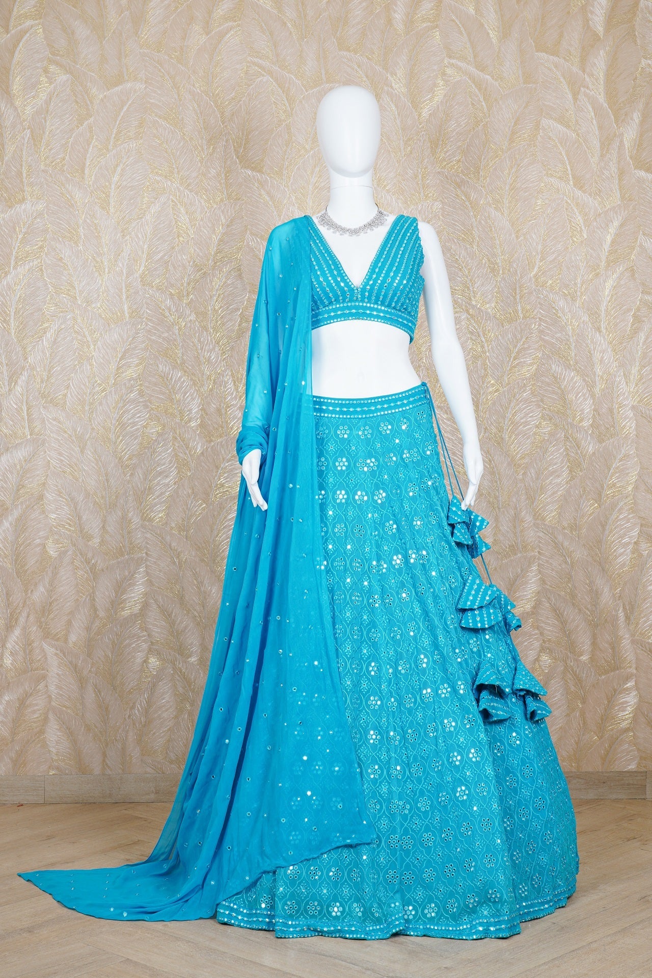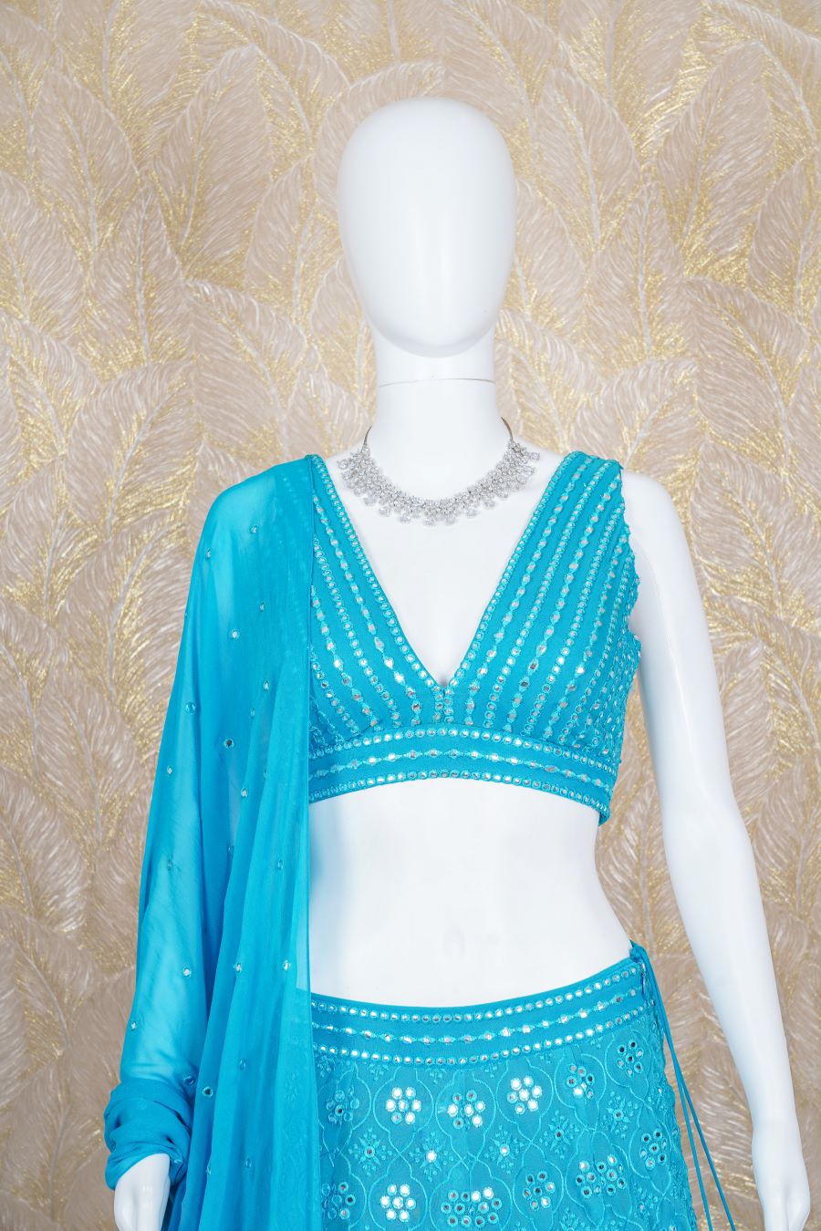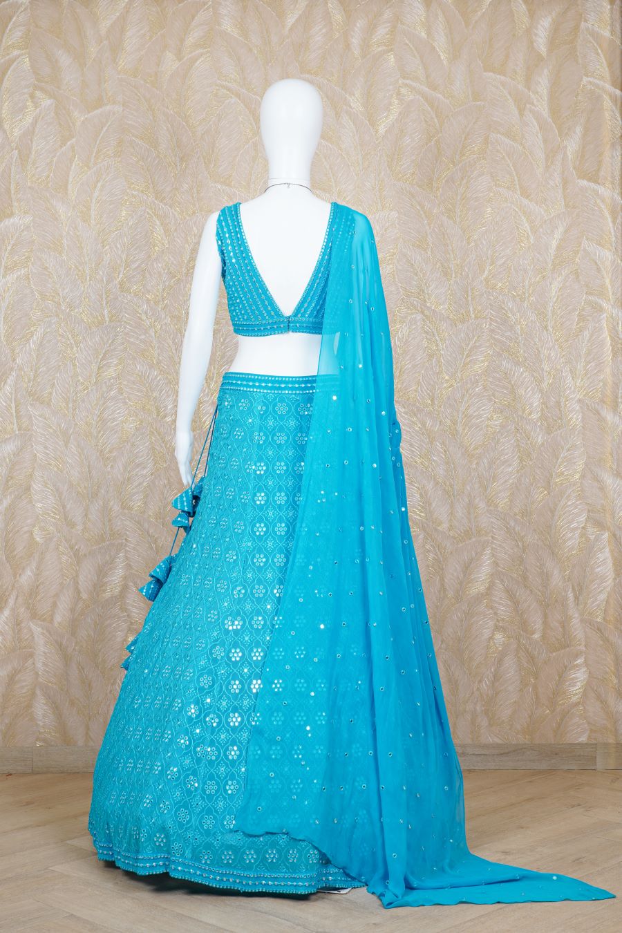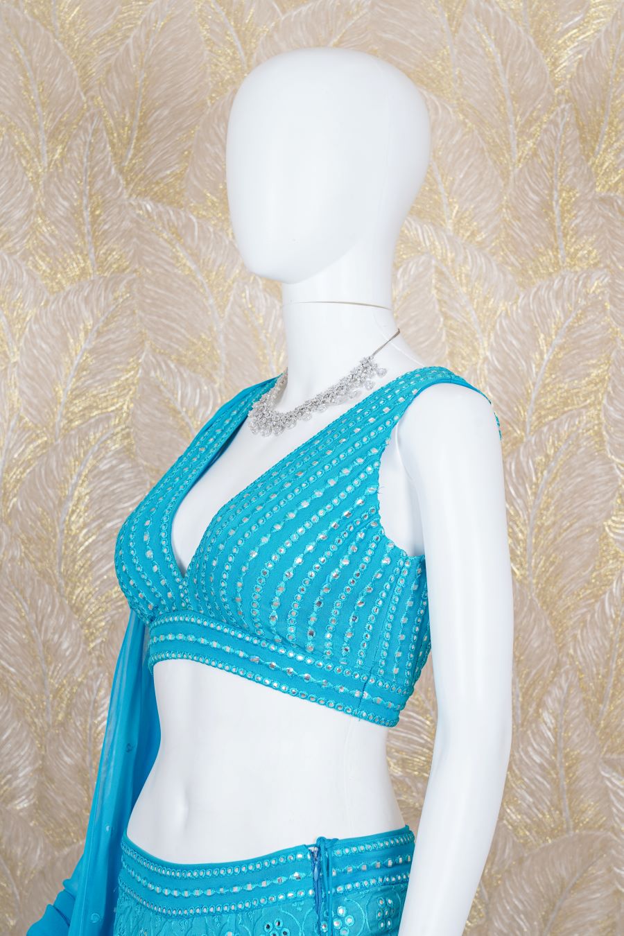 Blue Georgette abla embroidered lehenga, paired with V-neck matching abla blouse and embroidered dupatta. Model is wearing size, “Medium”