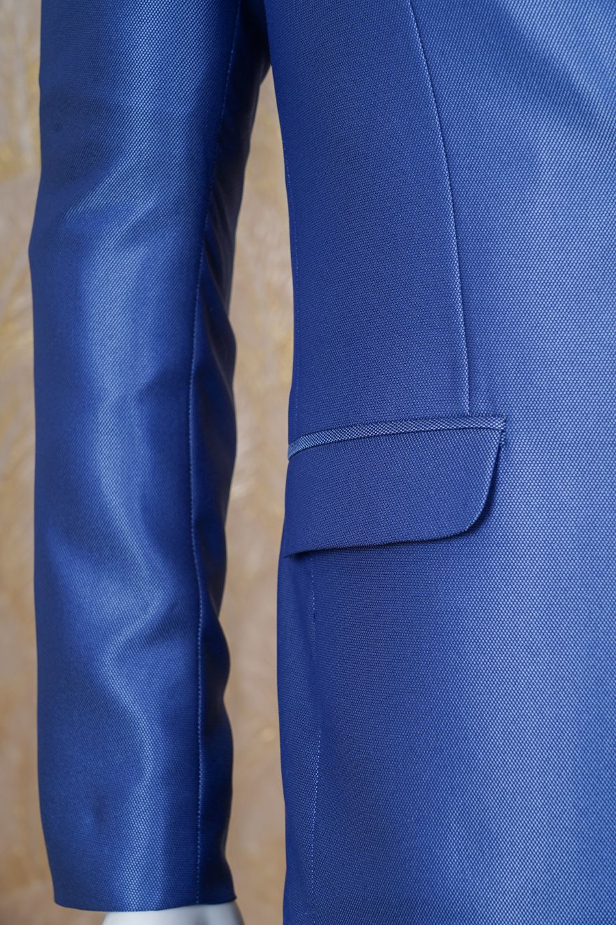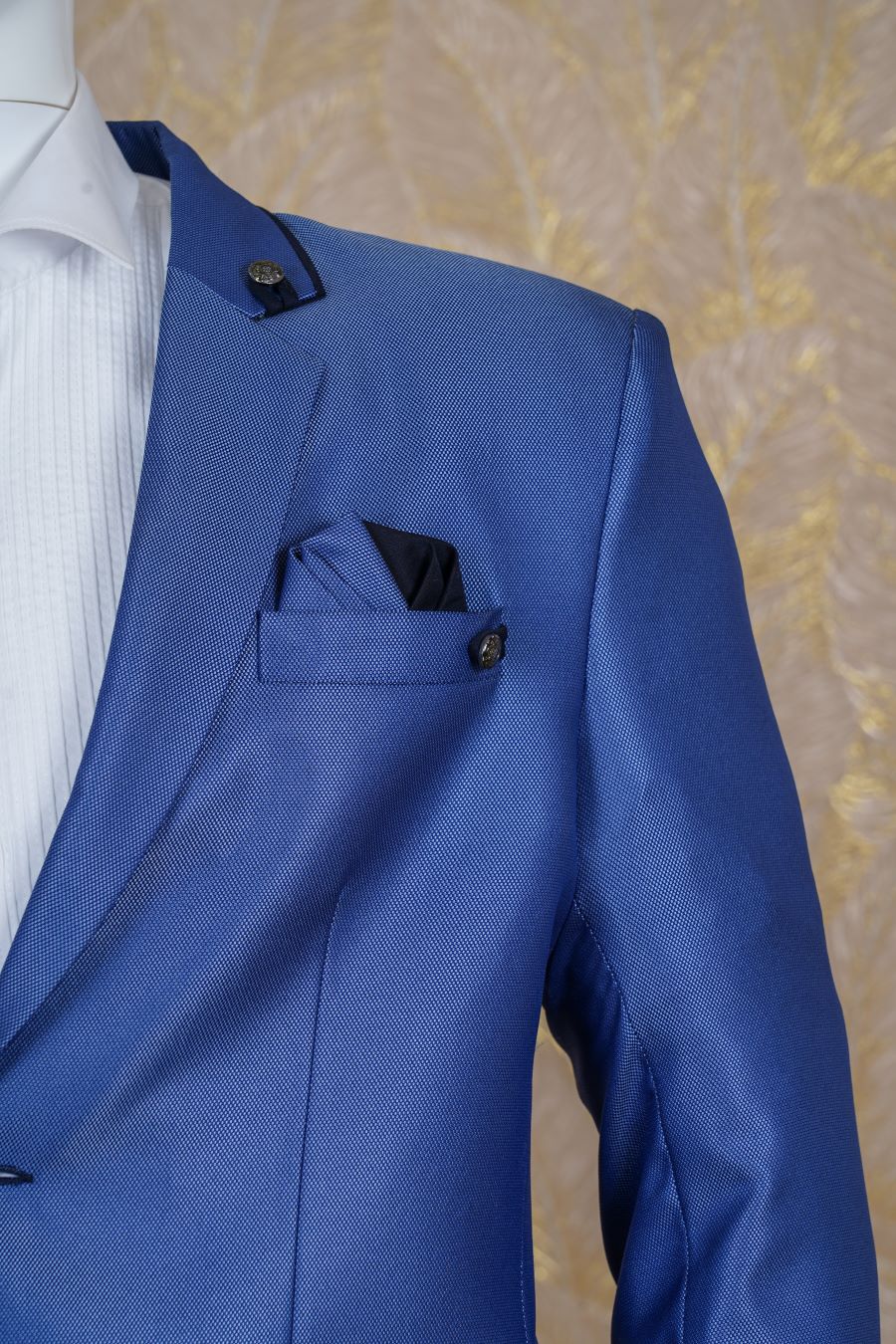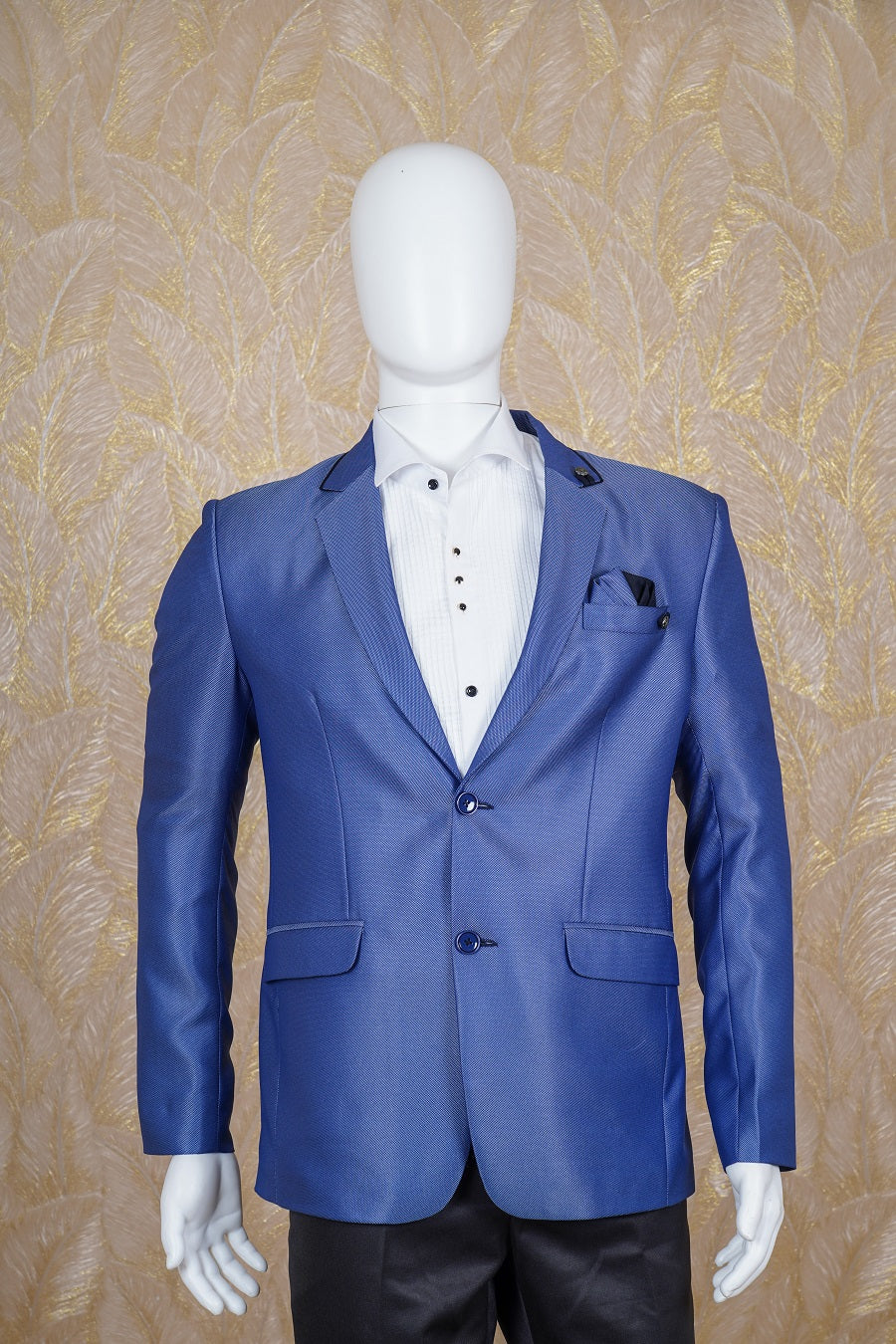 Blue formal slim fit suit blazer, Styled with a white shirt. Paired With trouser. Model is wearing size, “Medium”.