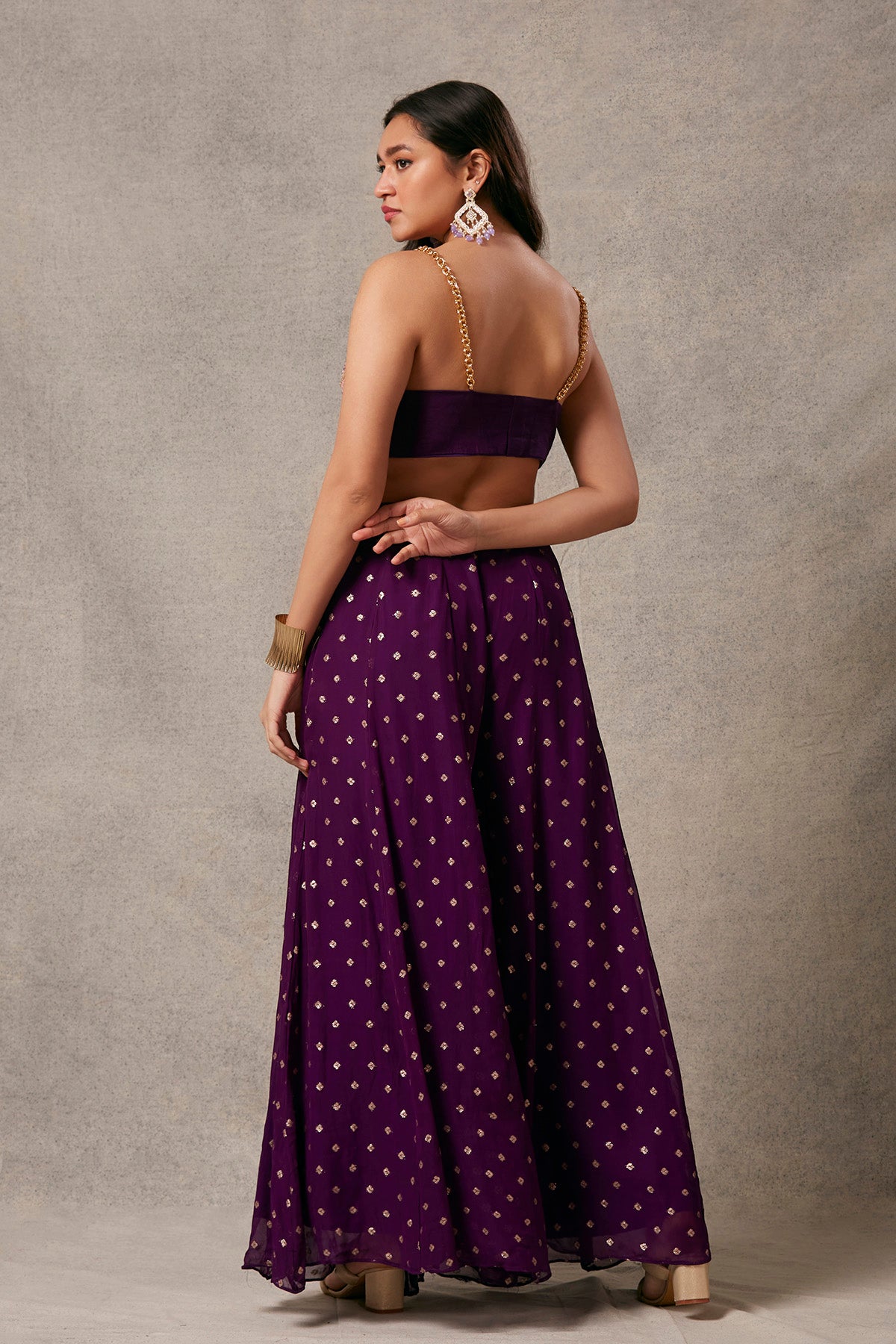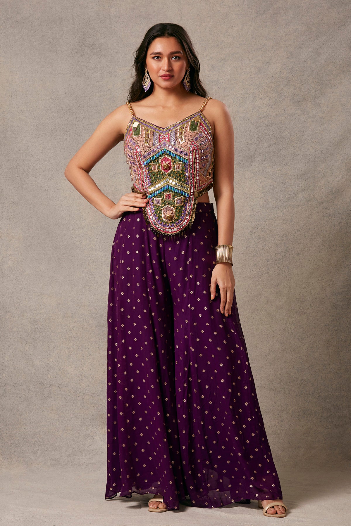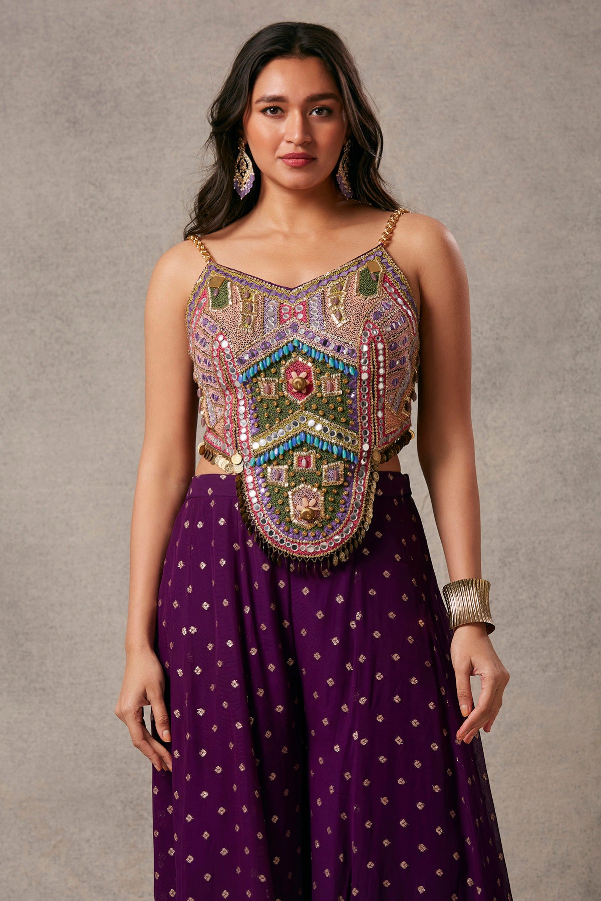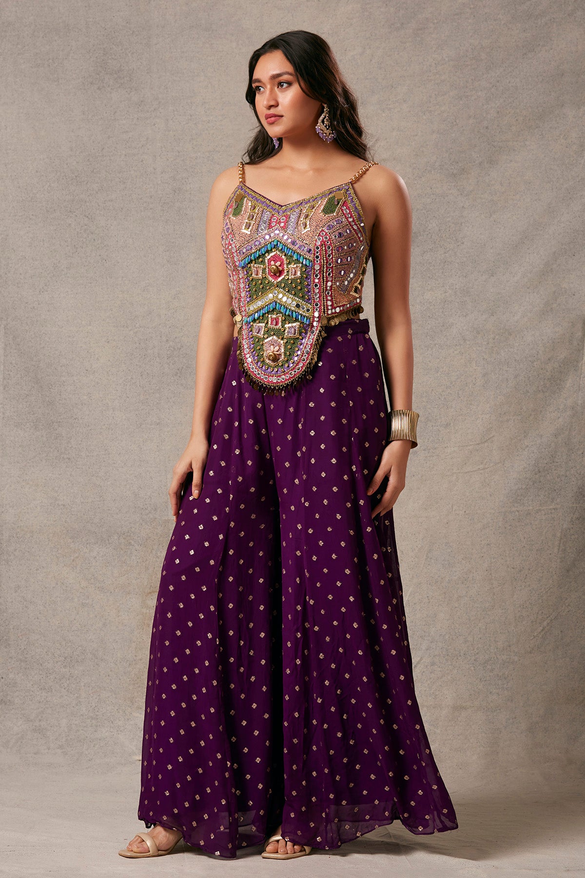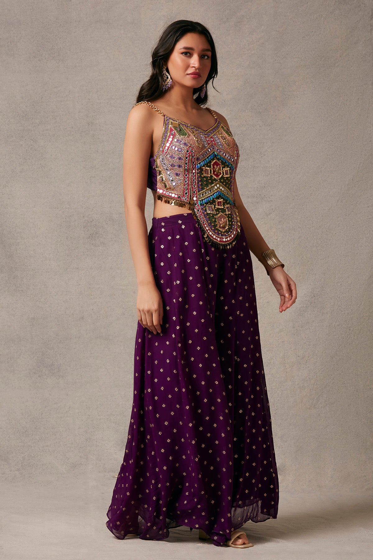 This stunning brocade and georgette trousers, complemented by tikli embroidered blouse, radiate a captivating elegance.