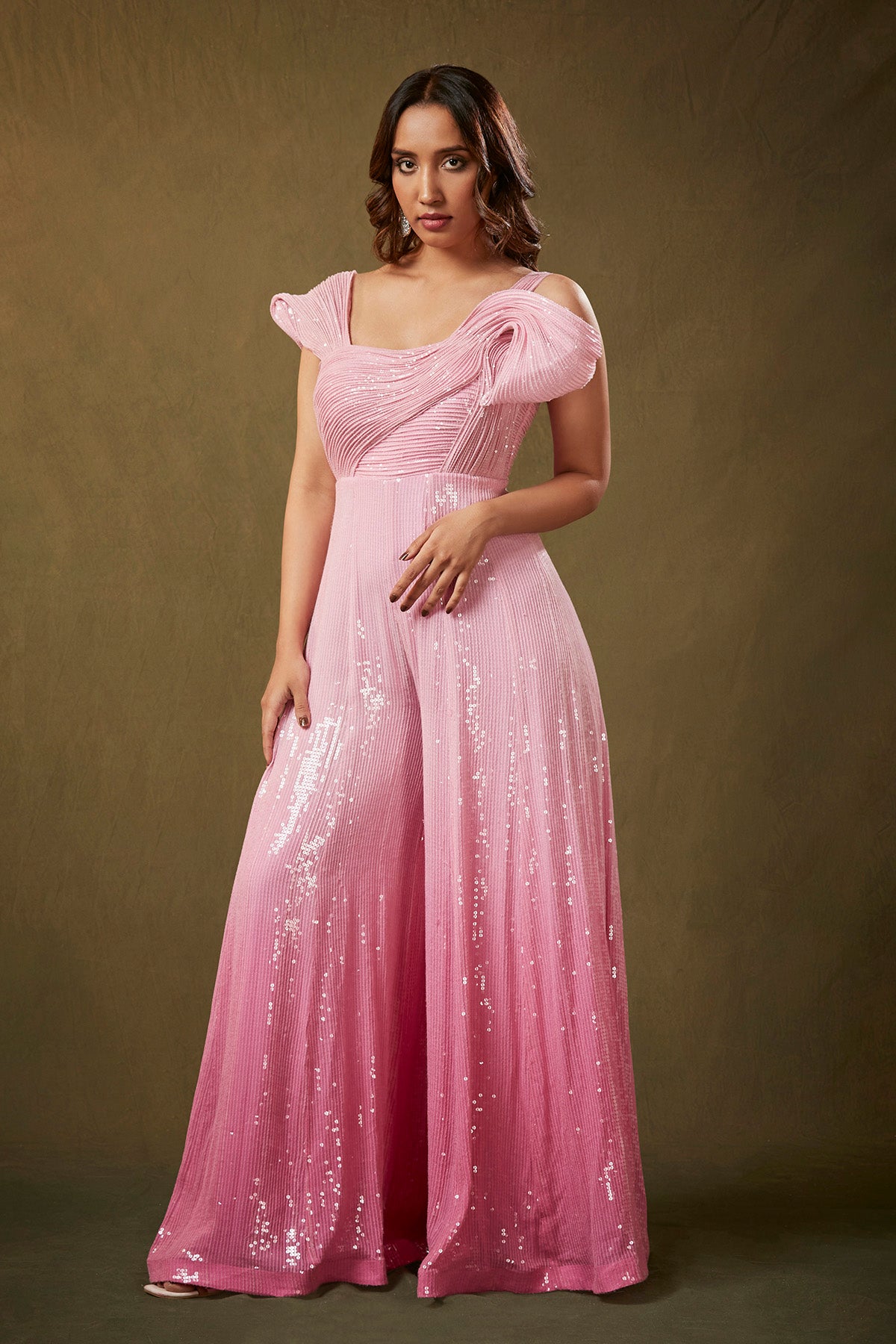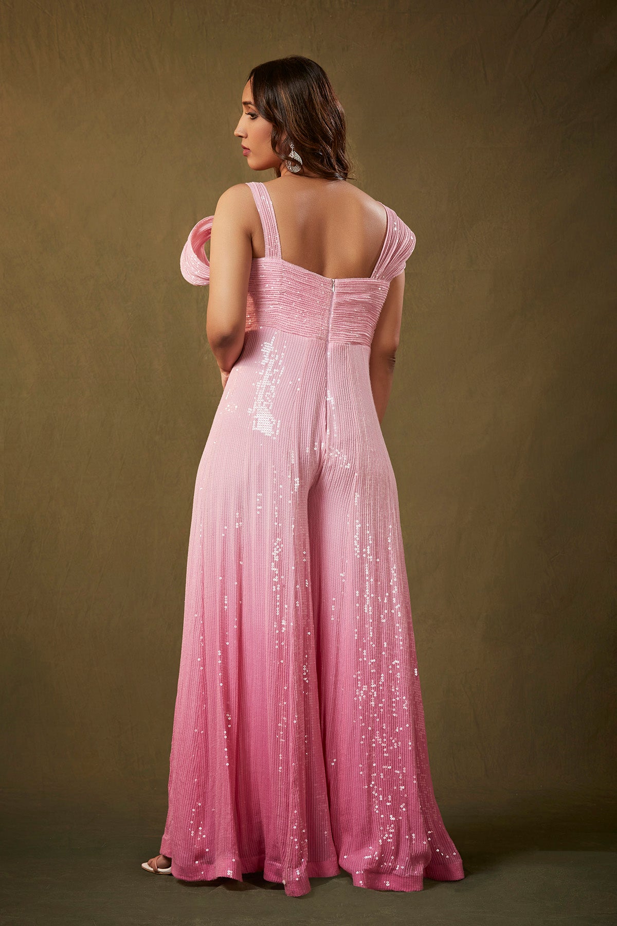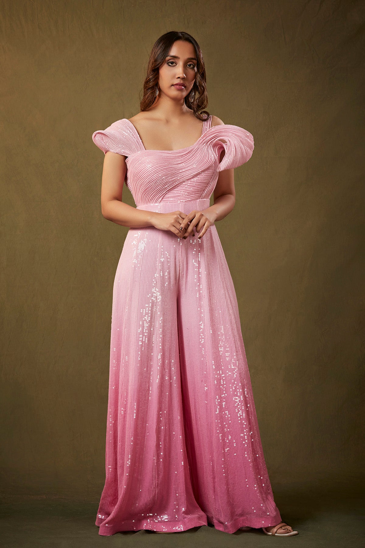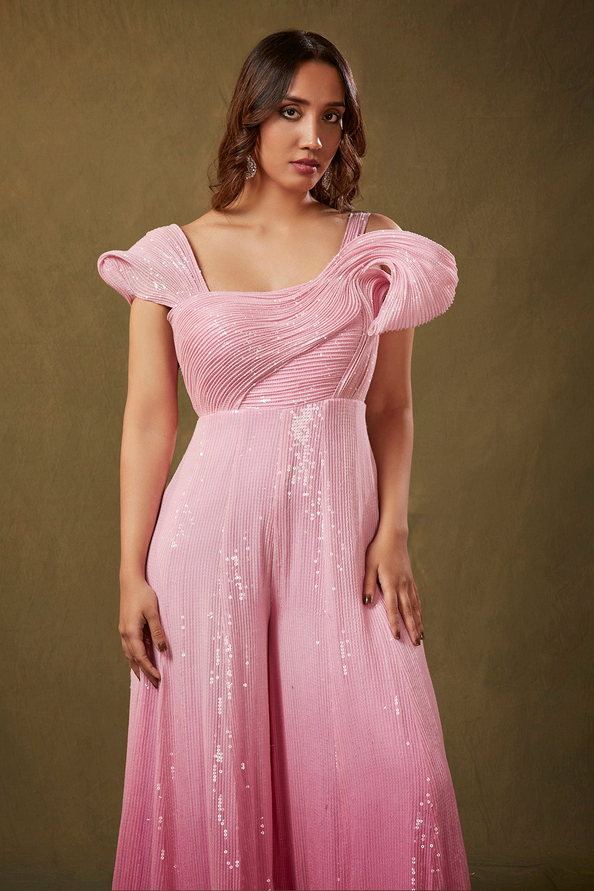 An intricately designed pink jumpsuit adorned with shimmering sequins, featuring exquisite shoulder detailing.