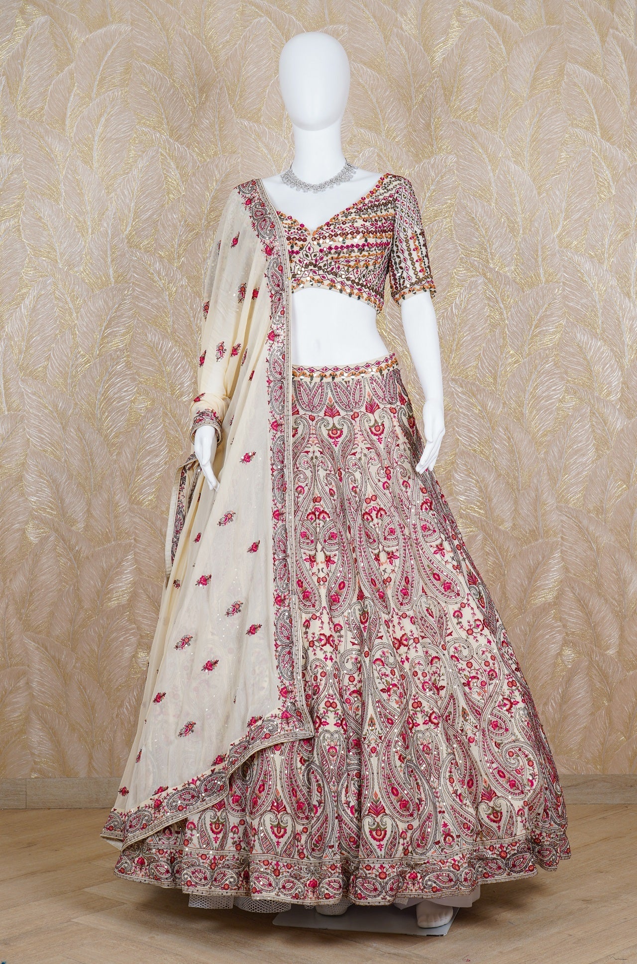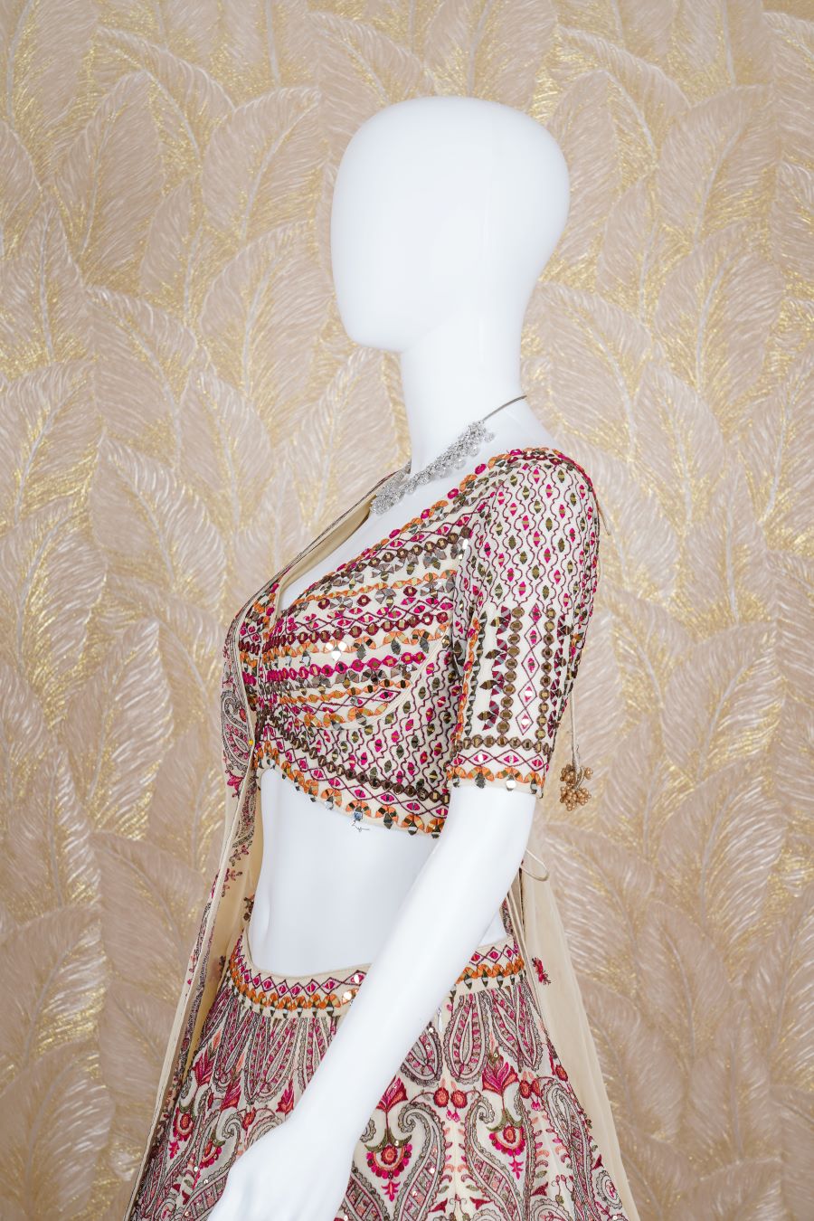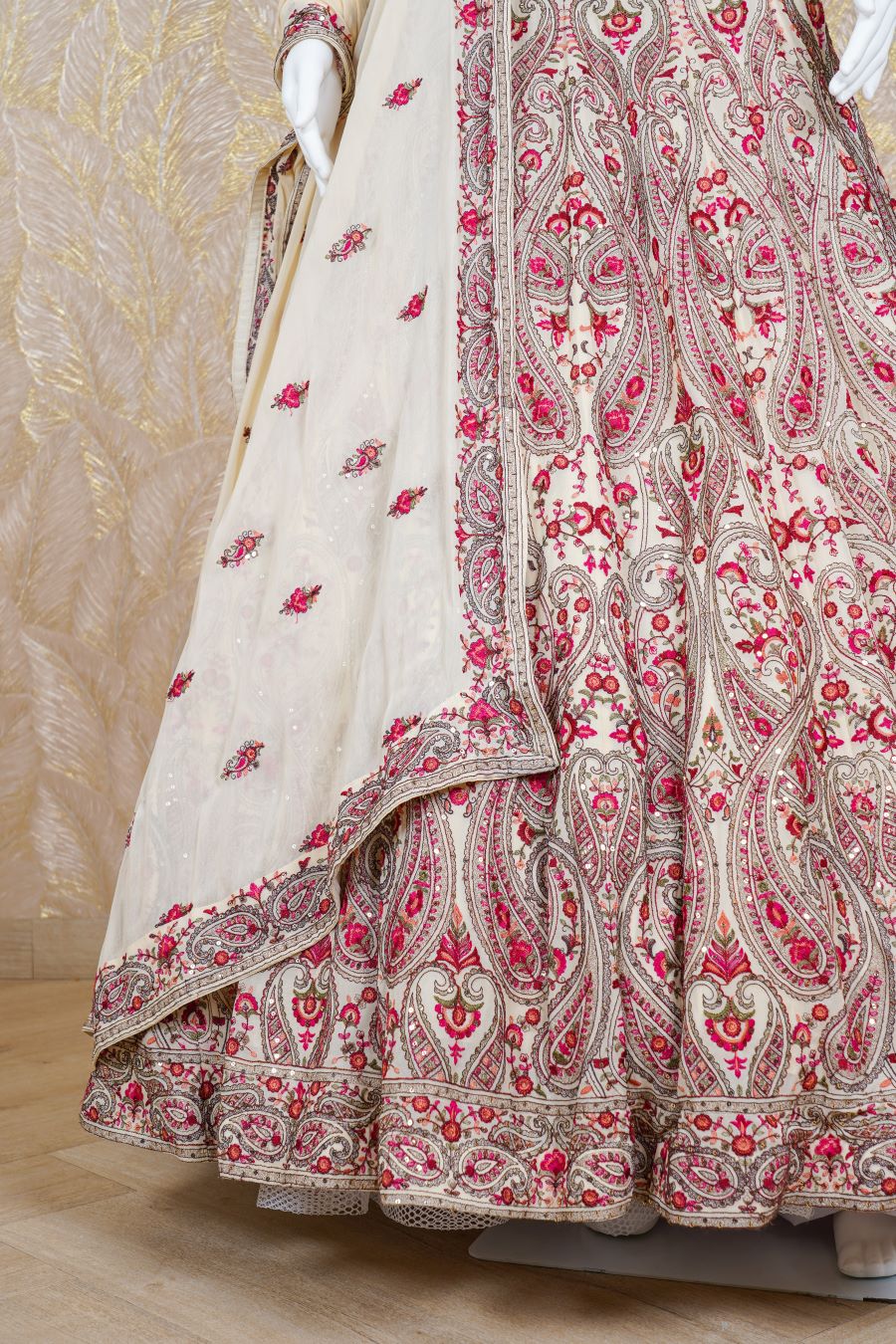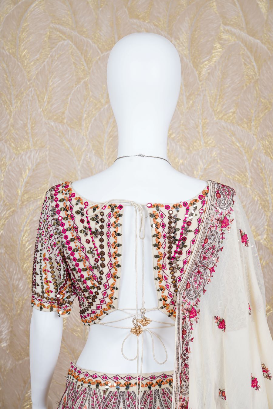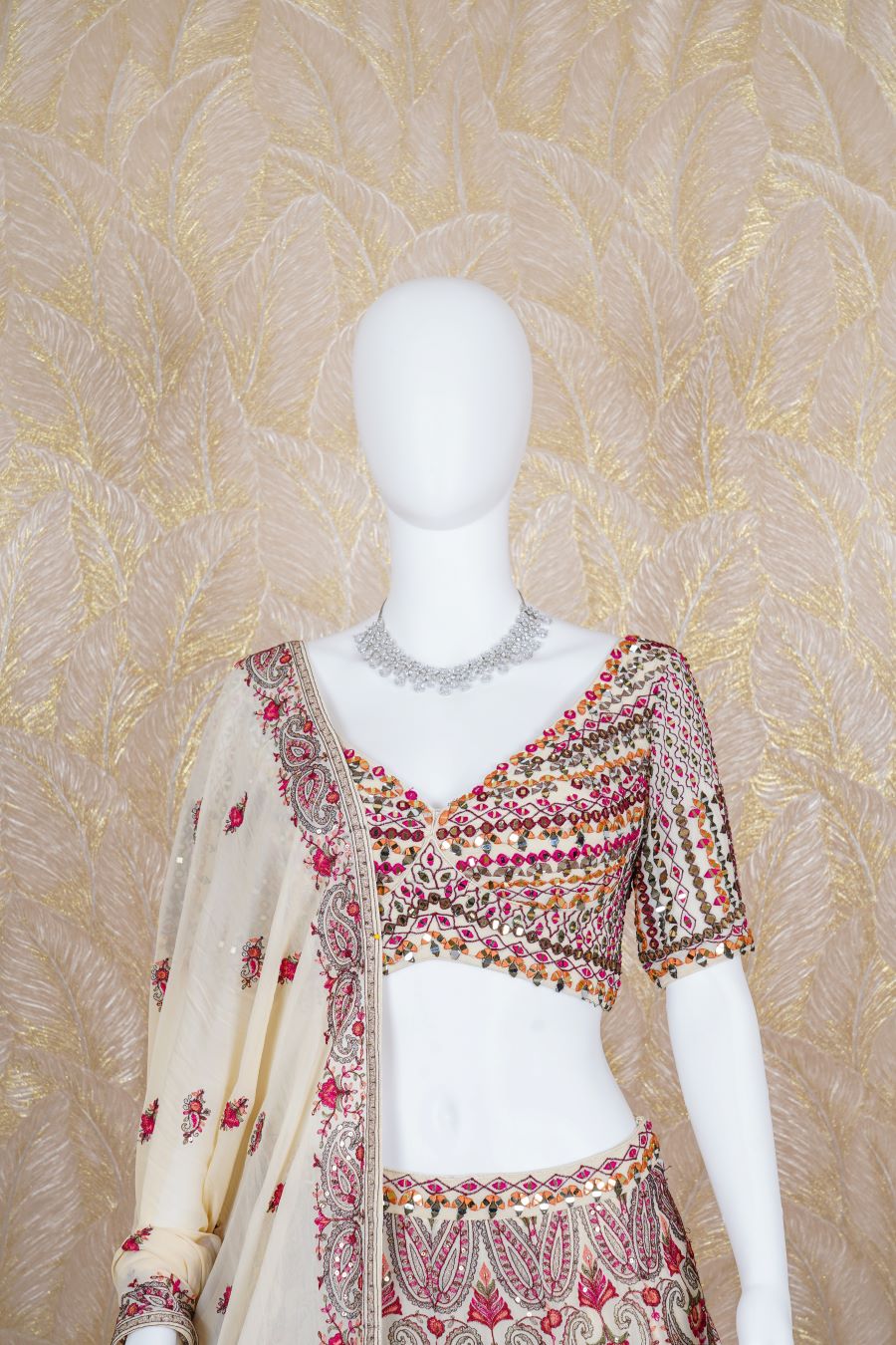 Cream Based Georgette Lehenga adorned with kashmiri machine thread embroidery, paired with a matching mirror and resham embroidered handcrafted blouse. The lehenga is styled with bordered dupatta. Model is wearing size, “Medium”.
