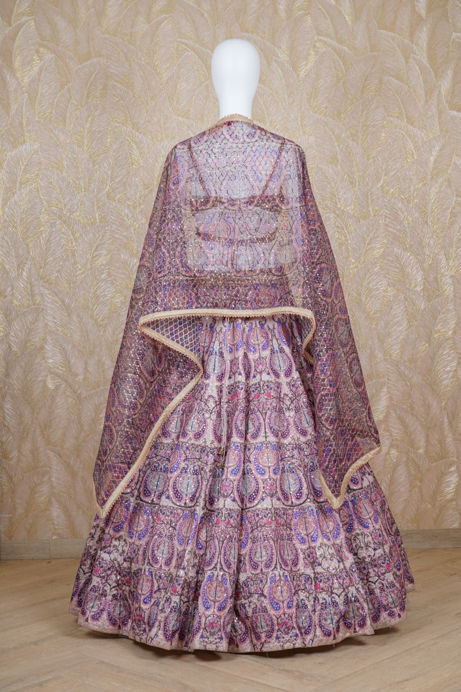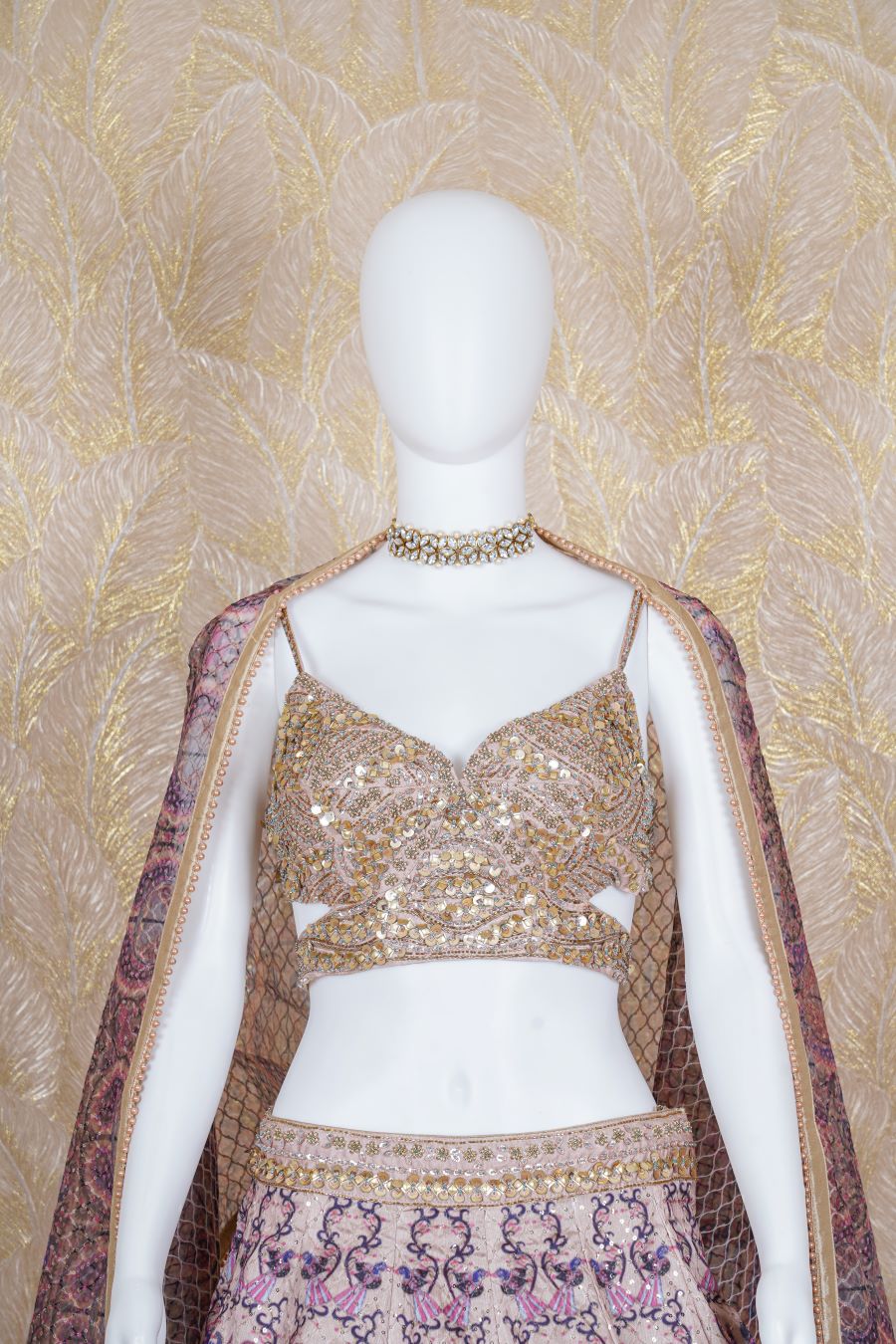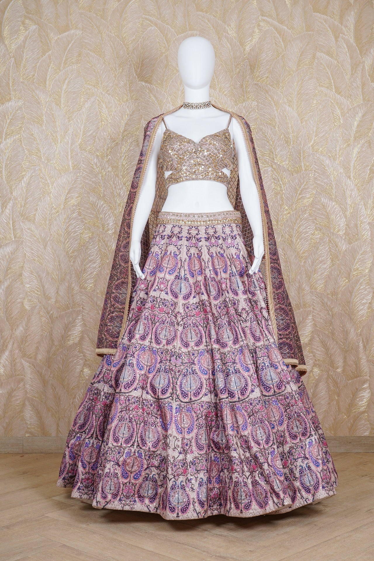 Gold-Cream Based Slub Silk Multi Color Lehenga printed with sequins and thread embroidered work. The lehenga is styled with a sequins, kardana and pearls handcrafted blouse and printed bordered dupatta. Model is wearing size, “Medium”.