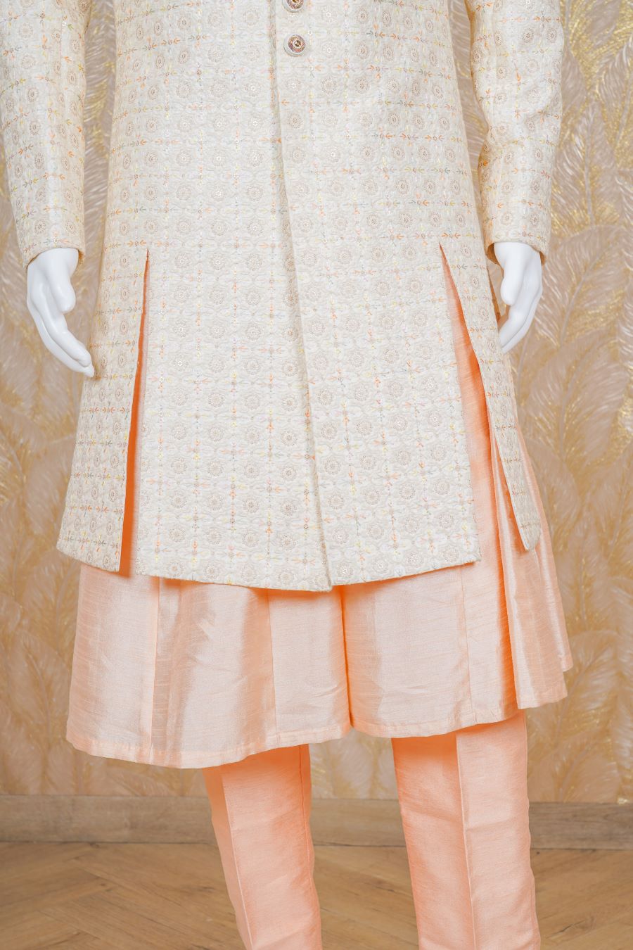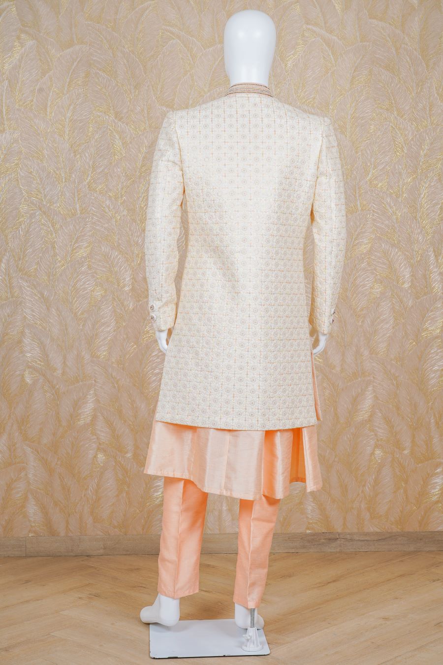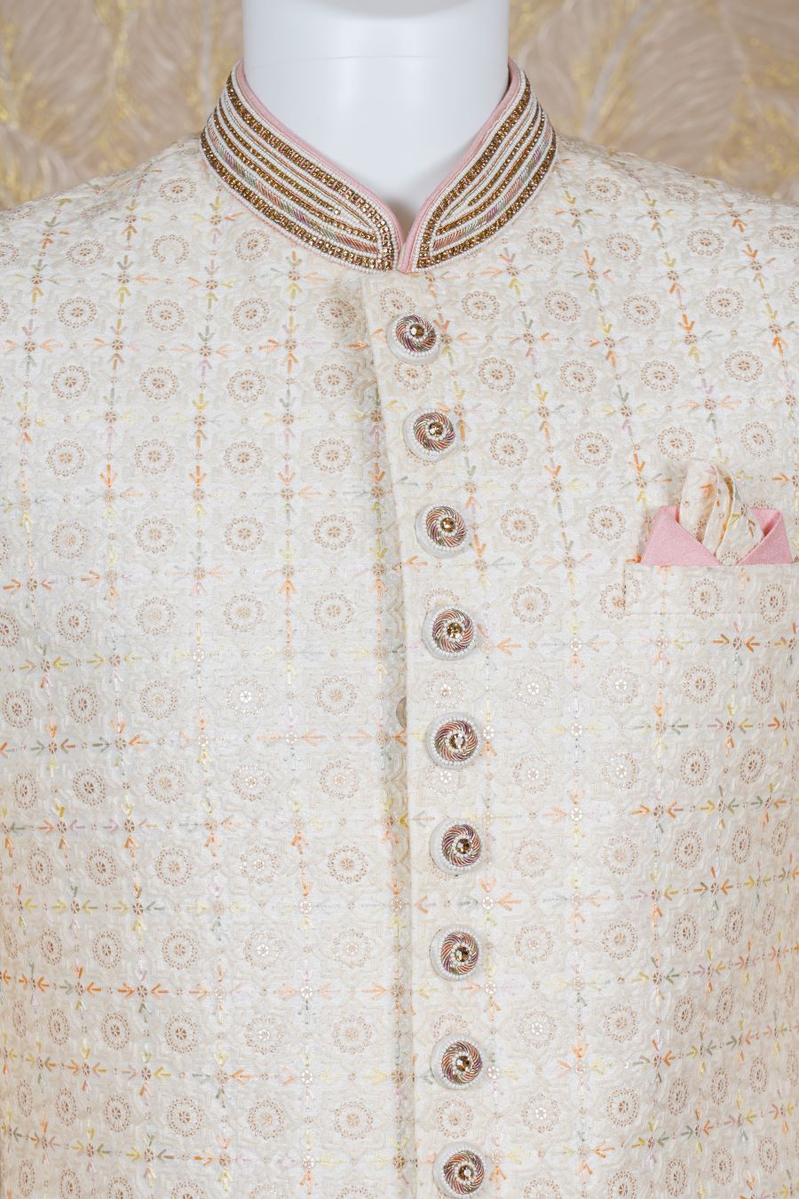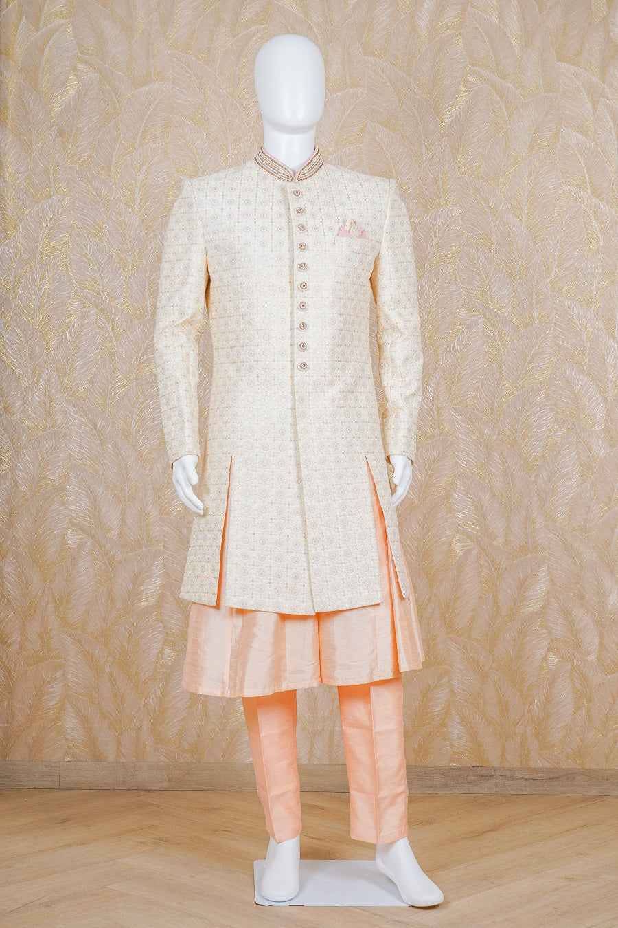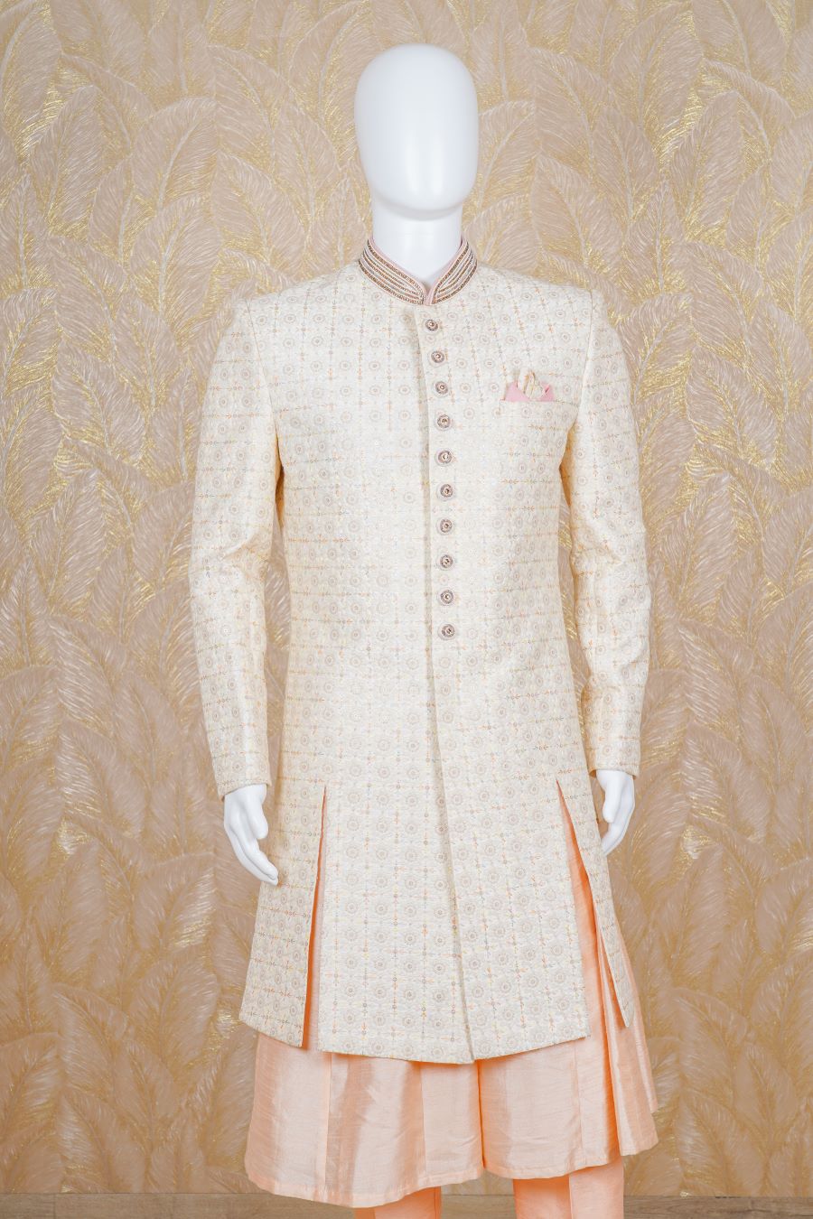 Cream sherwani, Showcasing a pearls and zari embroidered. Paired with a kurta, trouser and stole.