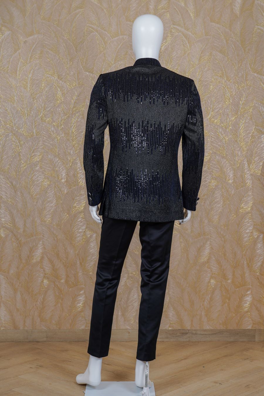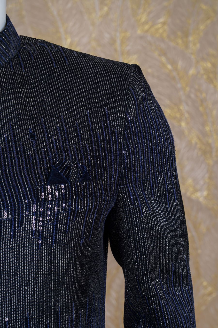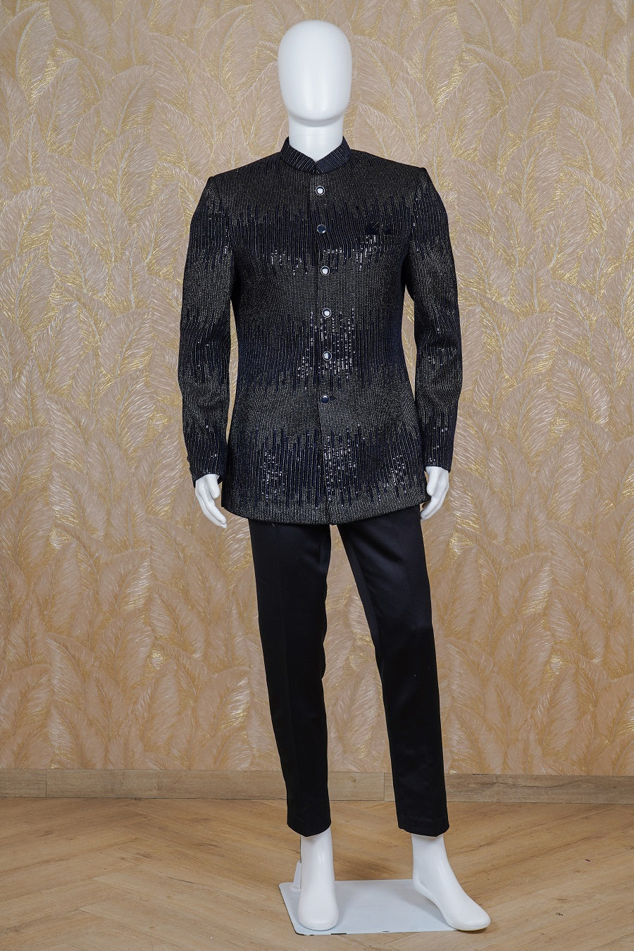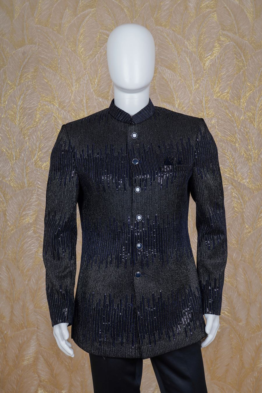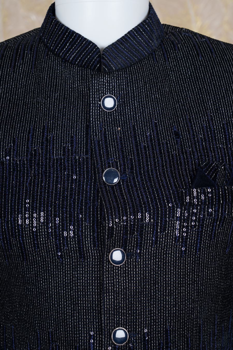 Dark Blue Jodhpuri additional embellishments of sequins embroidered, Paired with a pants. This is a two piece look. Model is wearing size, “Medium”.