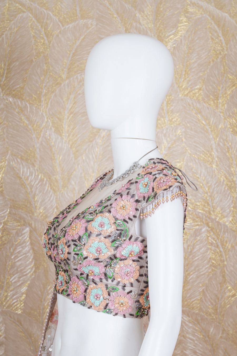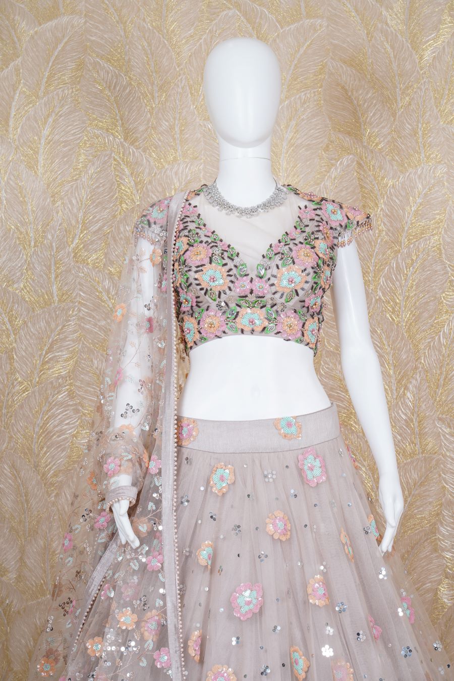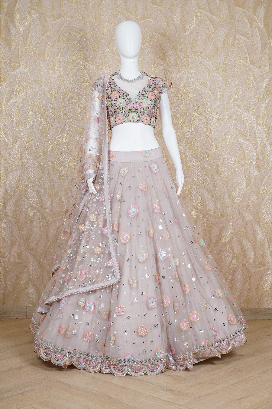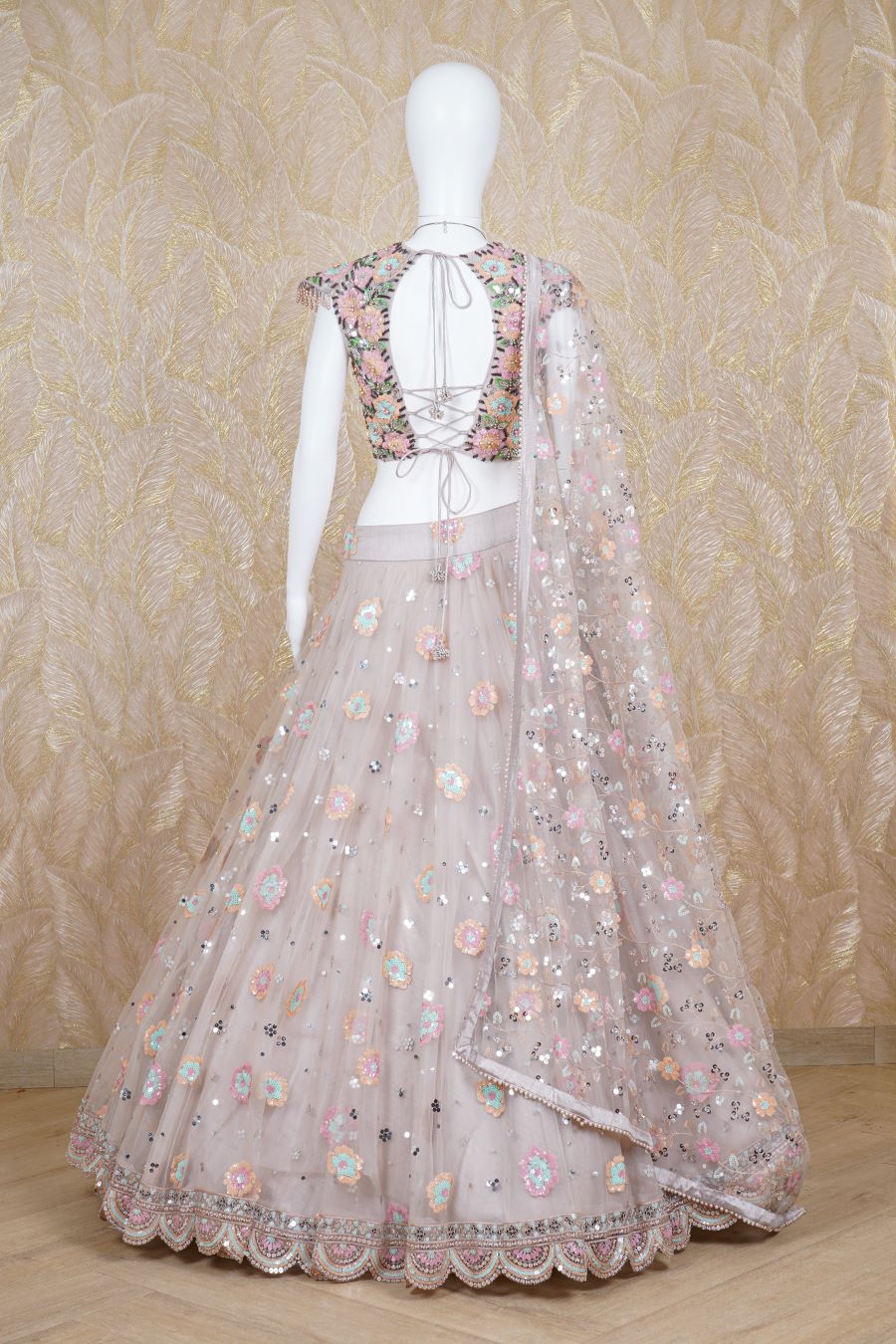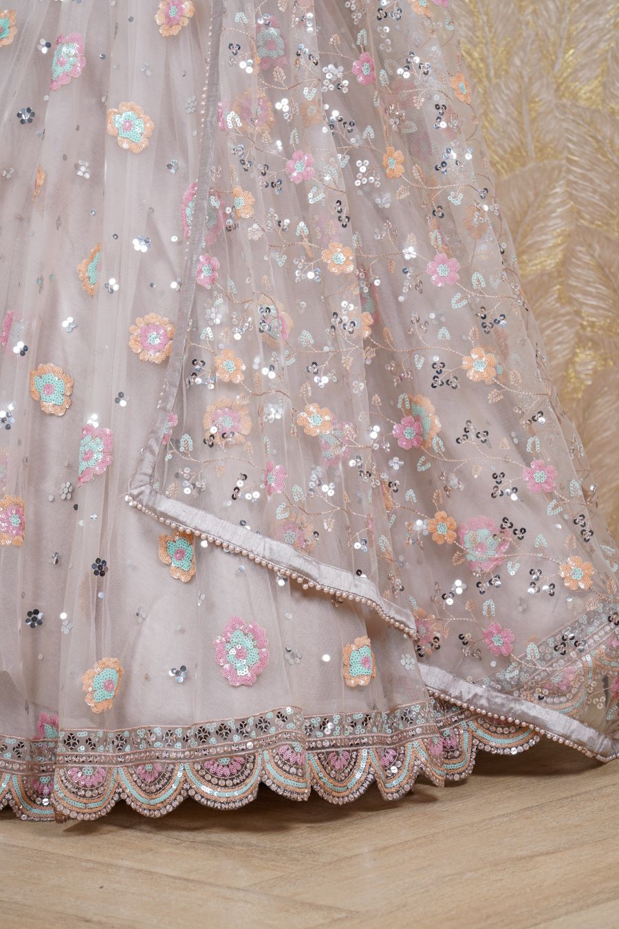 Dusty Pink Tulle lehenga with additional embellishments of sequins, salli and pearls work with matching work blouse and bordered work dupatta. Model is wearing size, “Medium”.