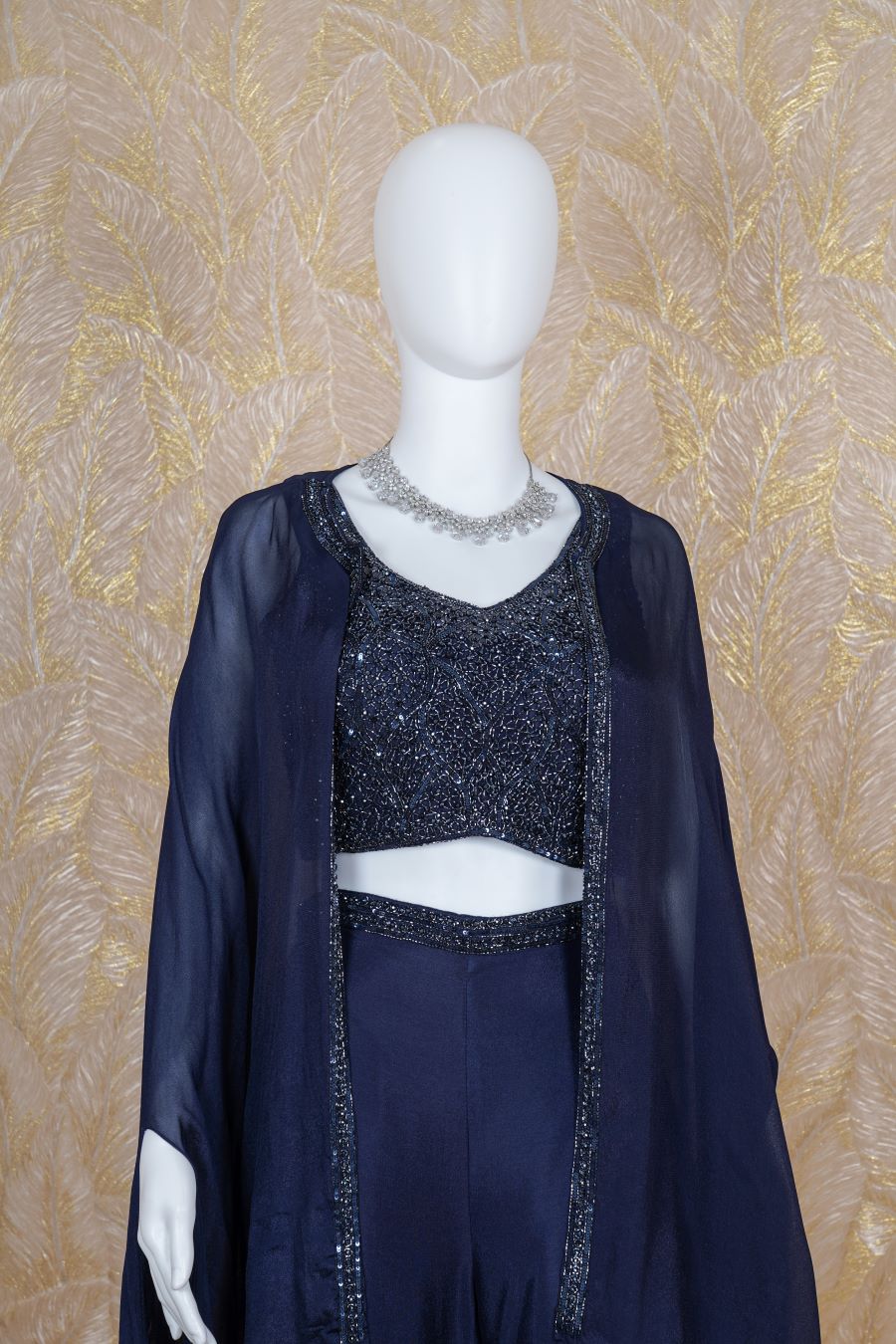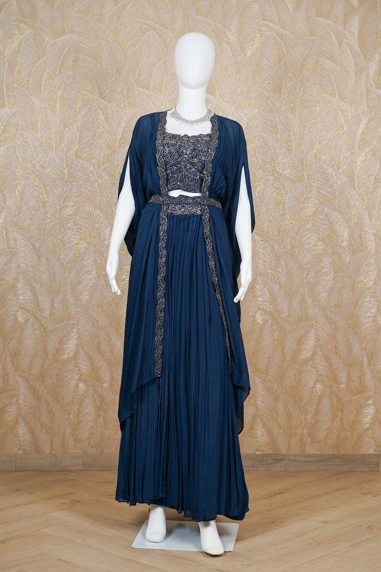 Peacock Blue Rawsilk embellished with sequins and kardana embroidered crop top. Comes with an embroidered bordered cape and belt, Styled with a skirt. Model is wearing size, “Medium”.