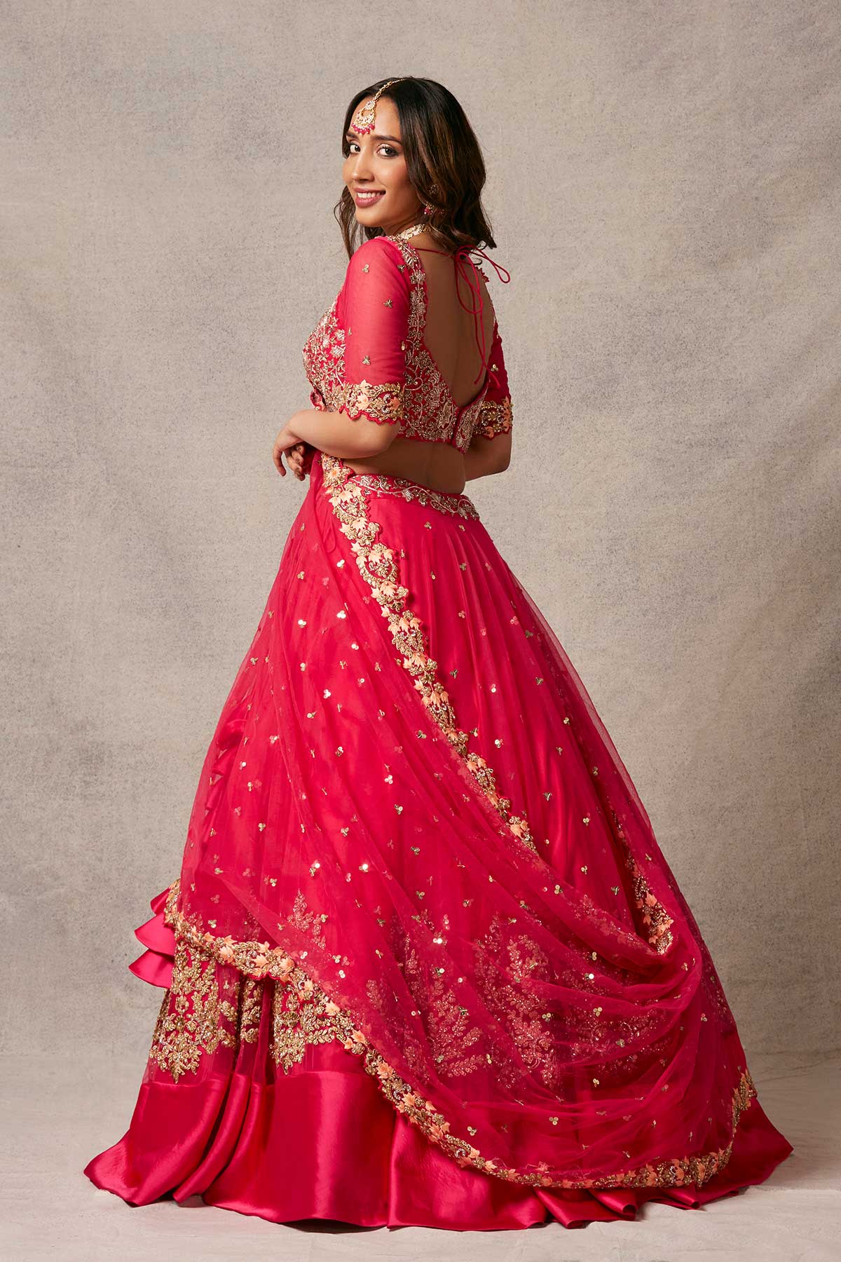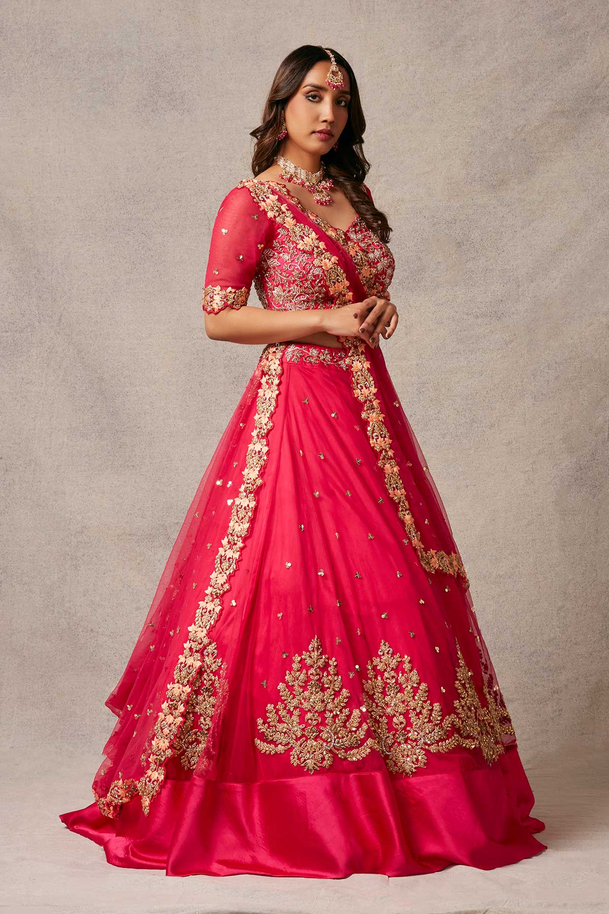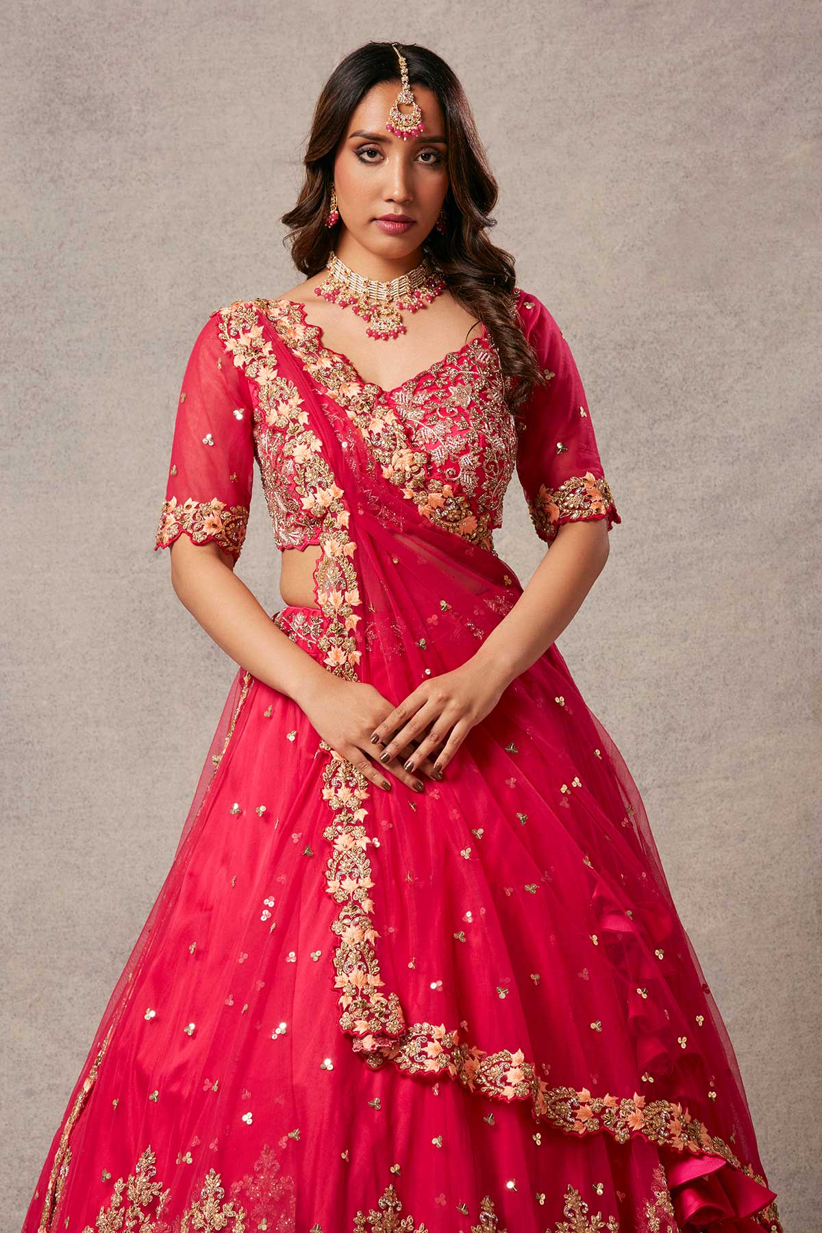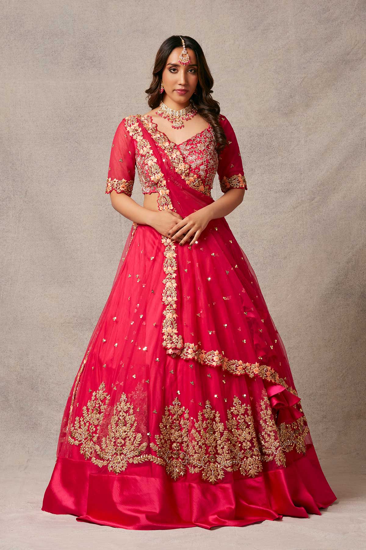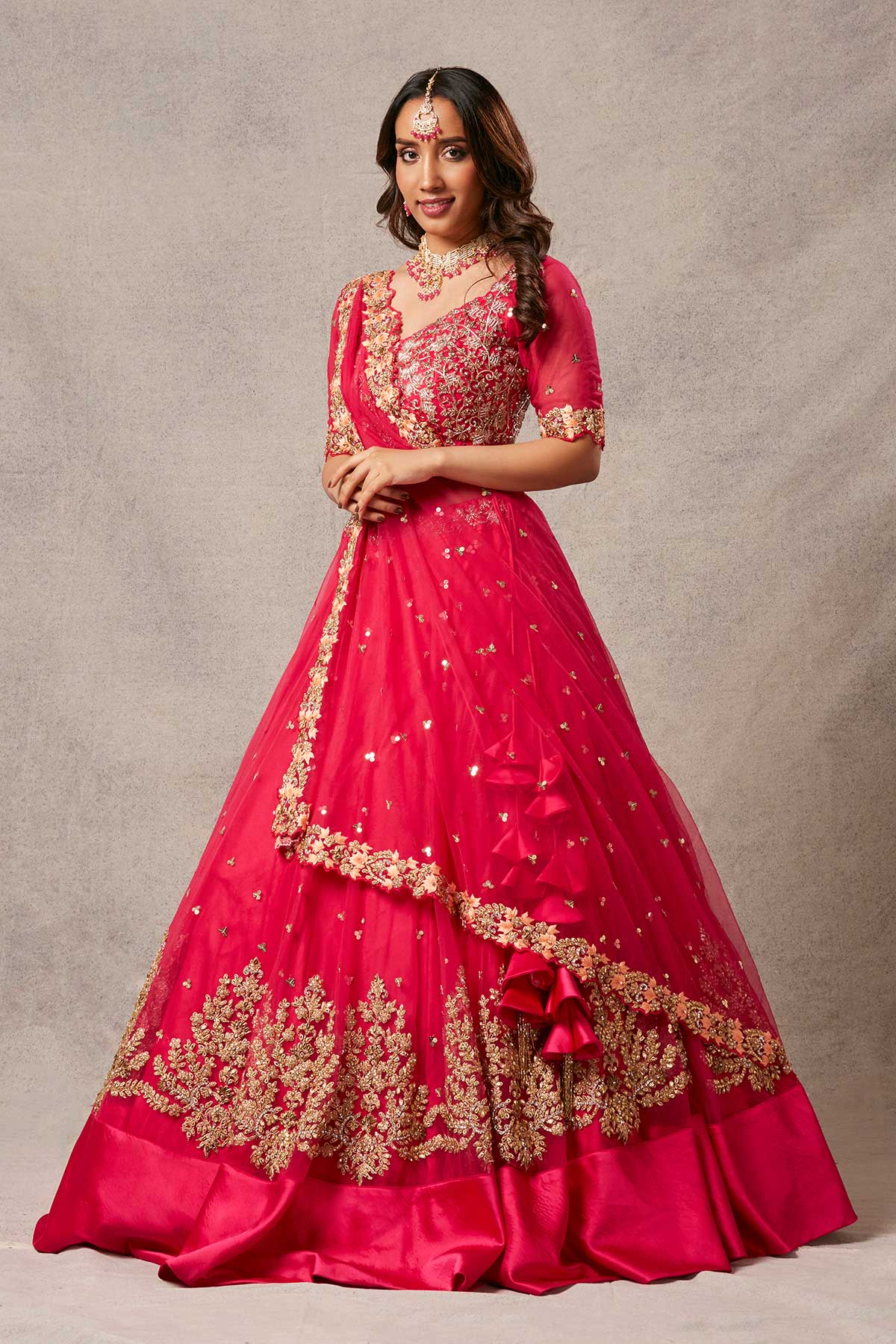 A breathtaking pink lehenga adorned with gold embellishments and intricate embroidery on both the blouse and the lehenga, complemented by a stunning net dupatta.