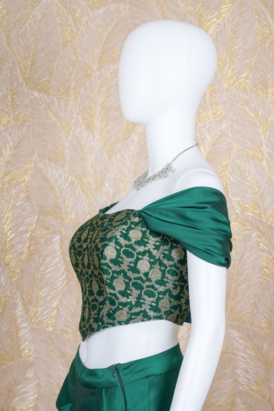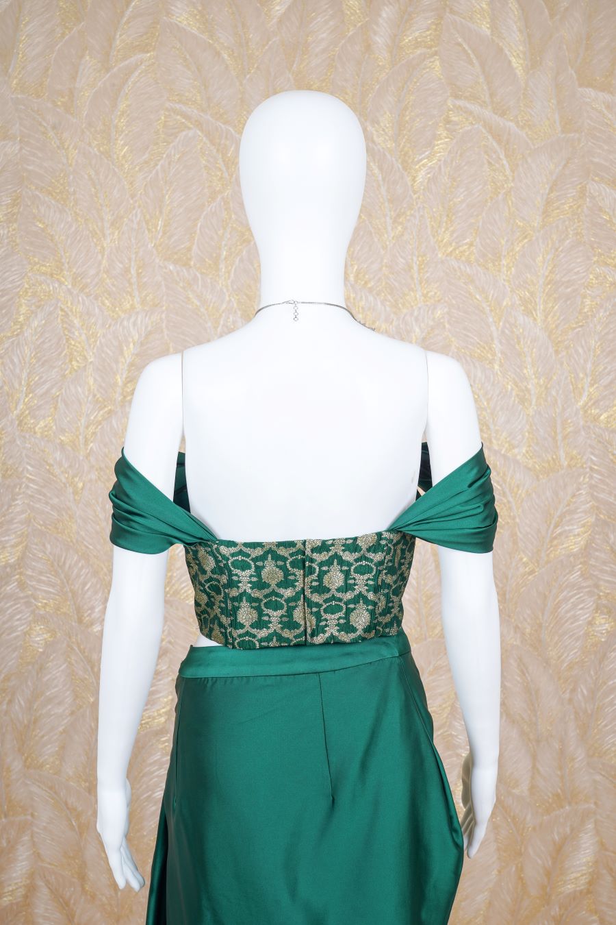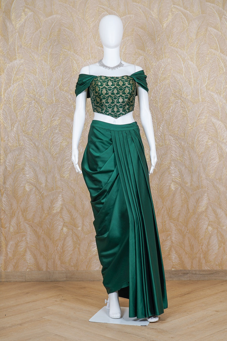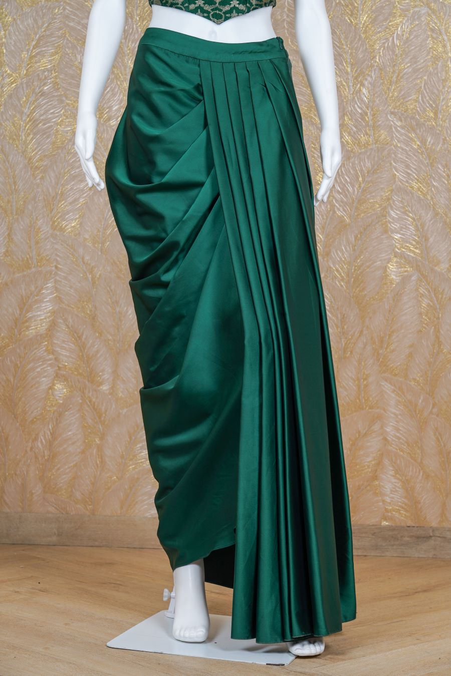 Drape Skirt Set comes with green satin, cowl sleeve banarasi brocade corset, adding to its charm. Model is wearing size, “Medium”.
