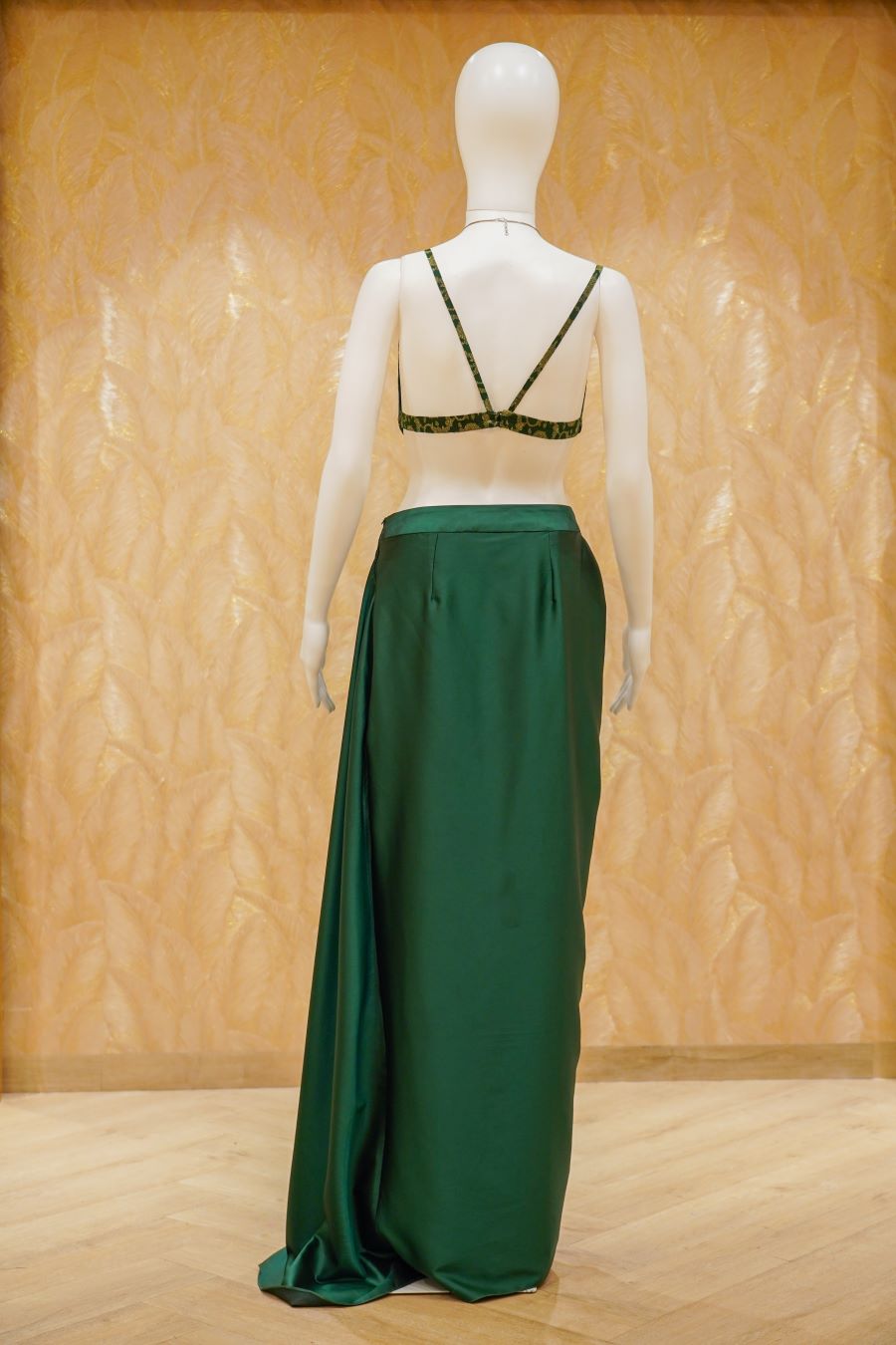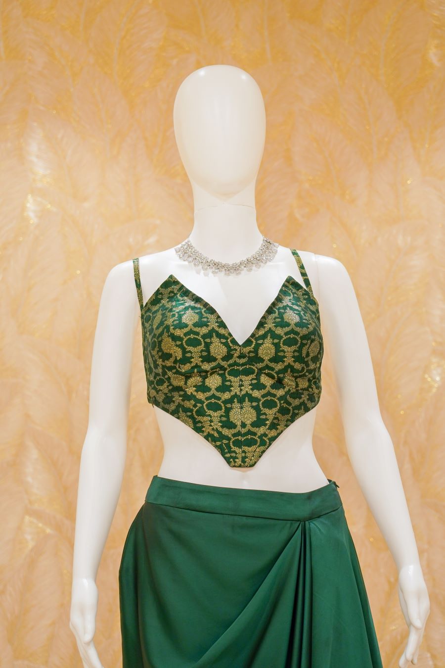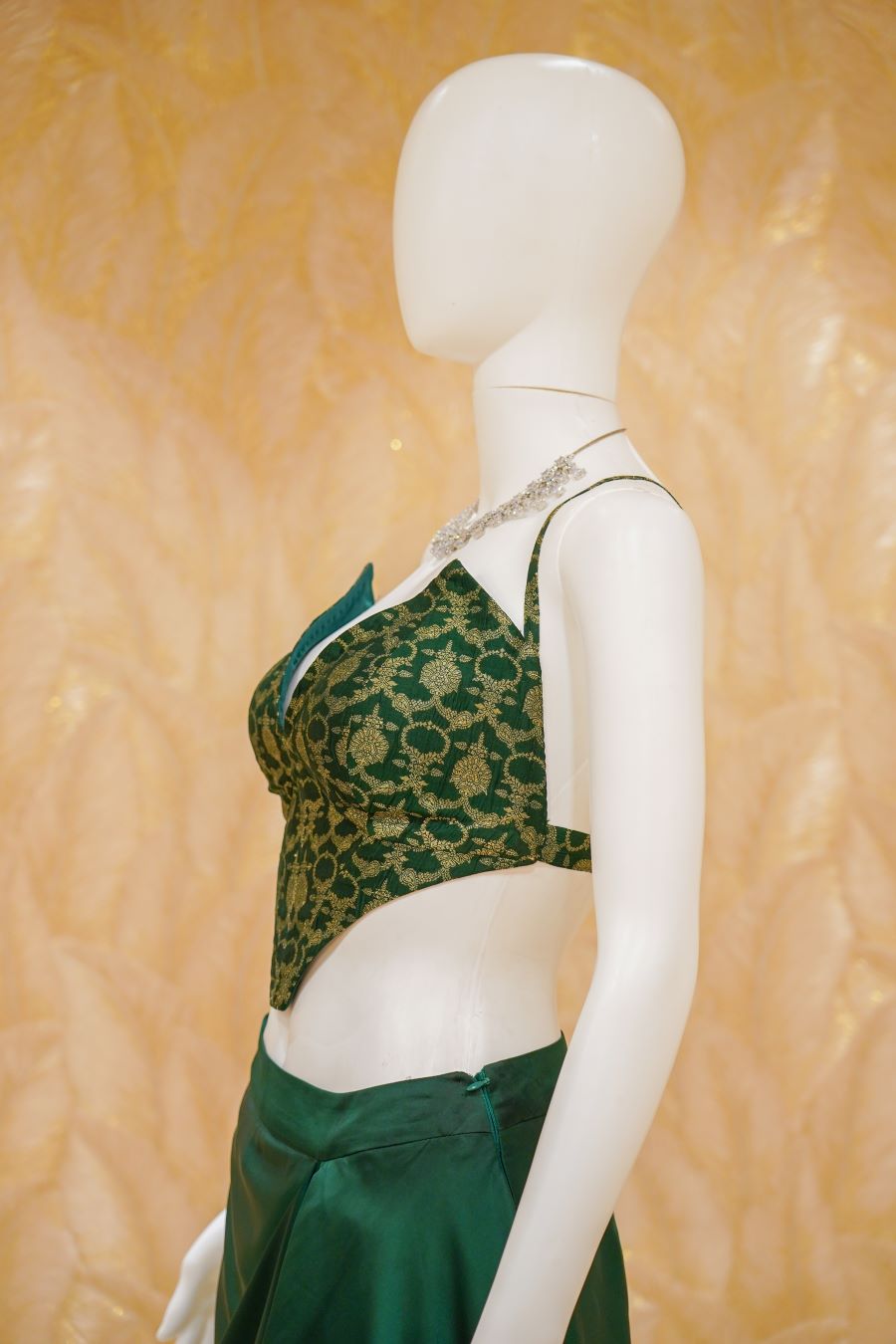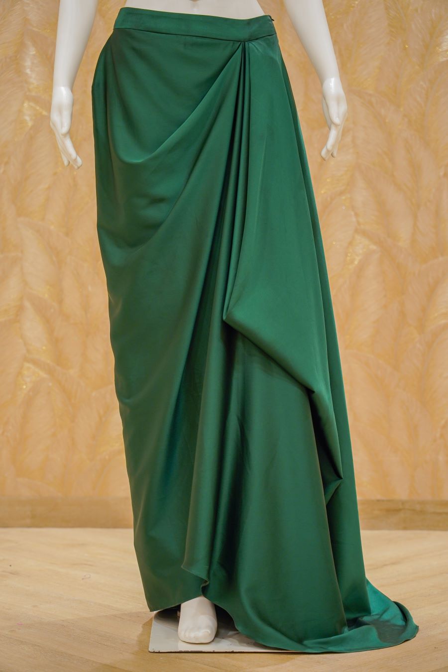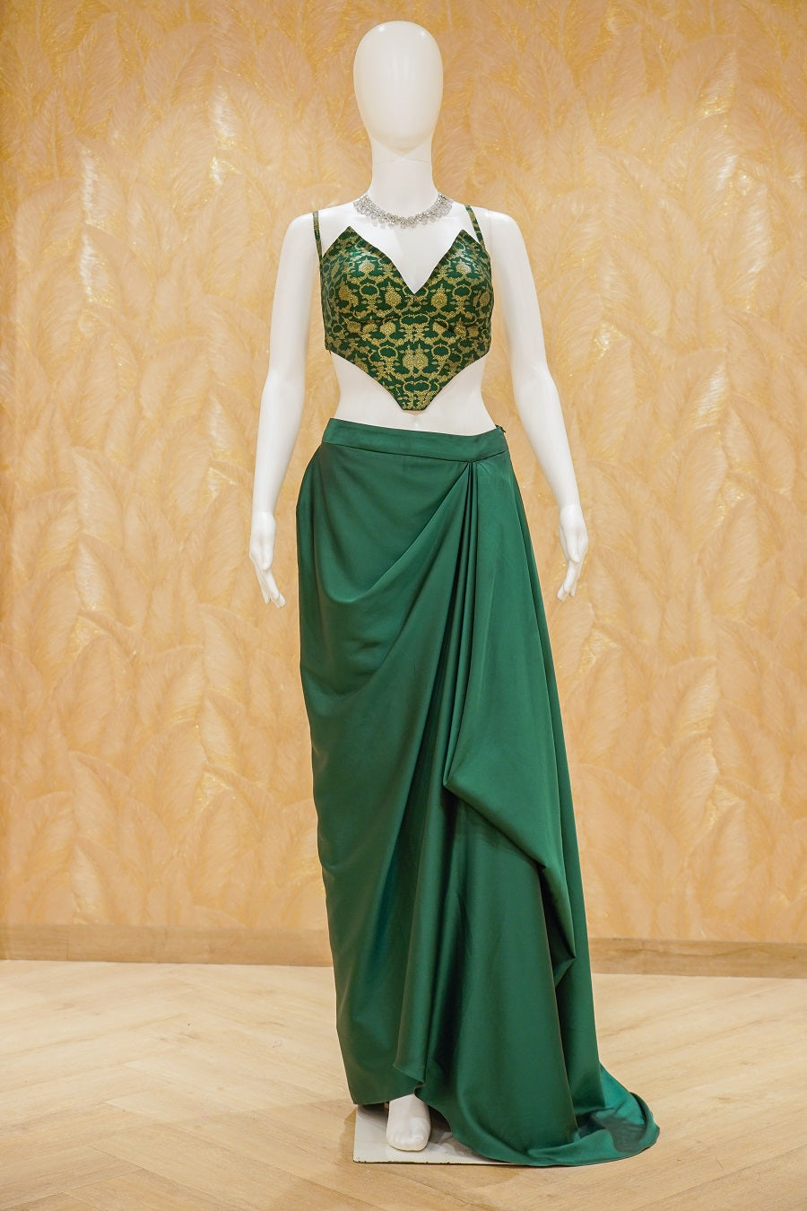 Drape skirt set comes with green satin, banarasi brocade with a spicy cuts corset, adding to its charm. Model is wearing size, “Medium”.