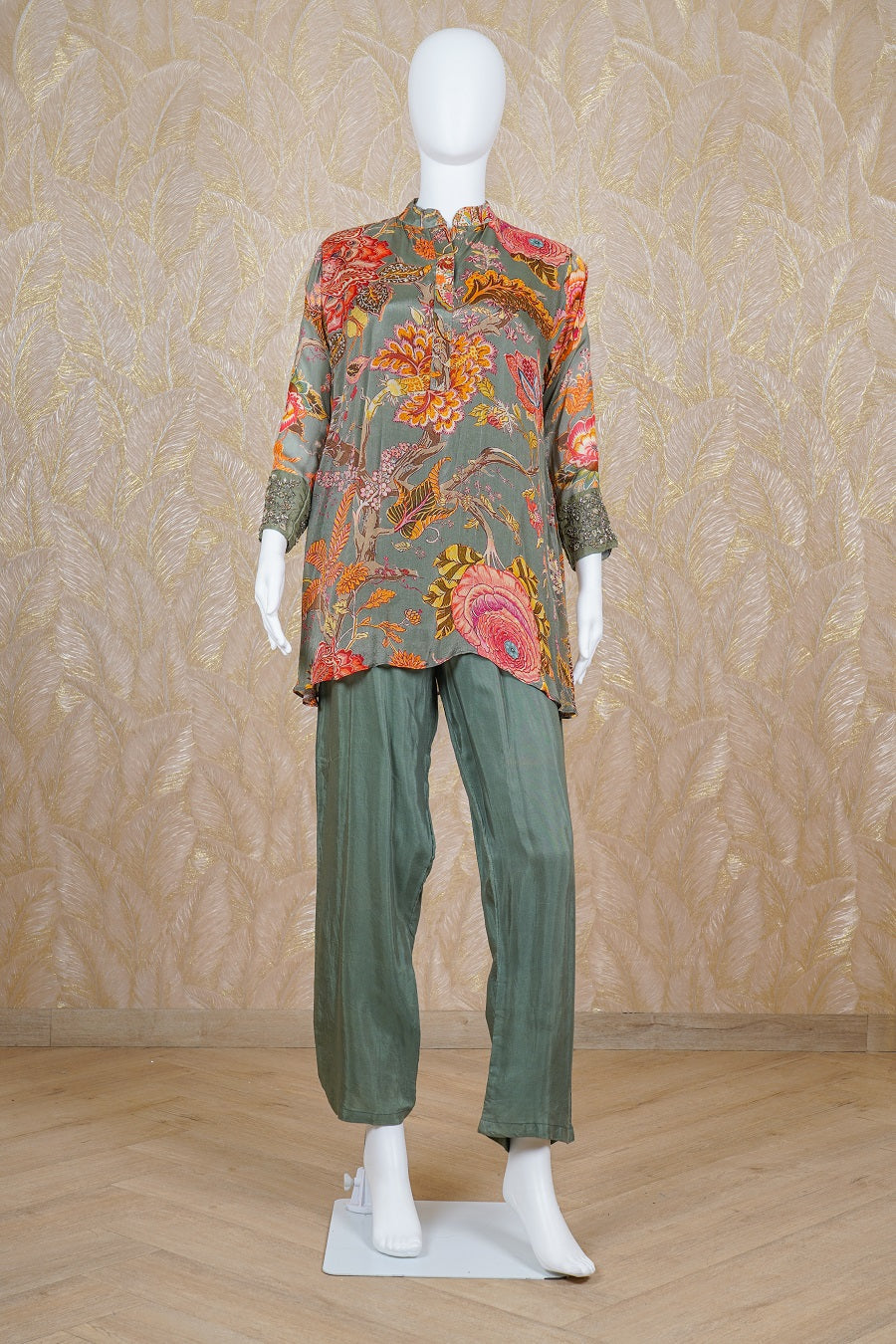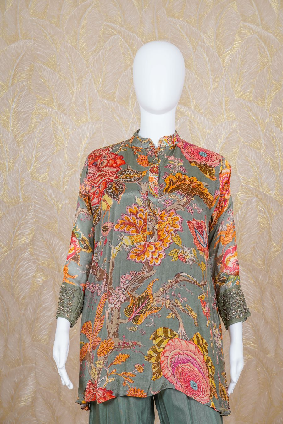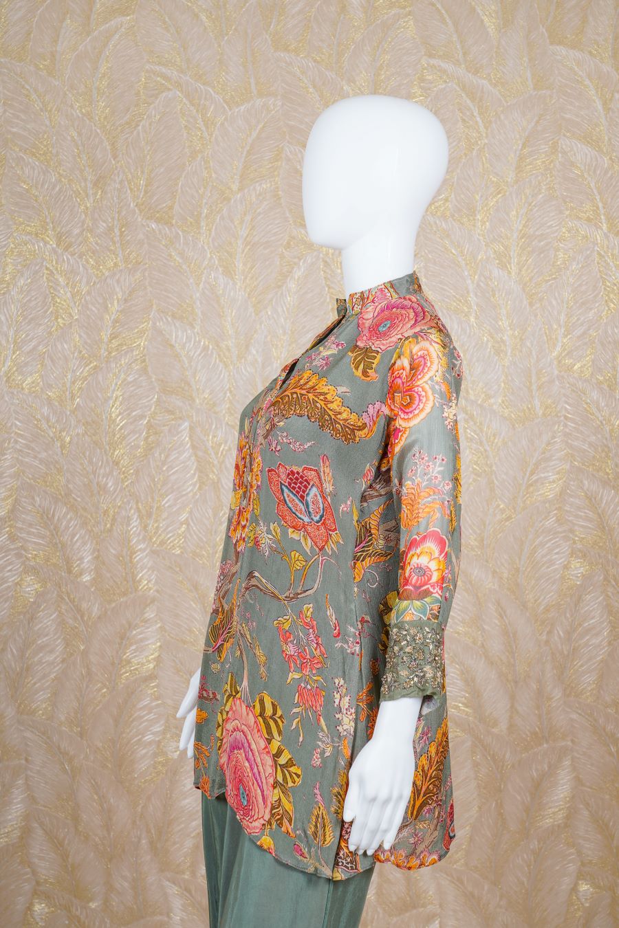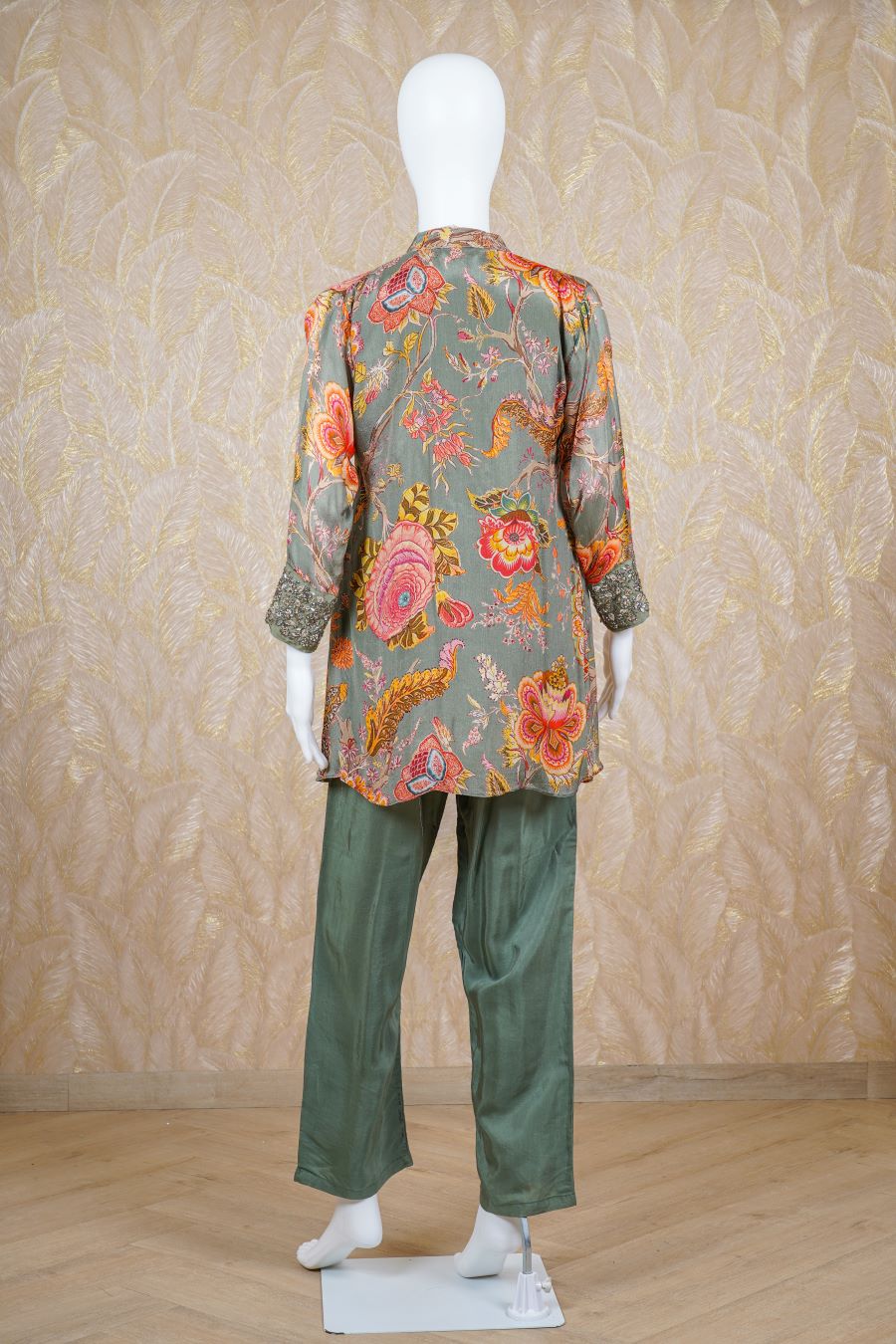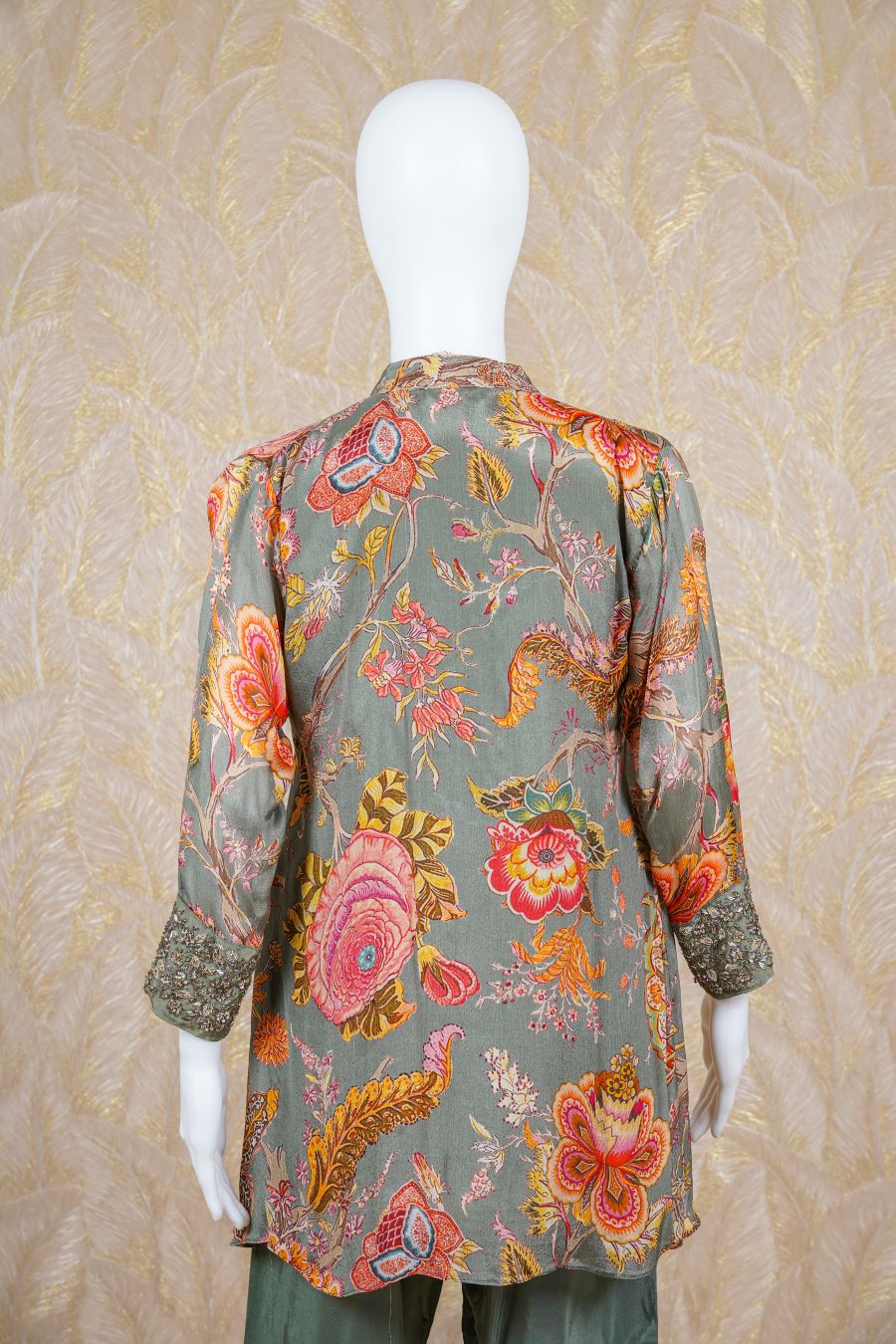 Green printed long sleeves kurta finished with sequins, zardosi, kardana and beads embroidered. Styled with pants. Model is wearing size, “Medium”.