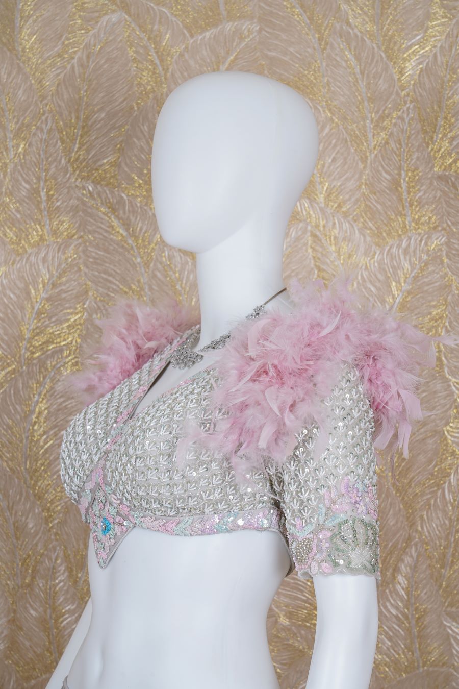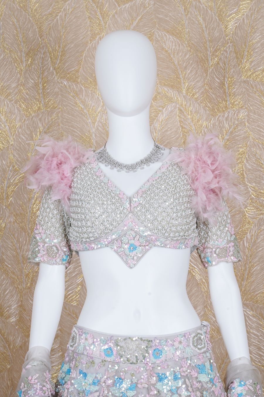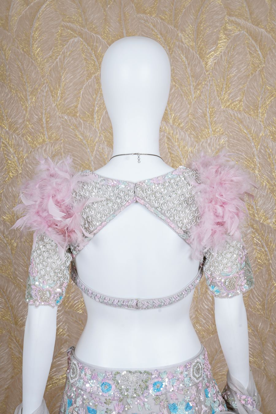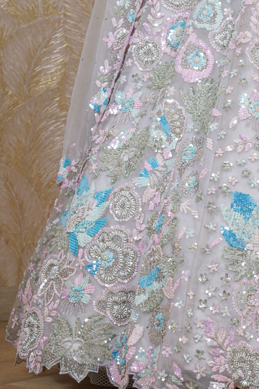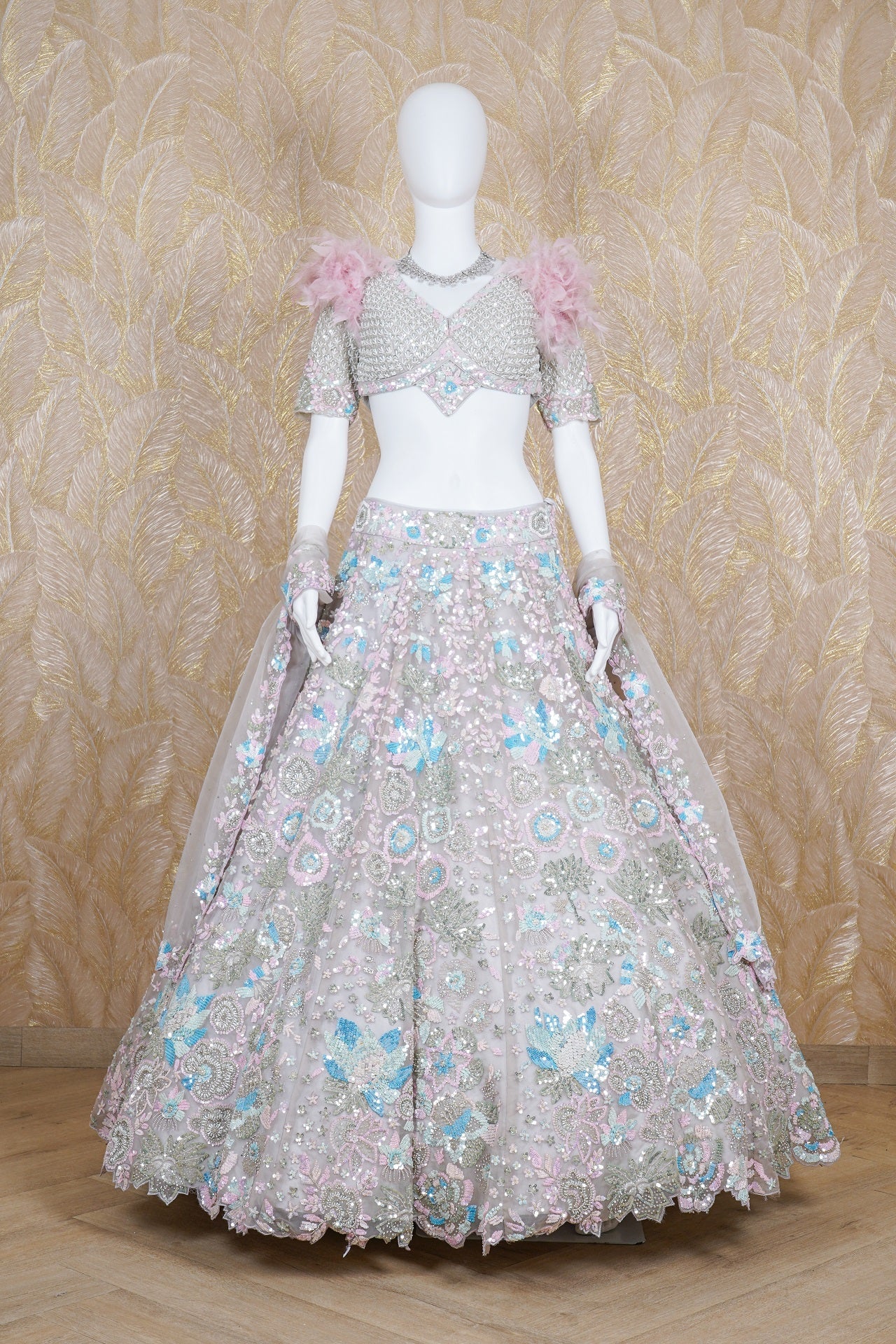 Grey Tulle Lehenga with additional embellishments of sequins, kardana, beads and pearls work matching embroidered blouse and cutwork embroidered dupatta. Model is wearing size, “Medium”.