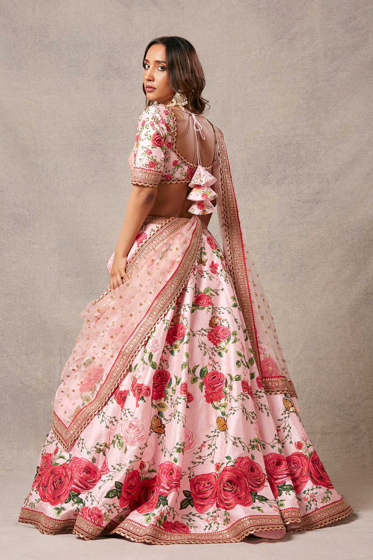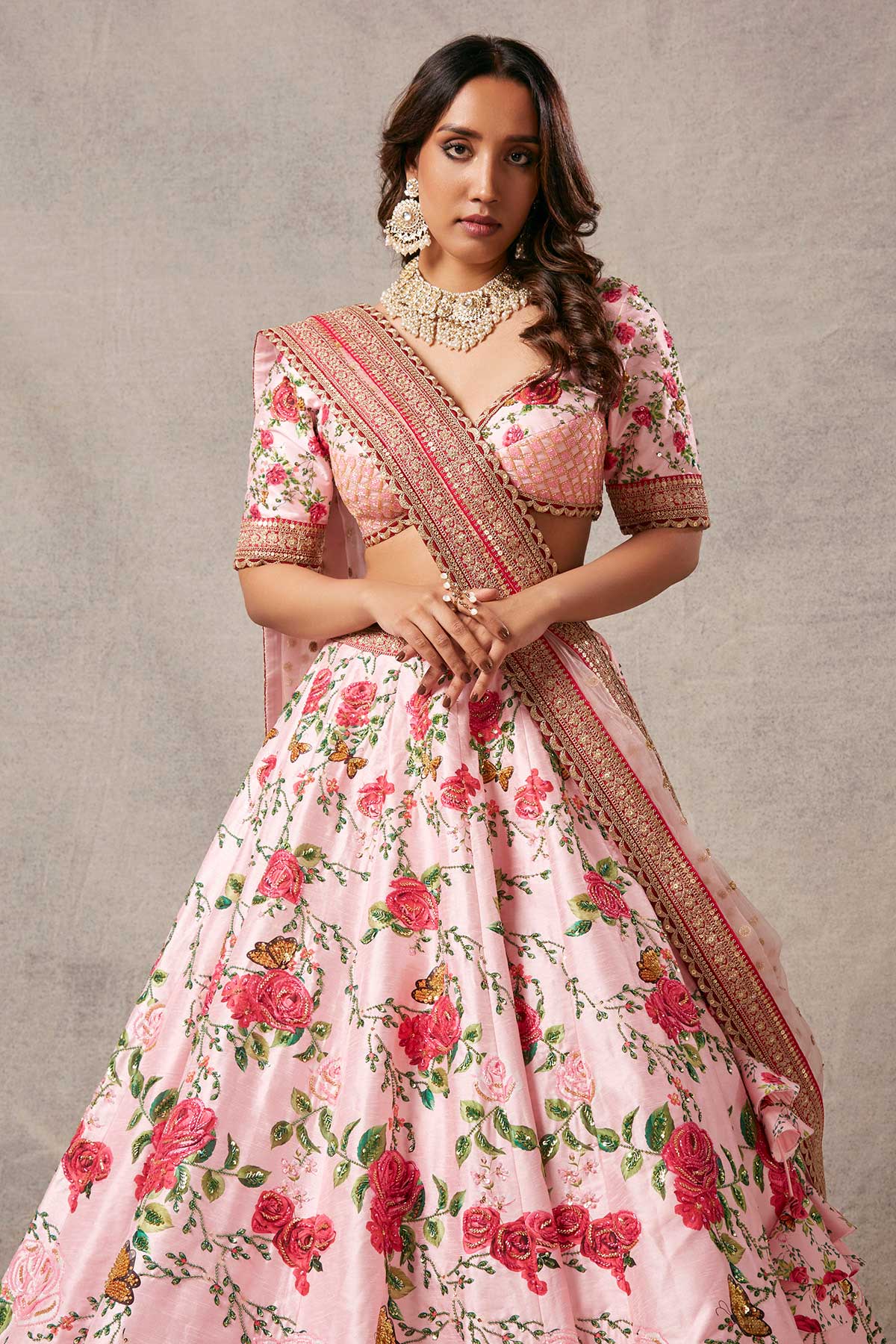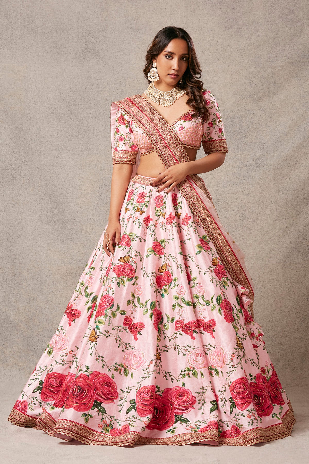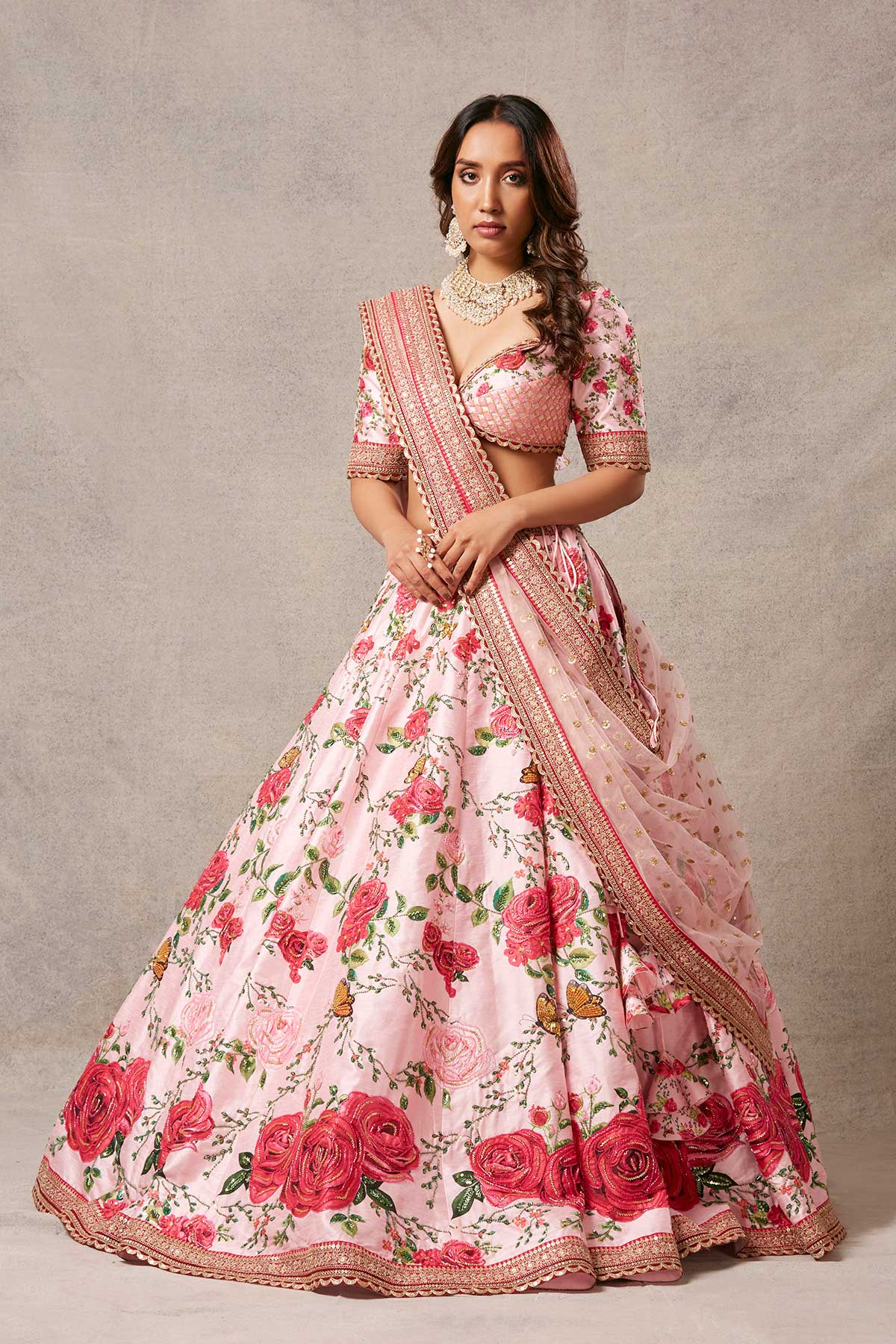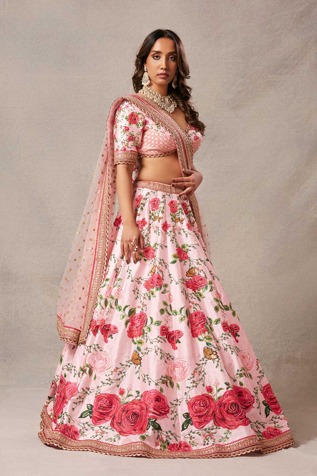 Our fablous signature lehenga, with an elegant blouse and net dupatta with work.