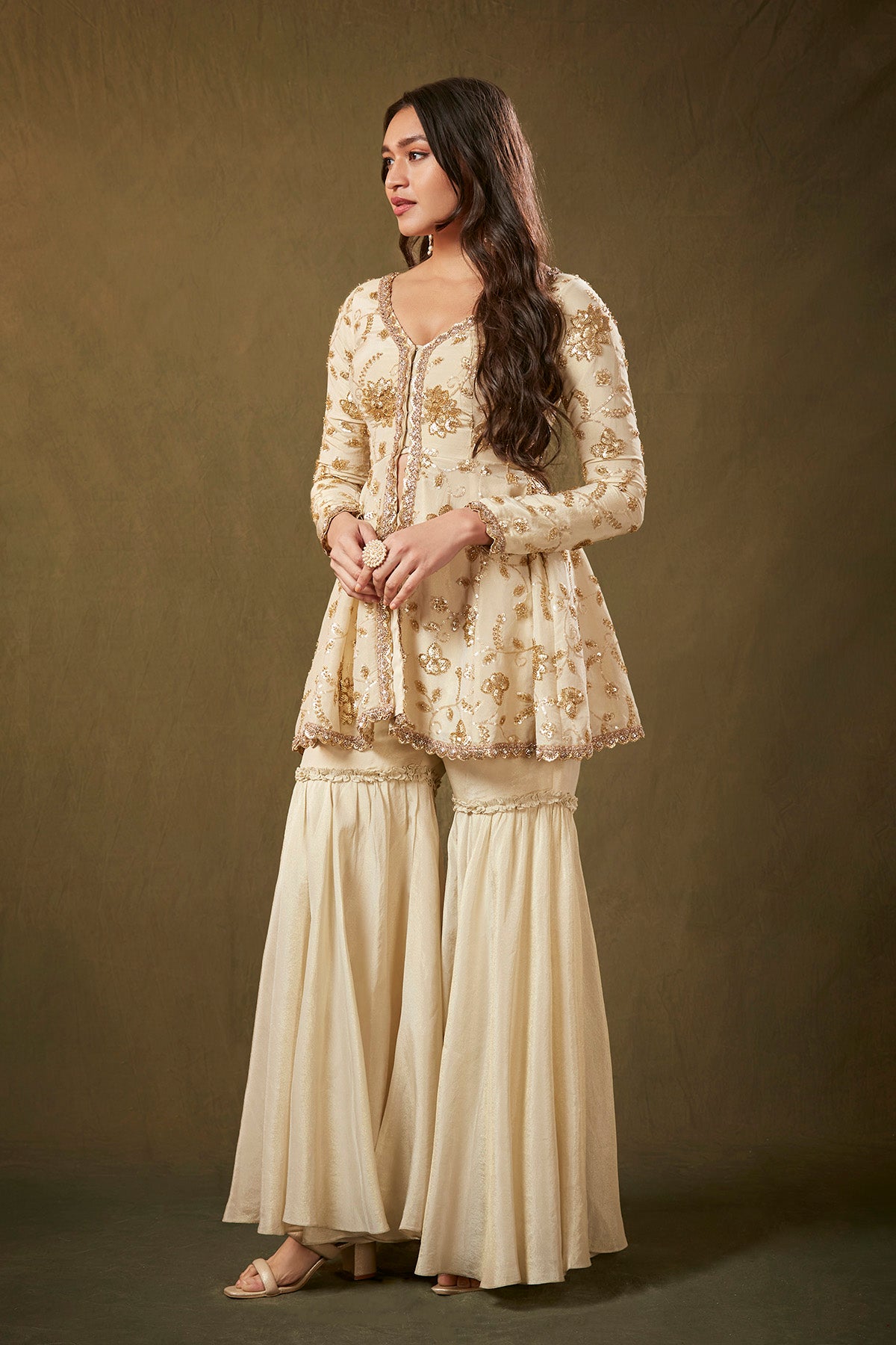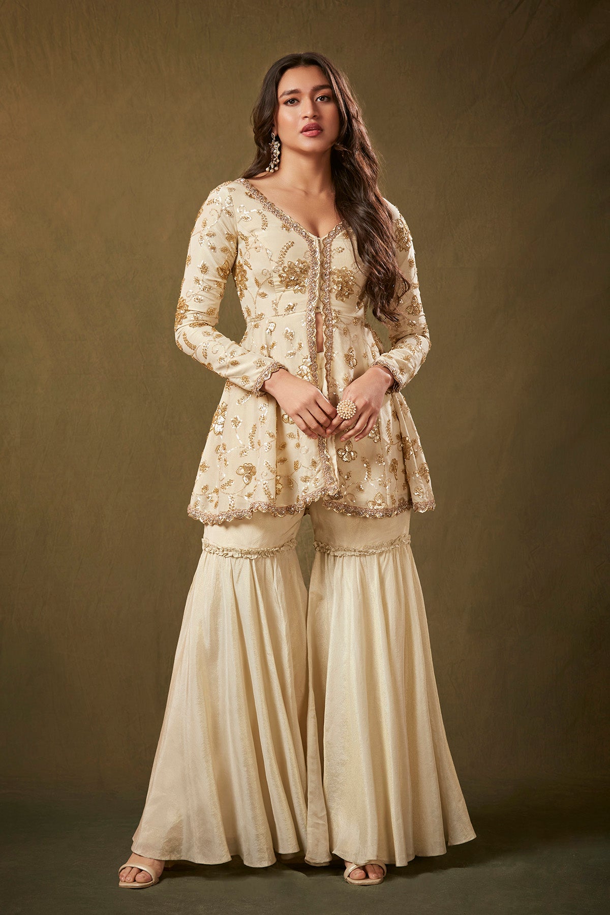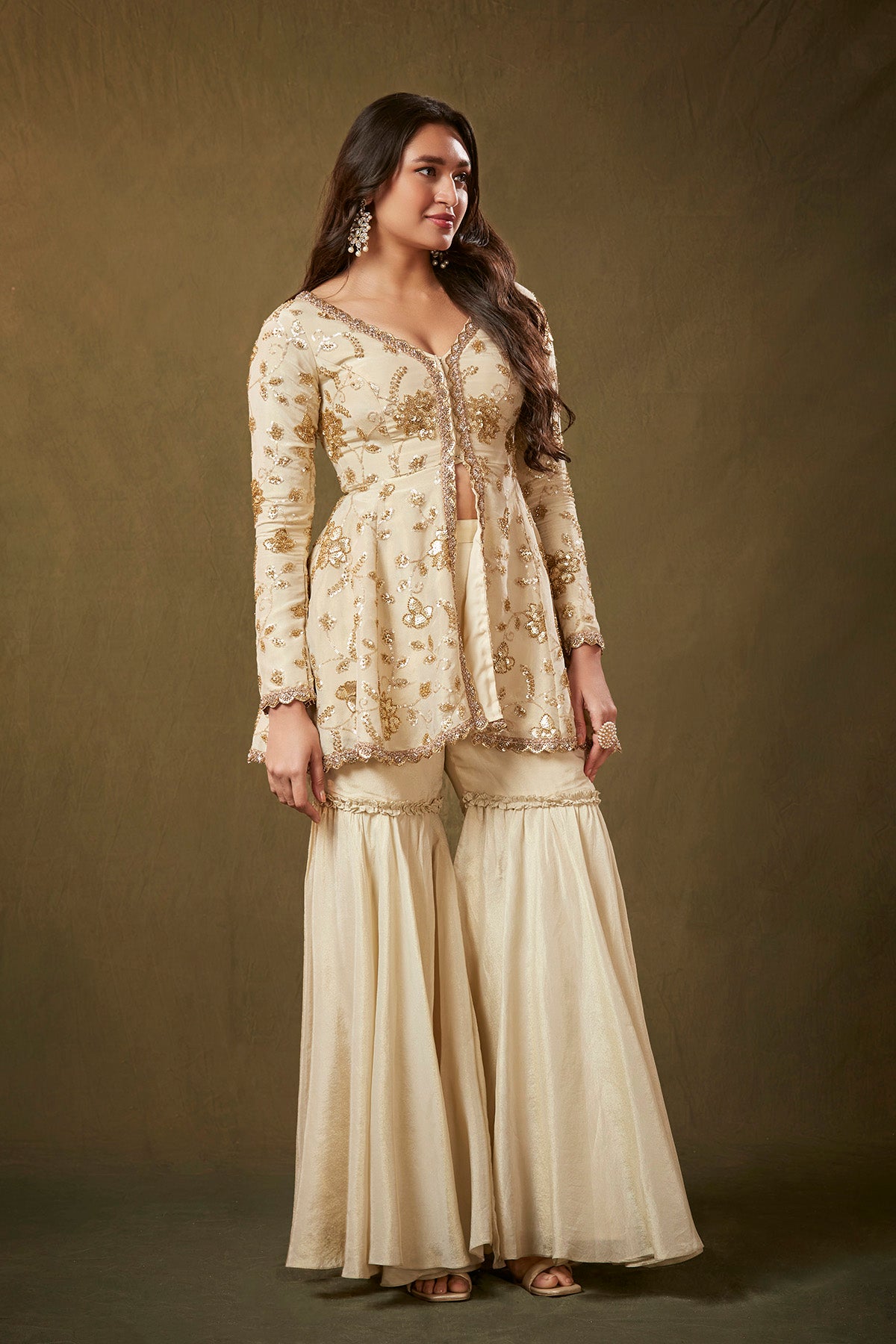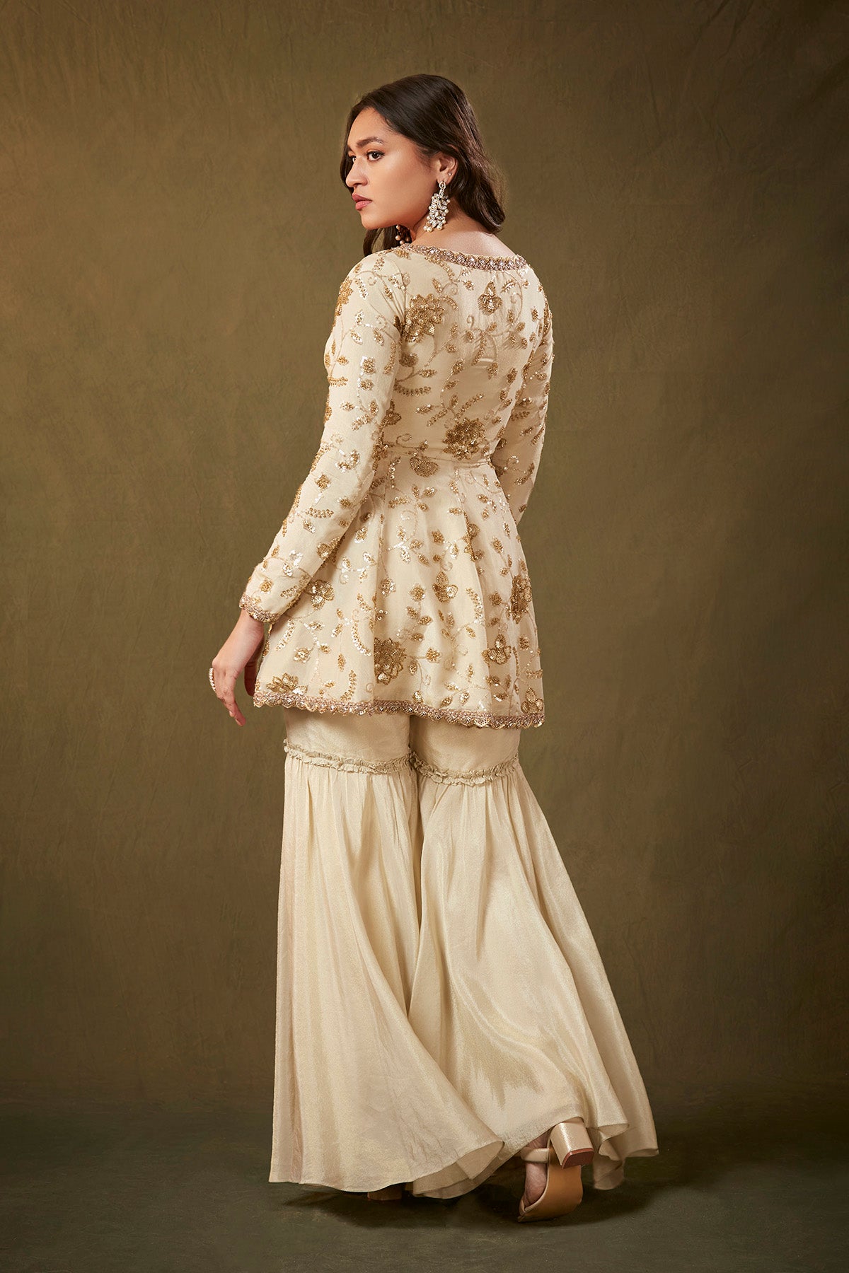 This exquisite outfit features a peplum design blouse adorned with intricate gold work, complemented by both hand and machine embroidery, creating a stunning visual appeal.