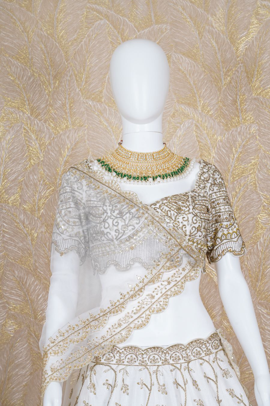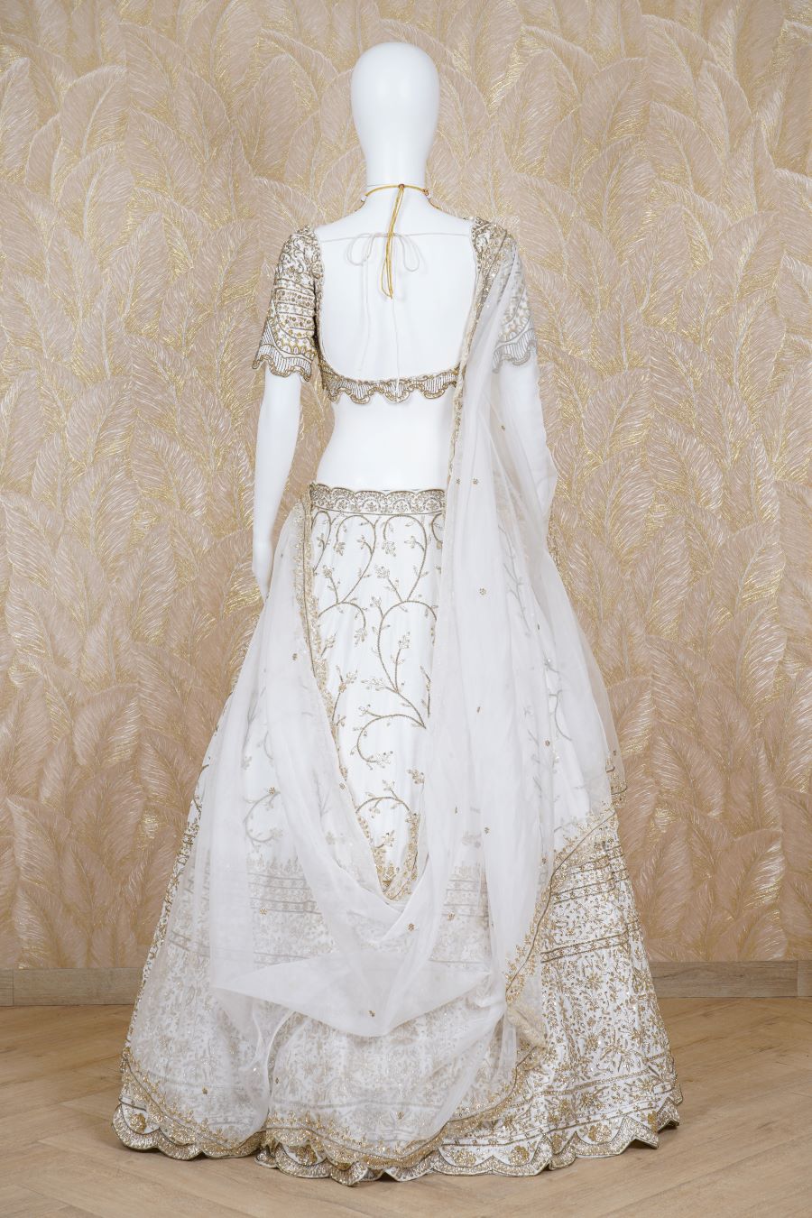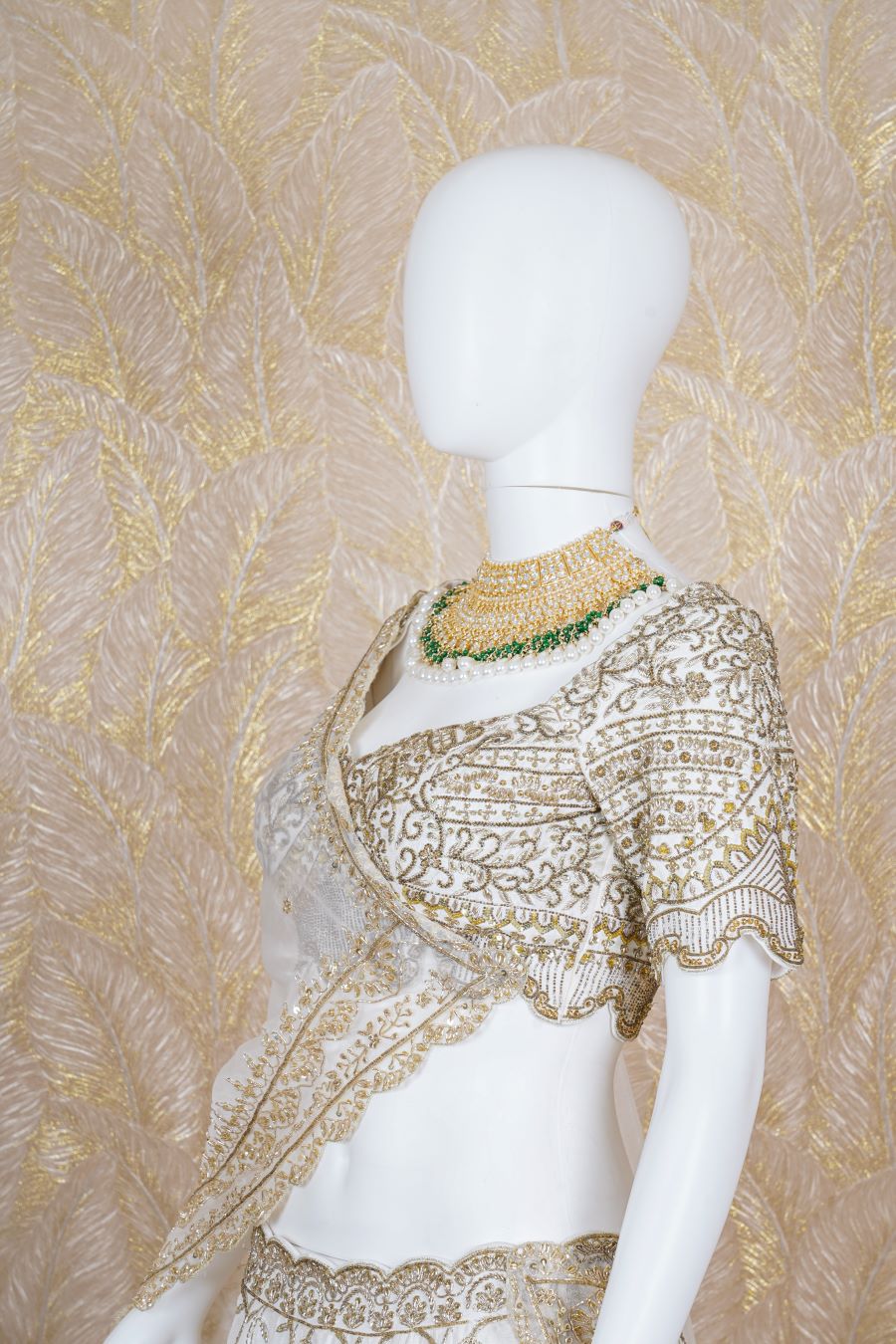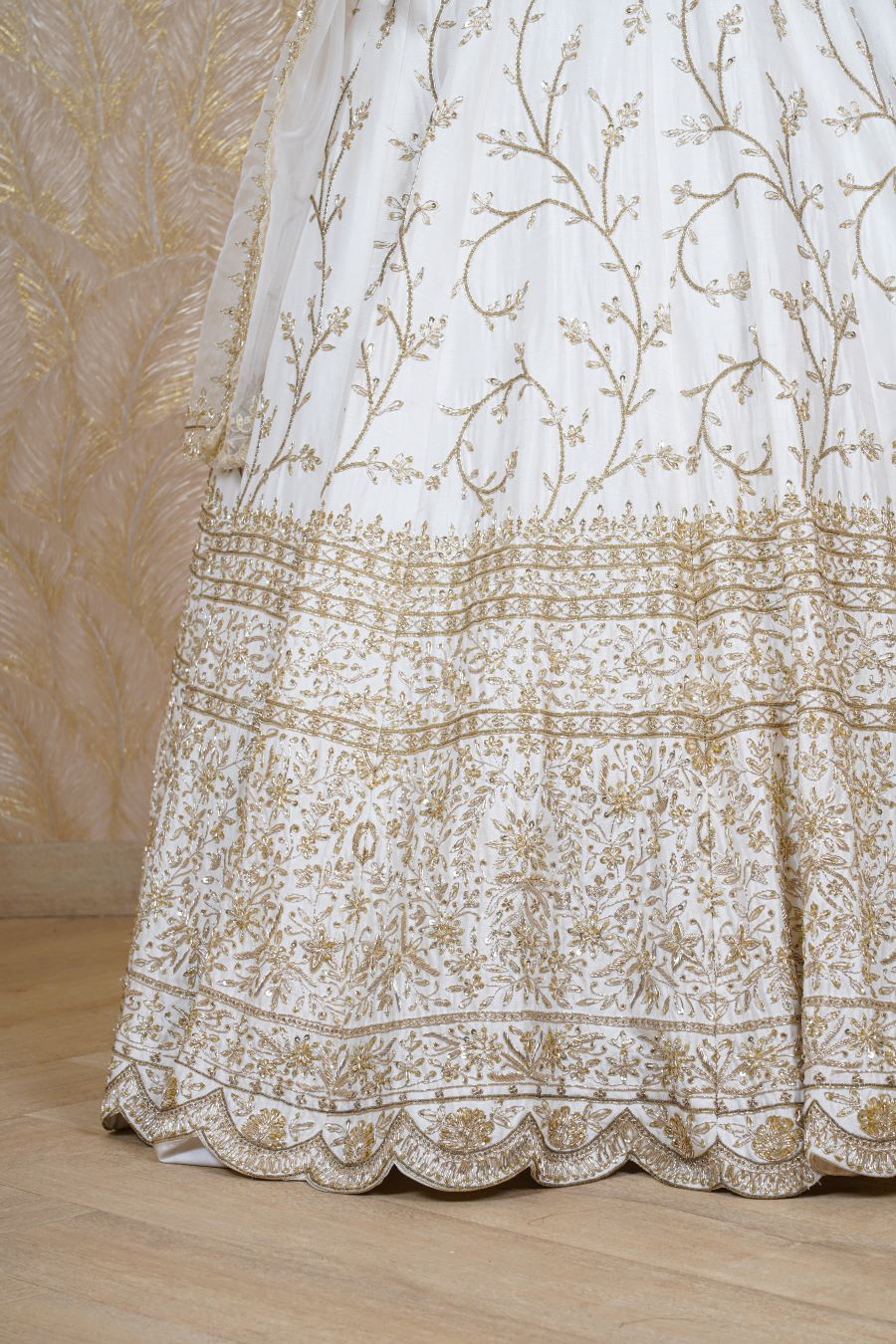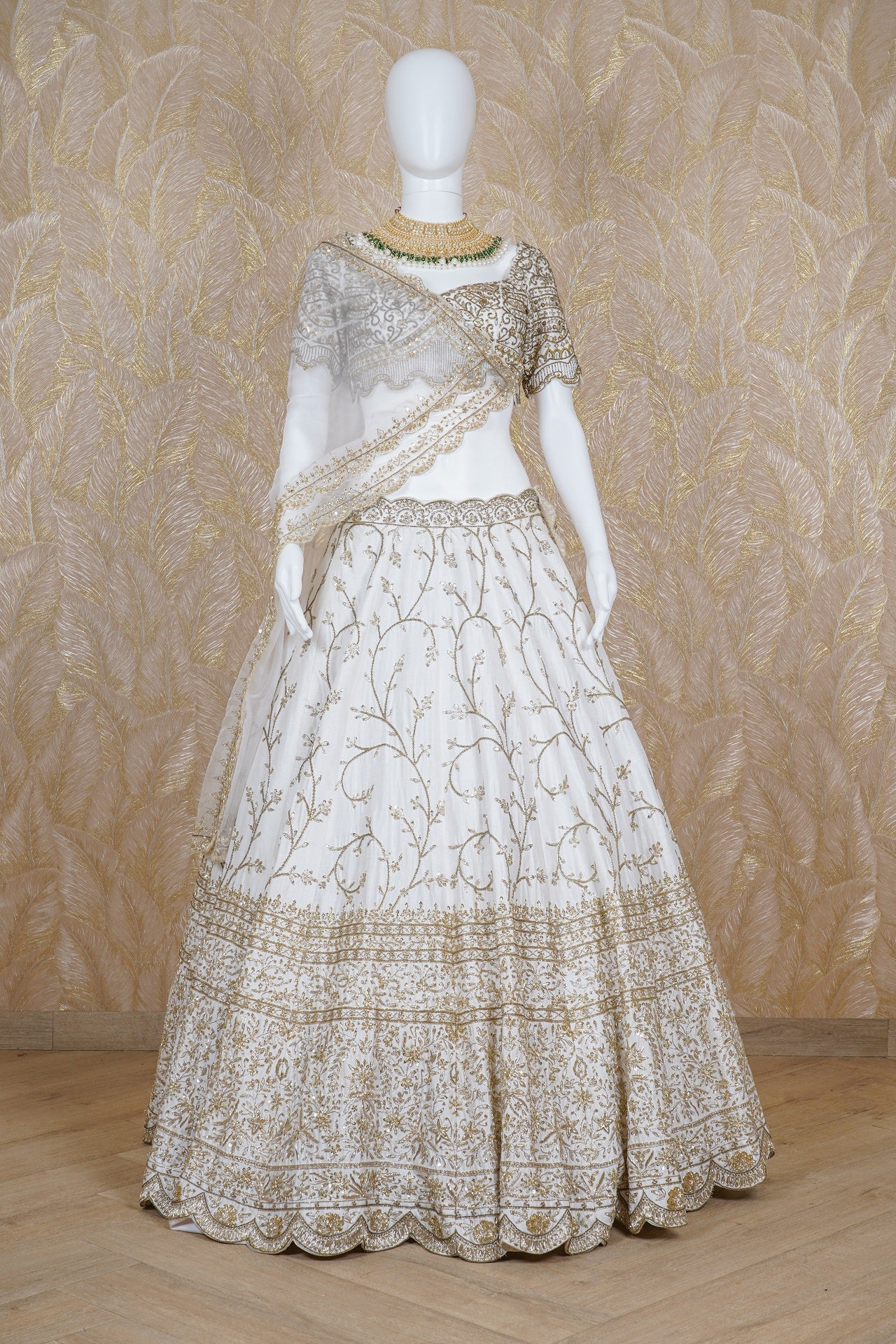 Ivory Rawsilk Lehenga with zardosi jaal. Paired with a matching embroidered blouse and scalloped dupatta. Model is wearing size, “Medium”.