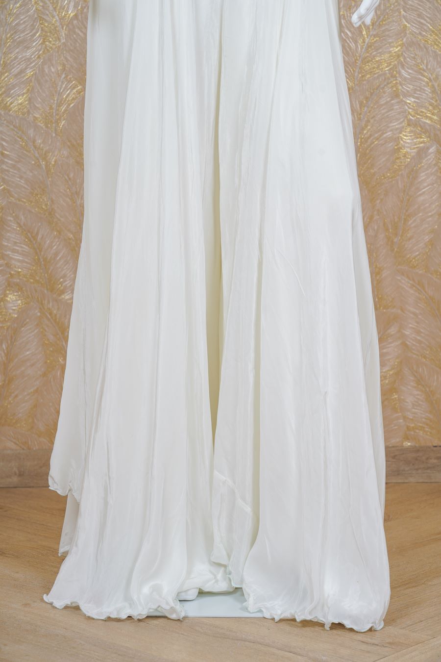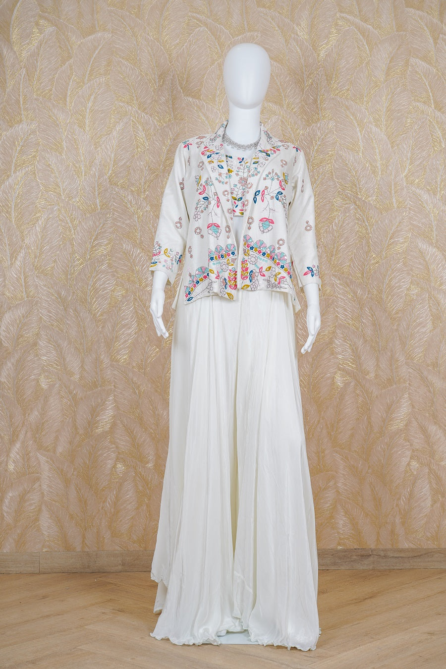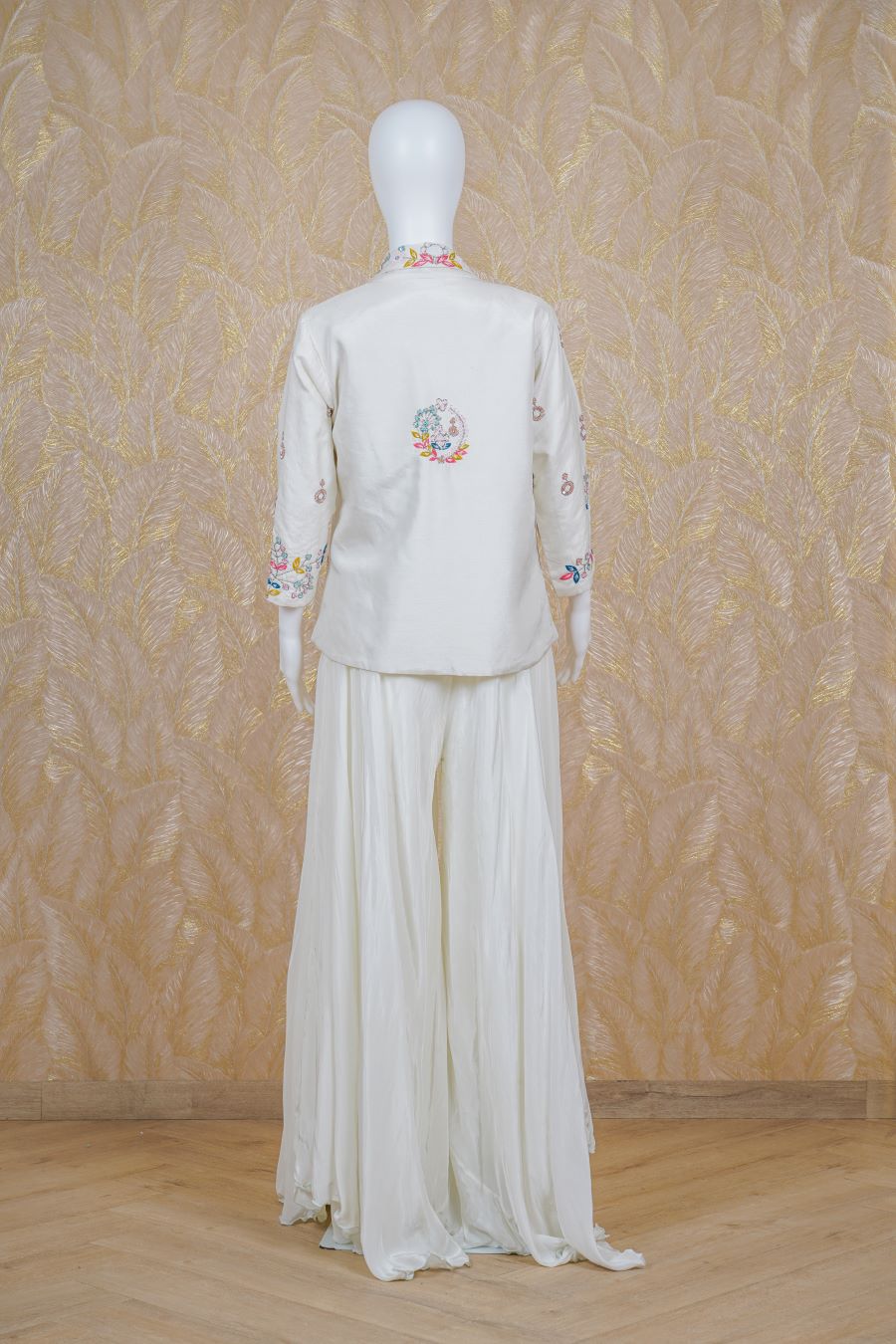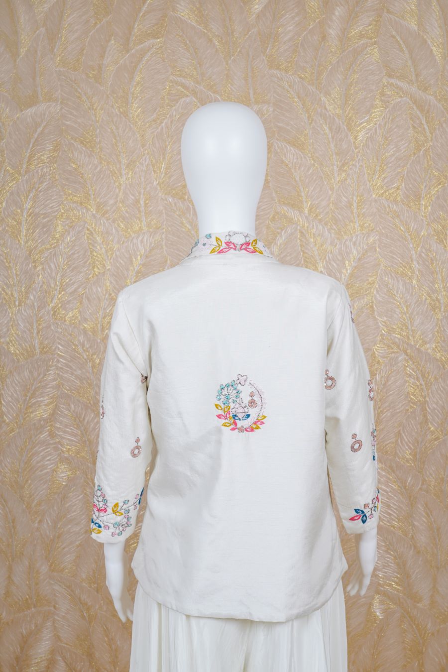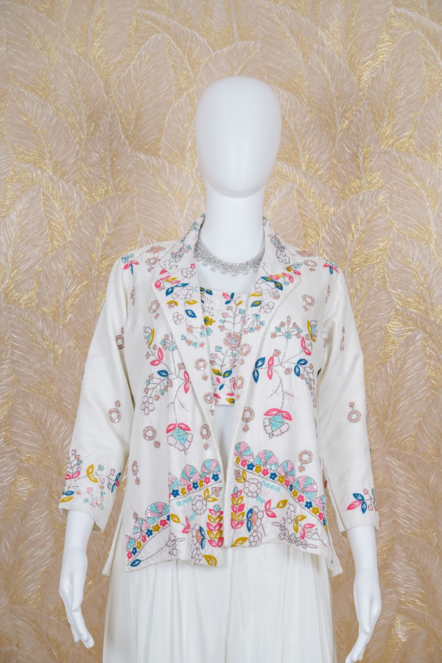 Ivory based rawsilk blazer adorned with resham, beads, kardana and sequins embroidered work. Styled with a matching embroidered crop top, paired with a palazzo pants. Model is wearing size, “Medium”.
