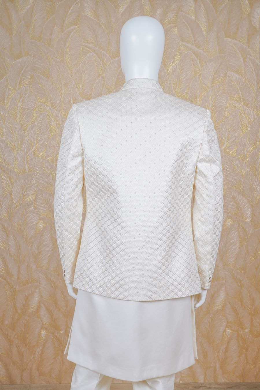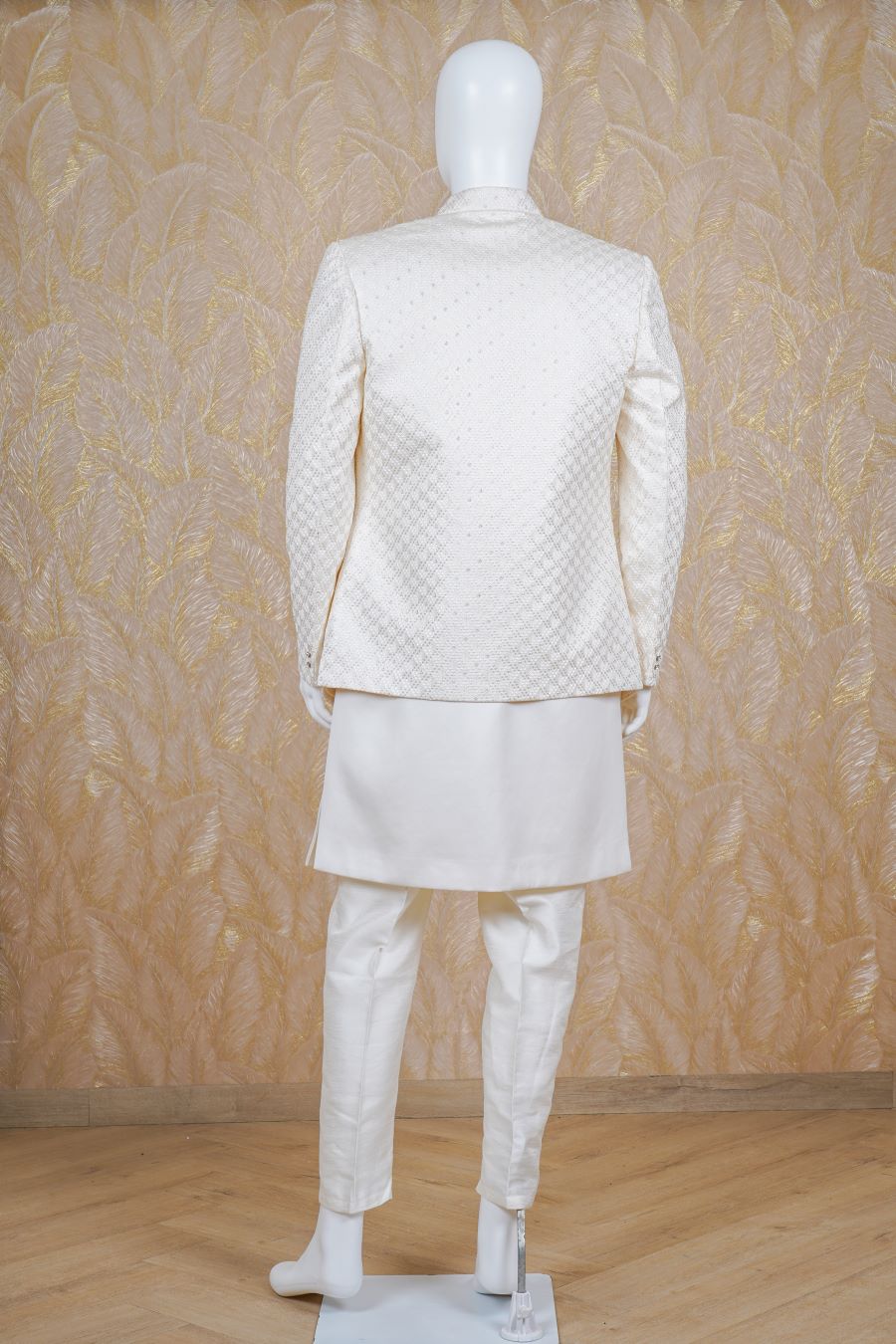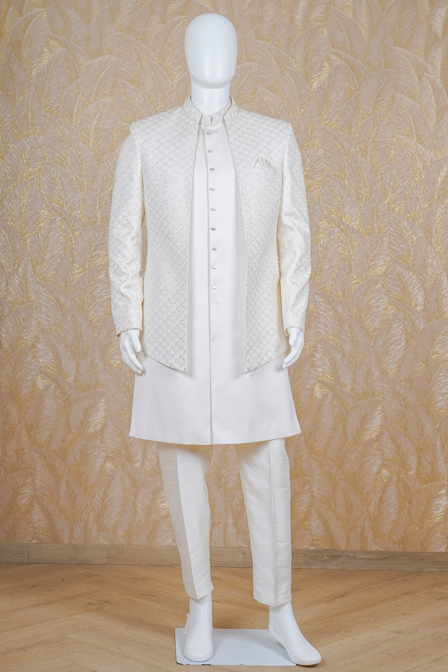Ivory sherwani, Embroidered with geometric ivory thread. The sherwani styled with Kurta, trouser and stole. Model is wearing size, “Medium”.