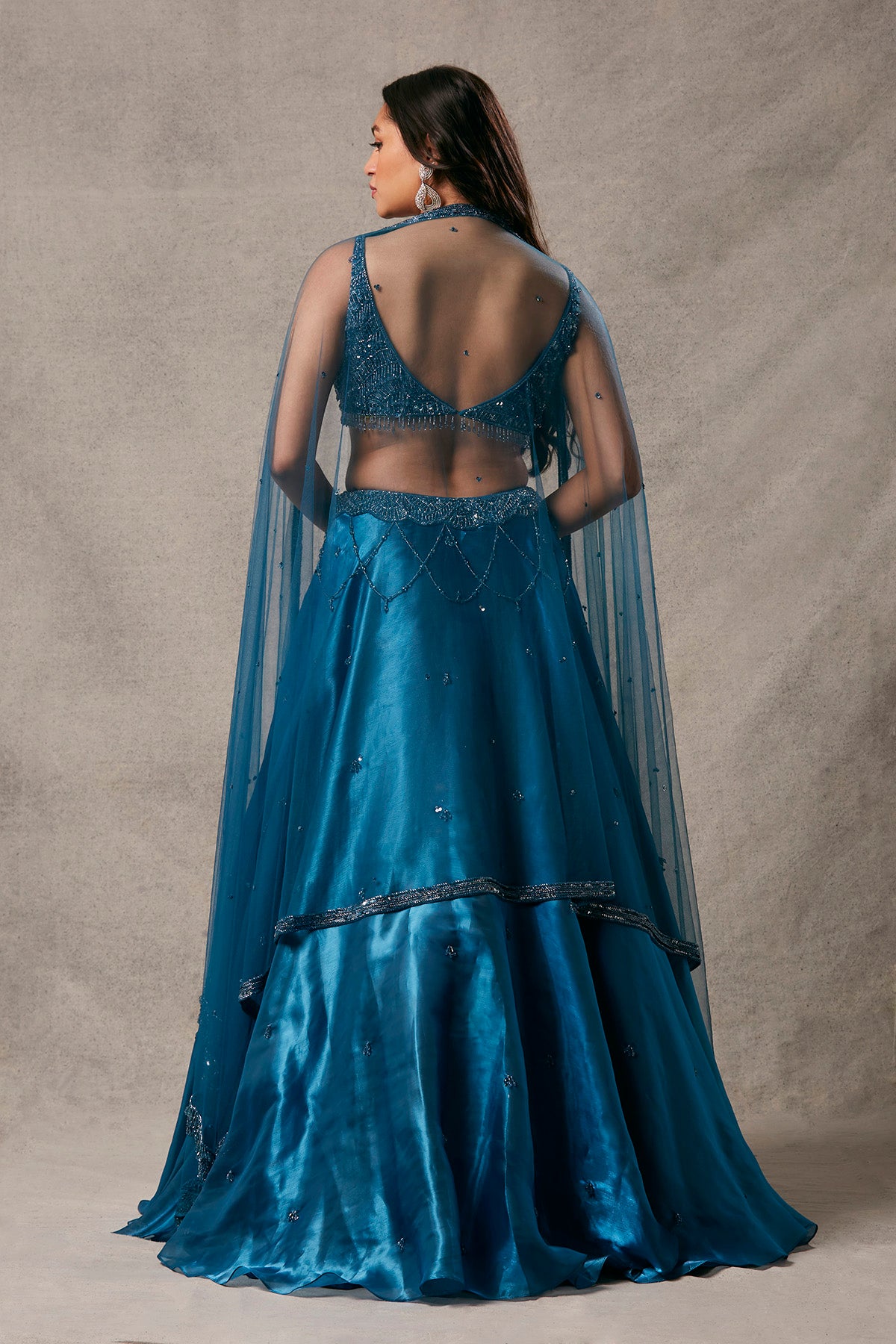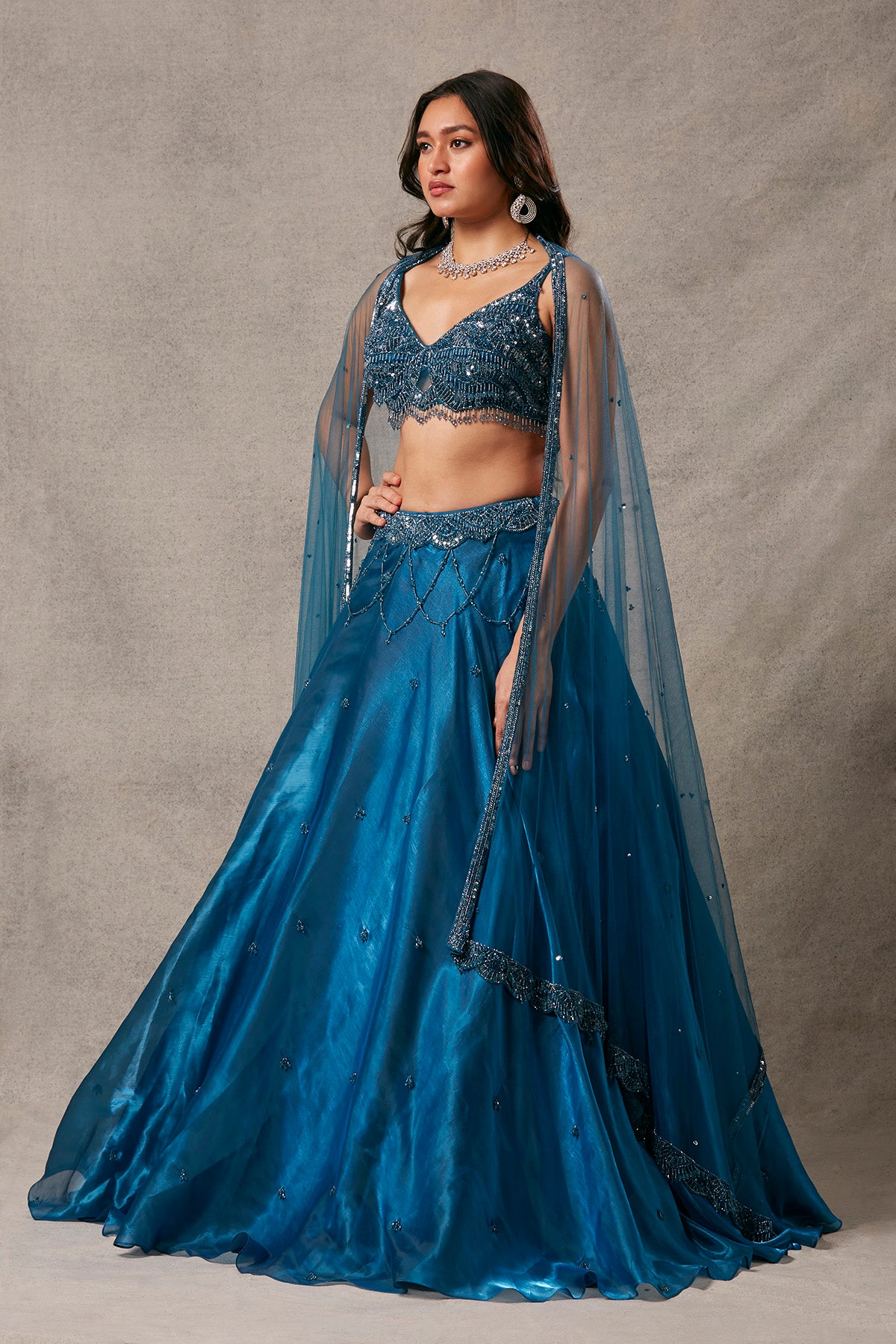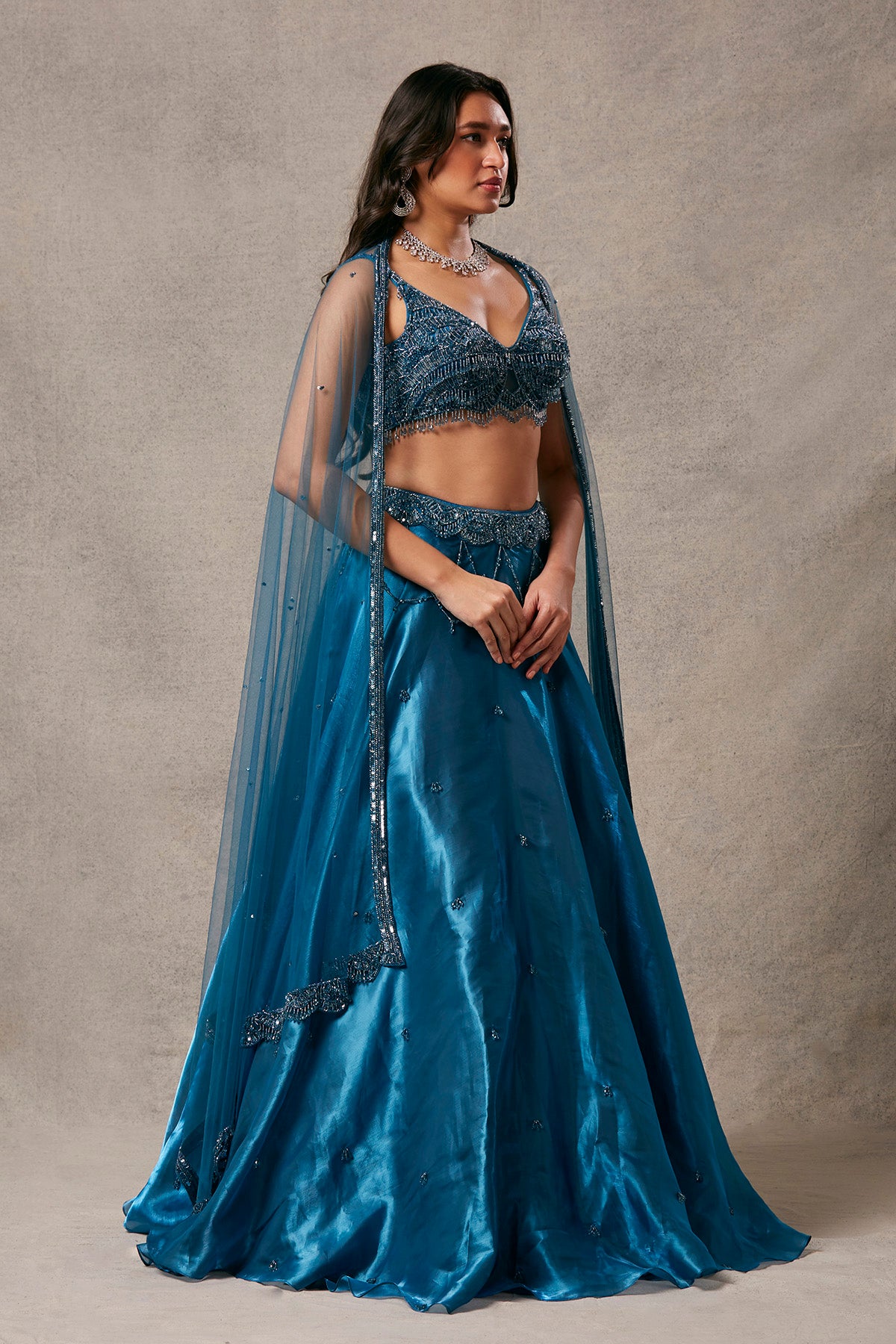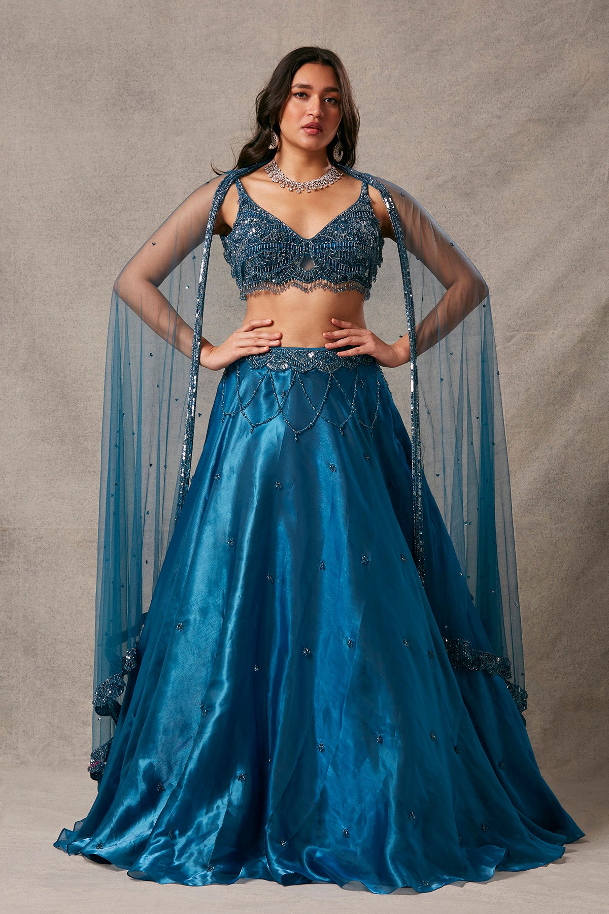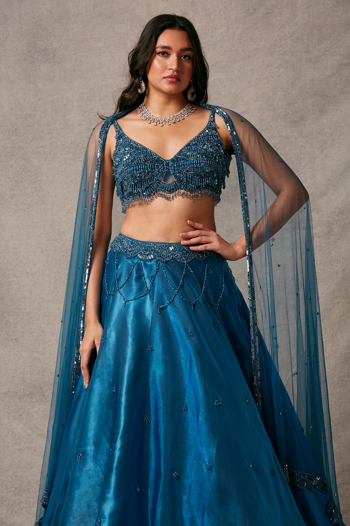Elegant Jimmy Choo fabric adorns this lehenga, complemented by a blouse adorned with intricate tassel detailing.