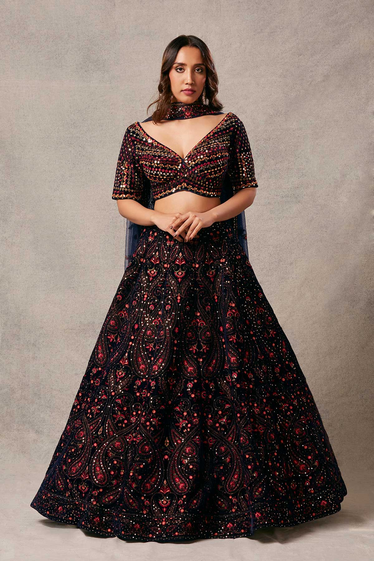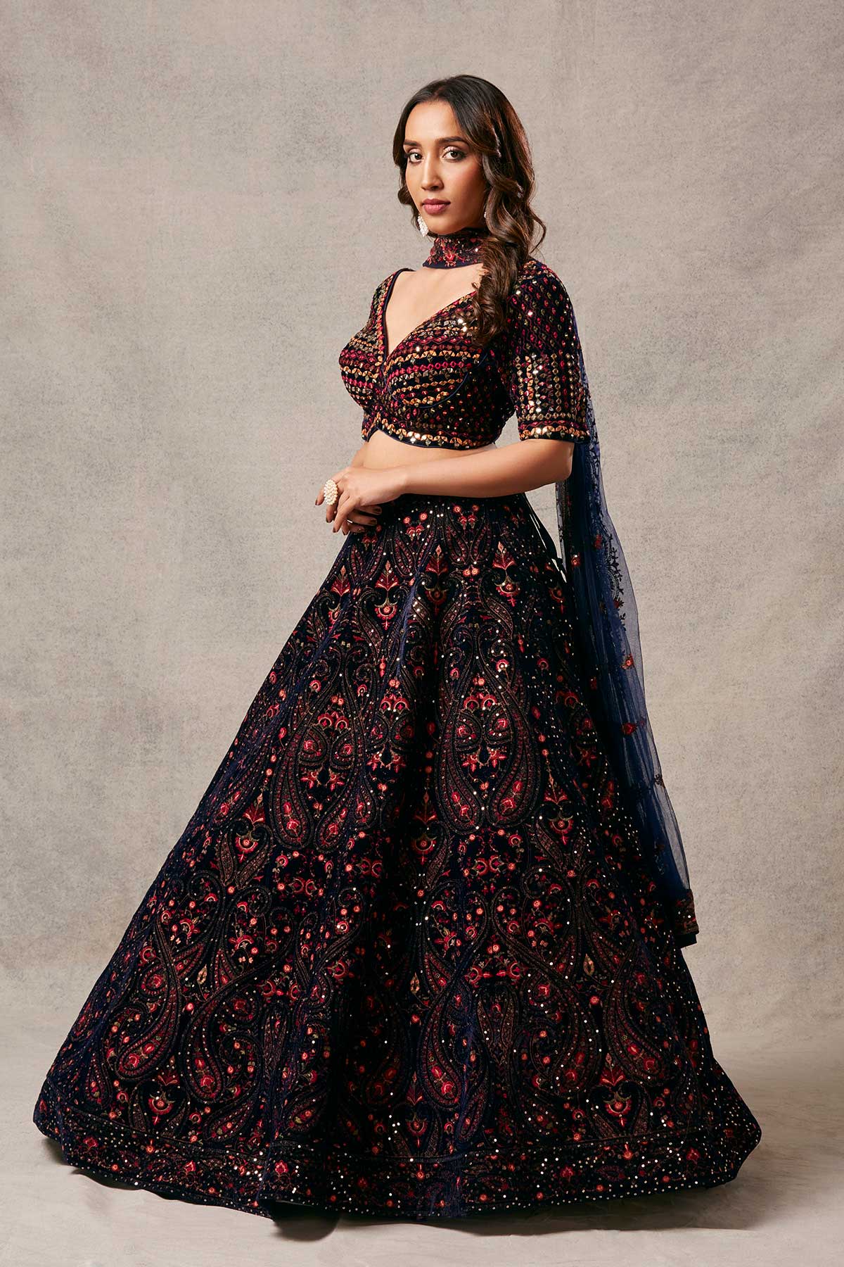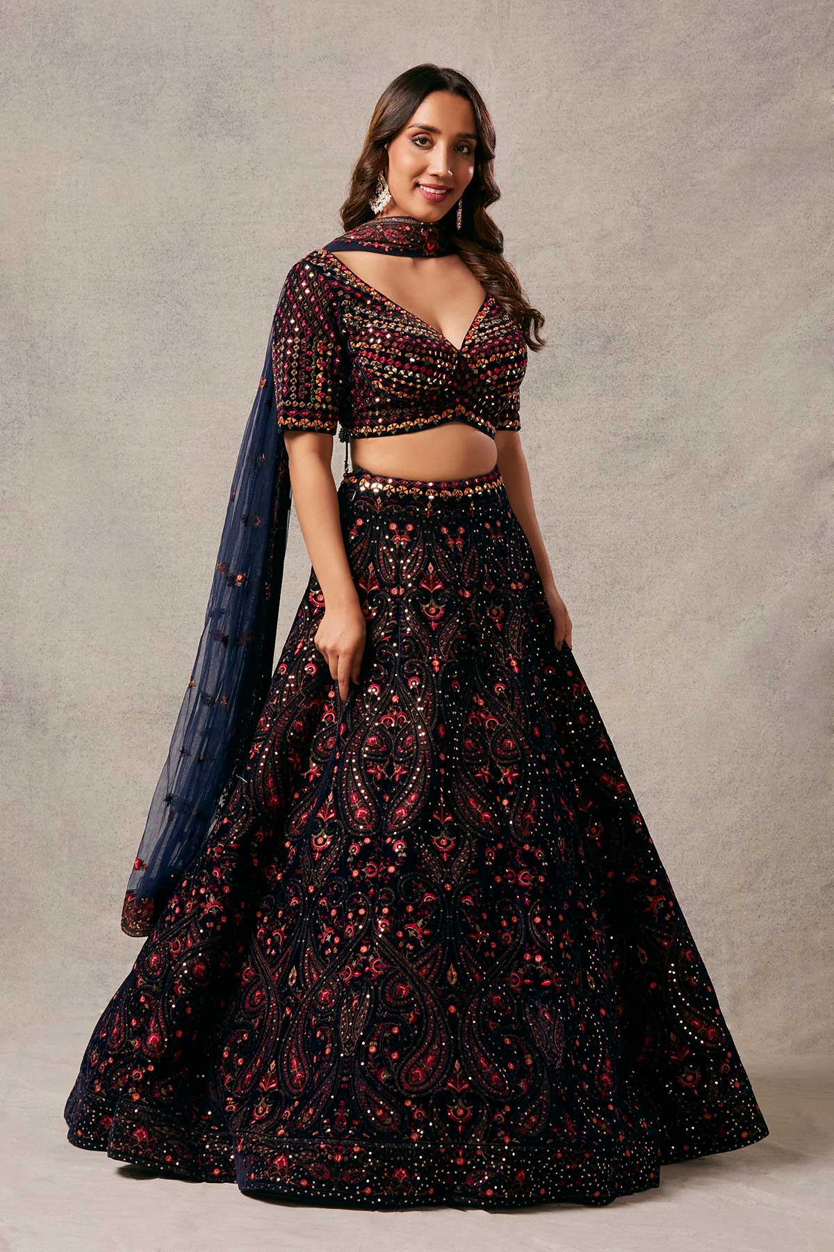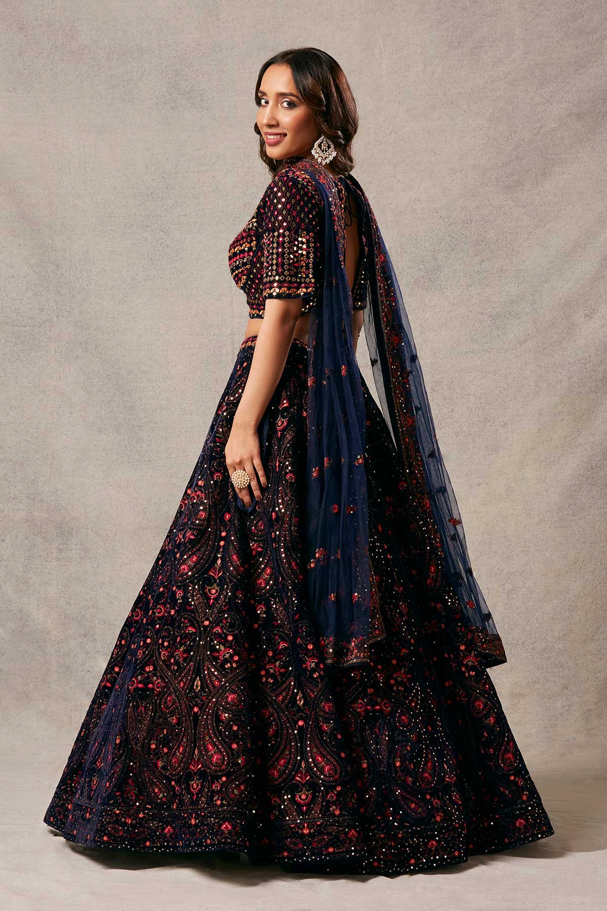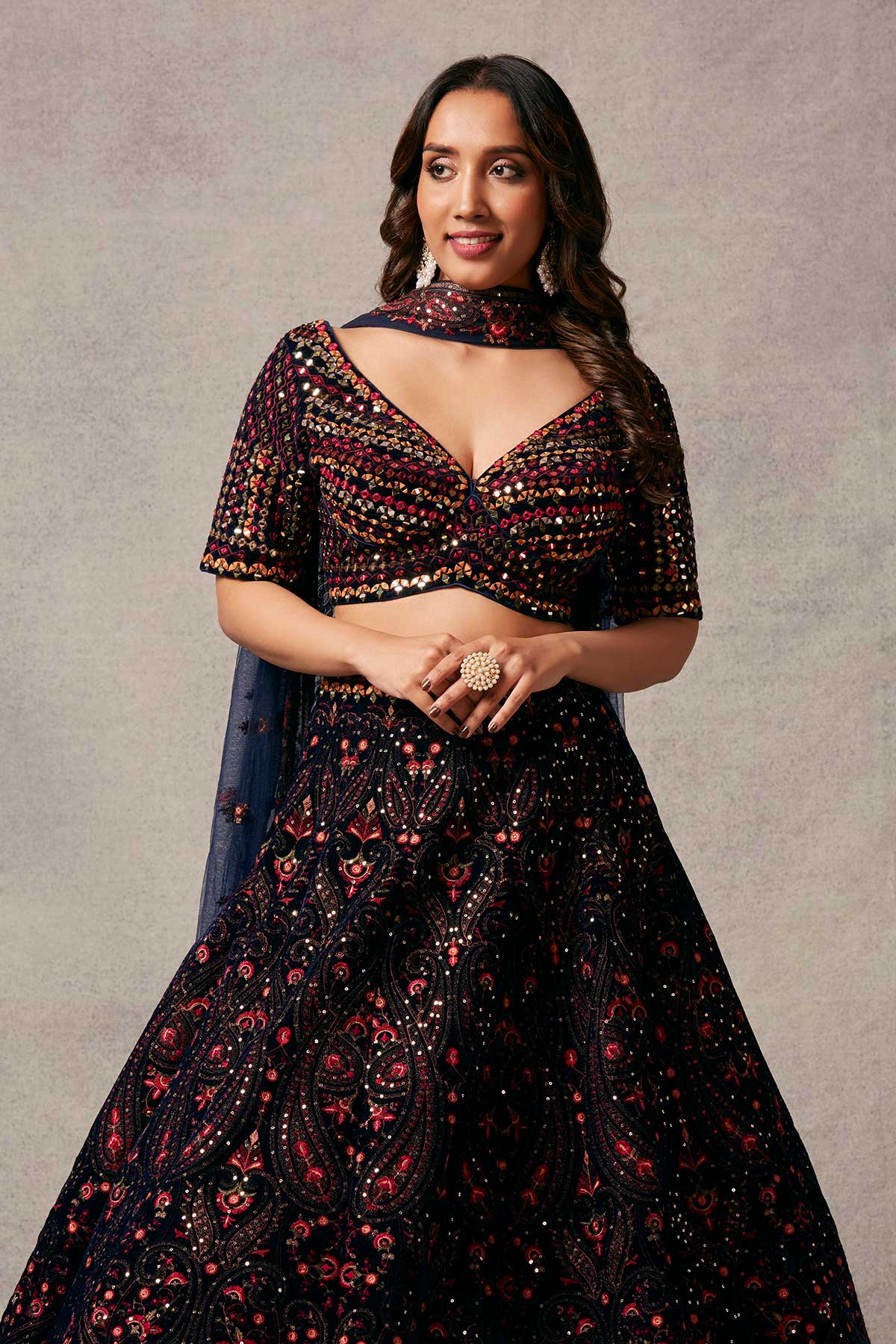 This beautiful mirrorwork lehenga, adorned in hues reminiscent of the night sky, captivates with its celestial charm, elevating any occasion to a realm of elegance and allure.