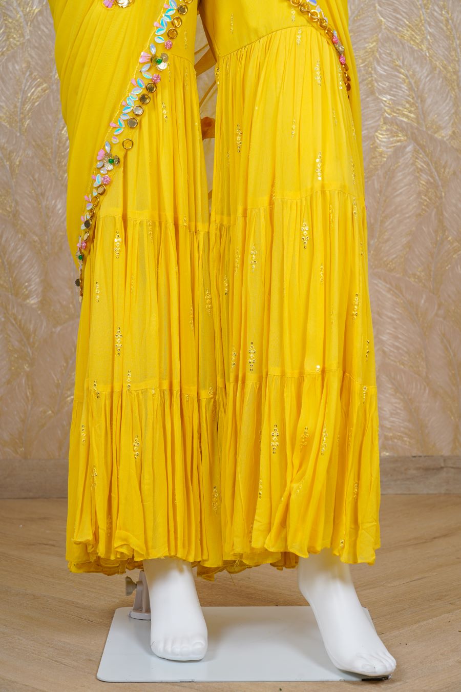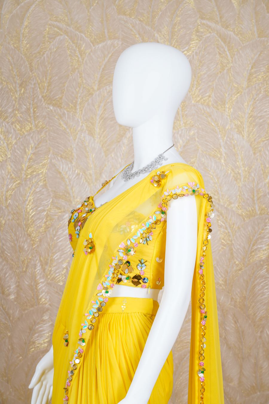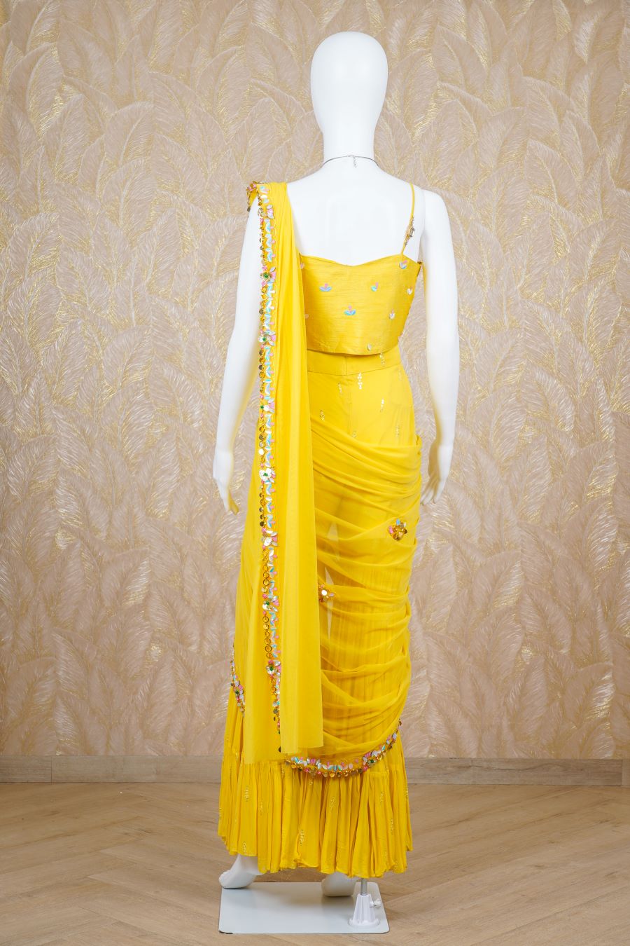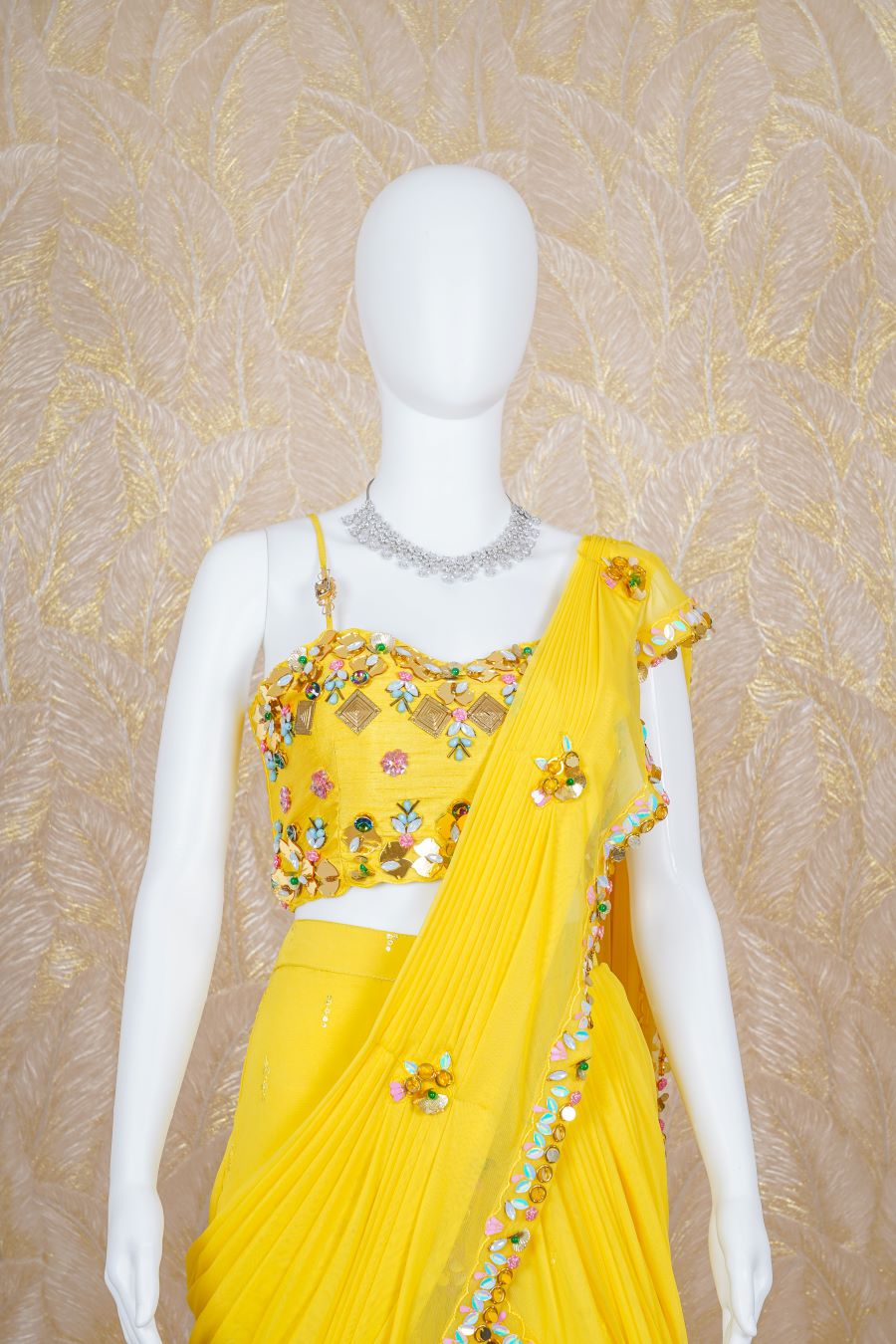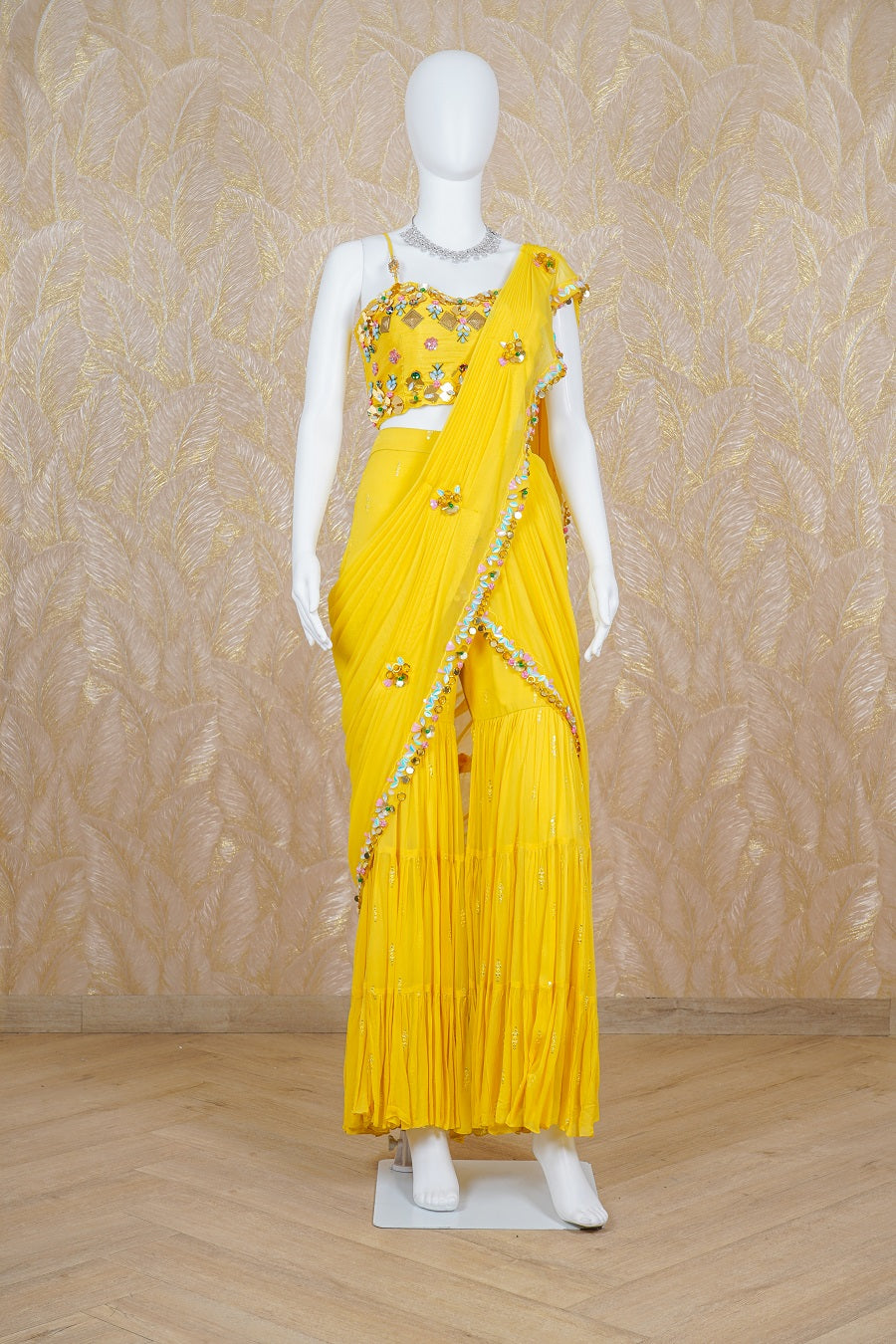 Lemon yellow rawsilk and georgette saree drape with sharara pants adorned with embellishments and embroidered crop top. Model is wearing size, “Medium”.
