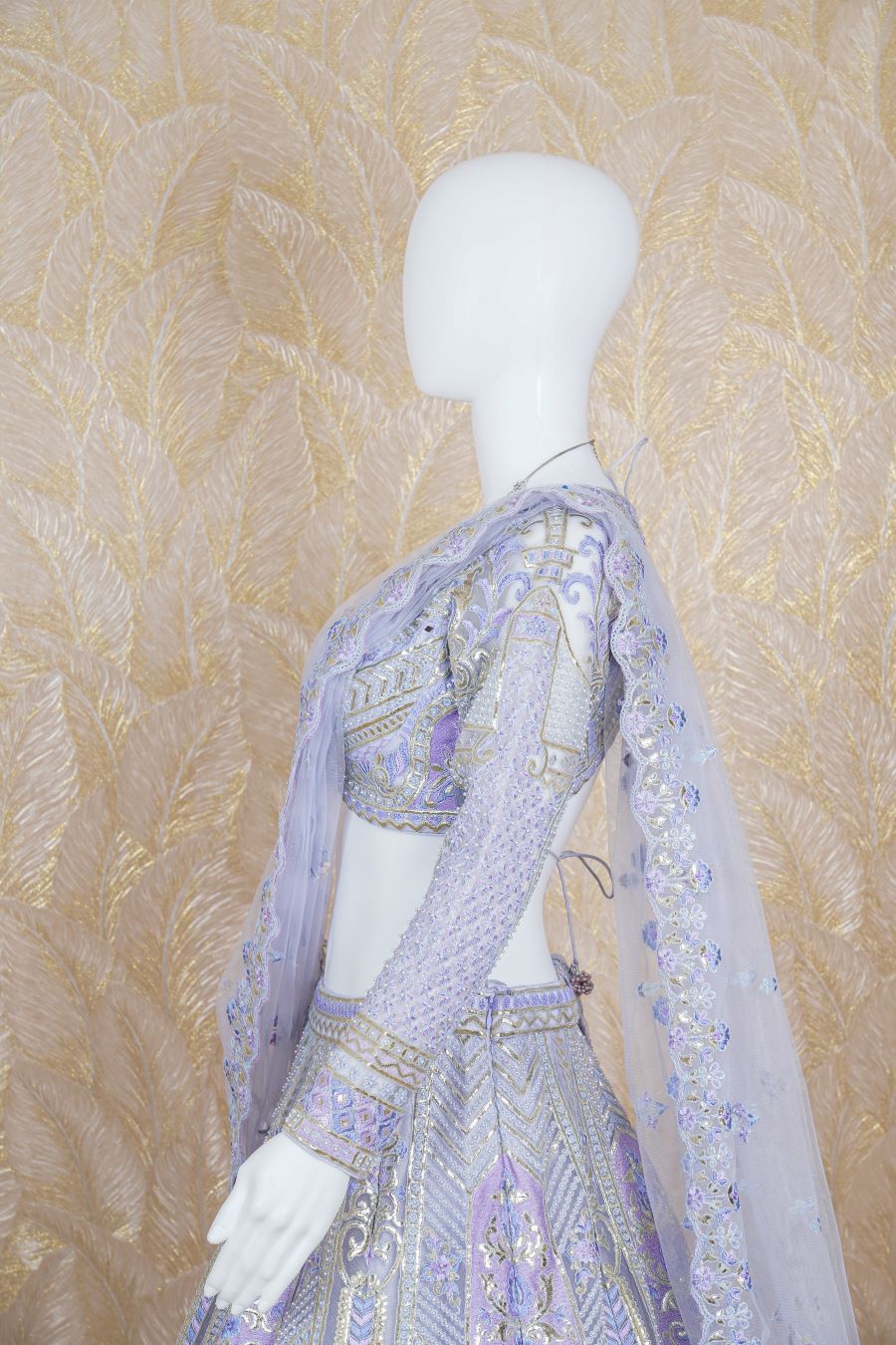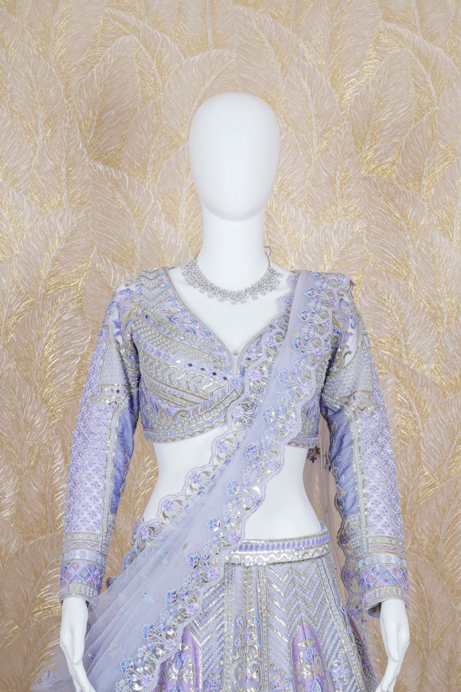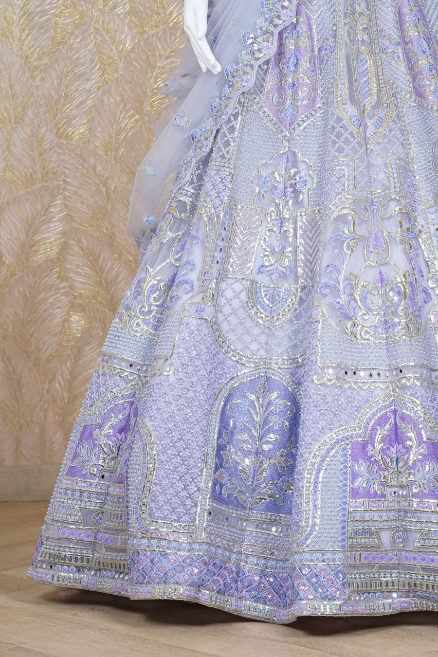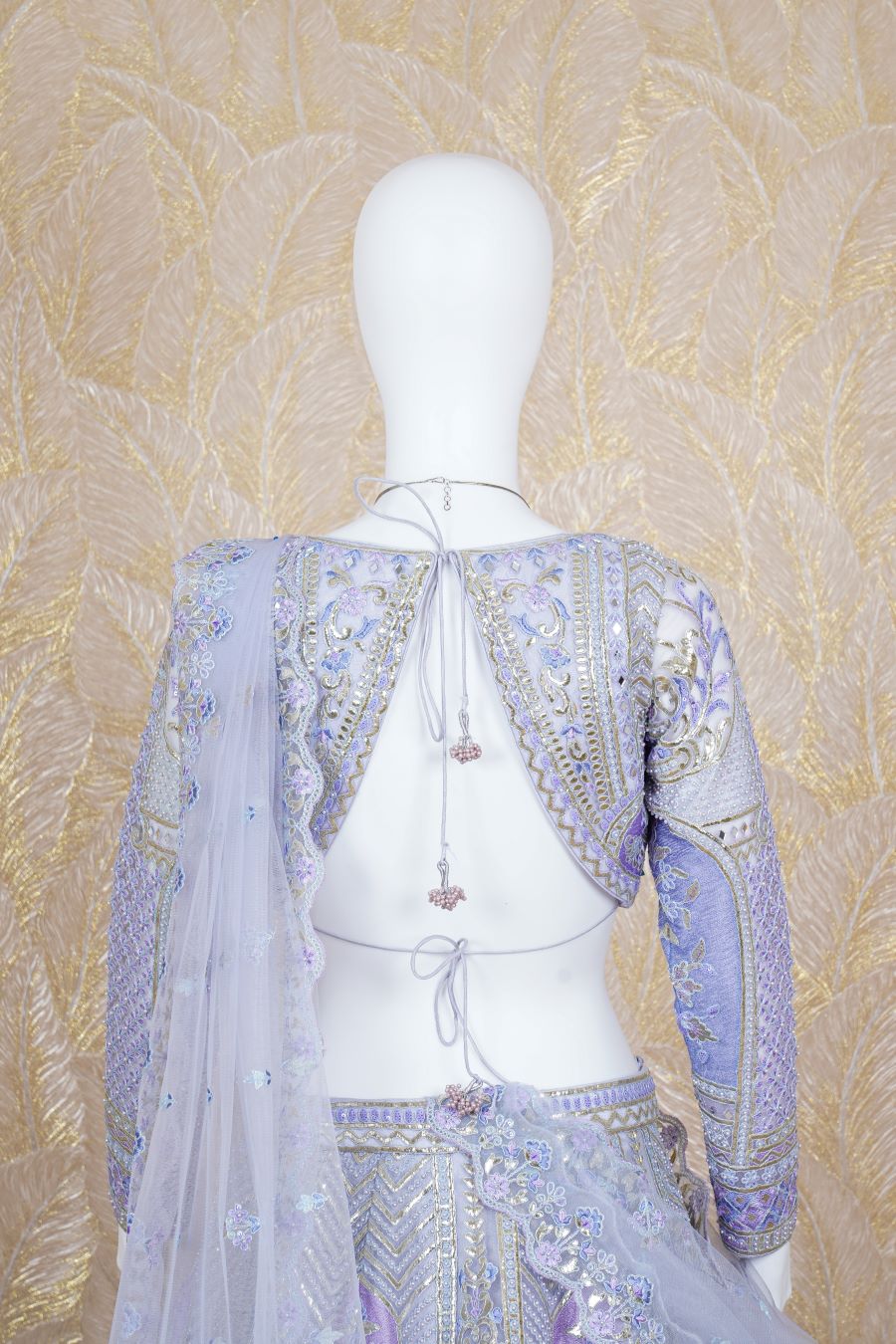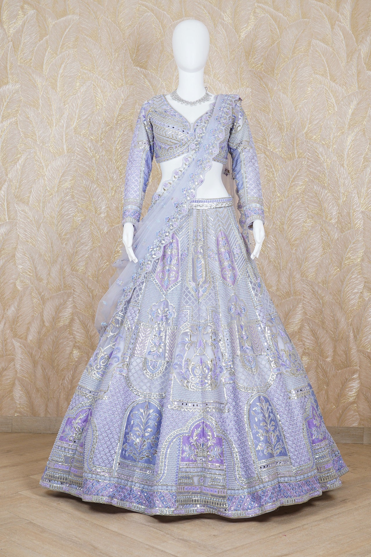 Lilac Lehenga with architectural and floral motifs in printed chrome applique and highlight with pearls, fine dori, sequins and mirror handcrafted embroidered lehenga. The lehenga skirt is paired with a full-sleeved blouse and cutwork foliage-bordered tulle dupatta. Model is wearing size, “Medium”.