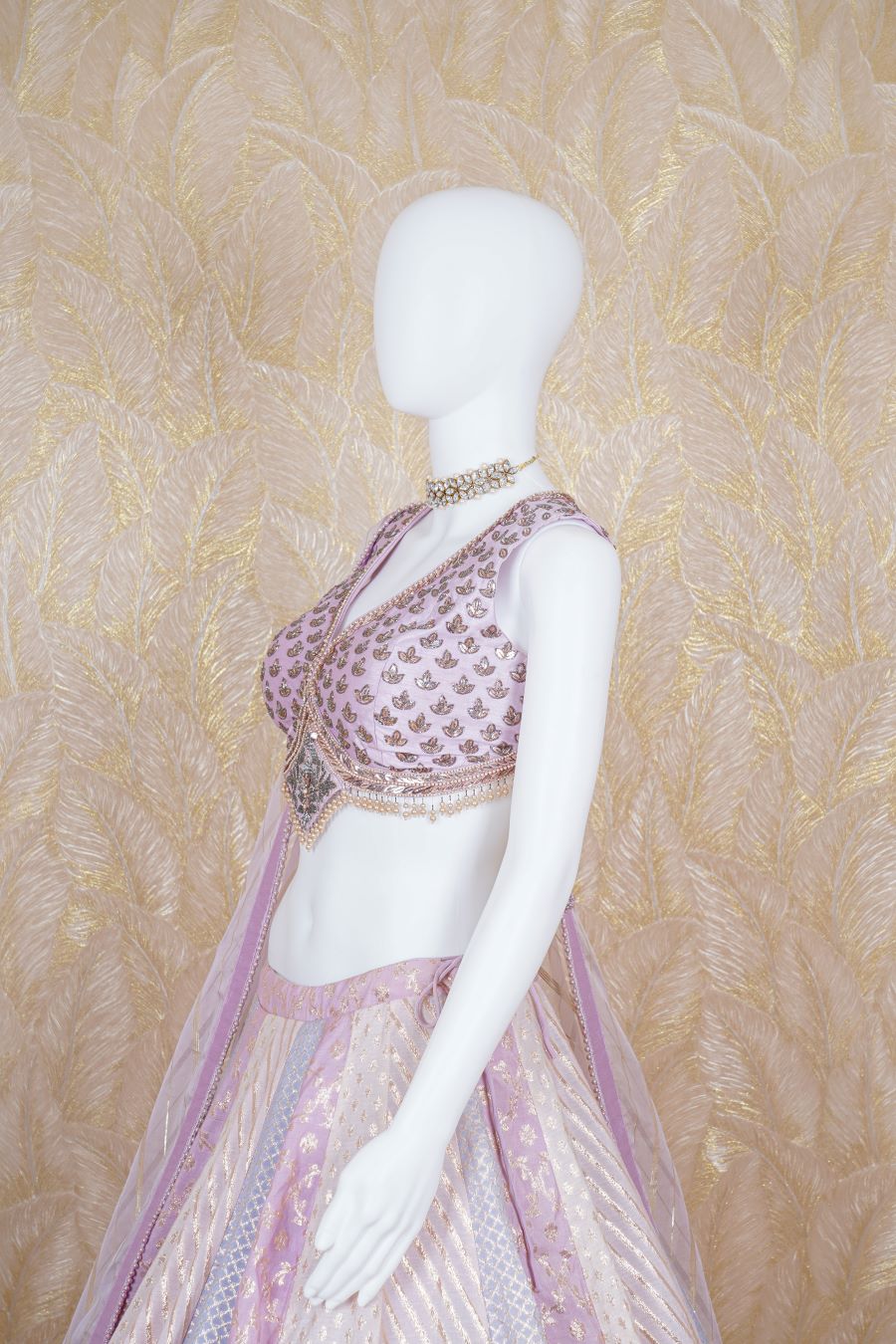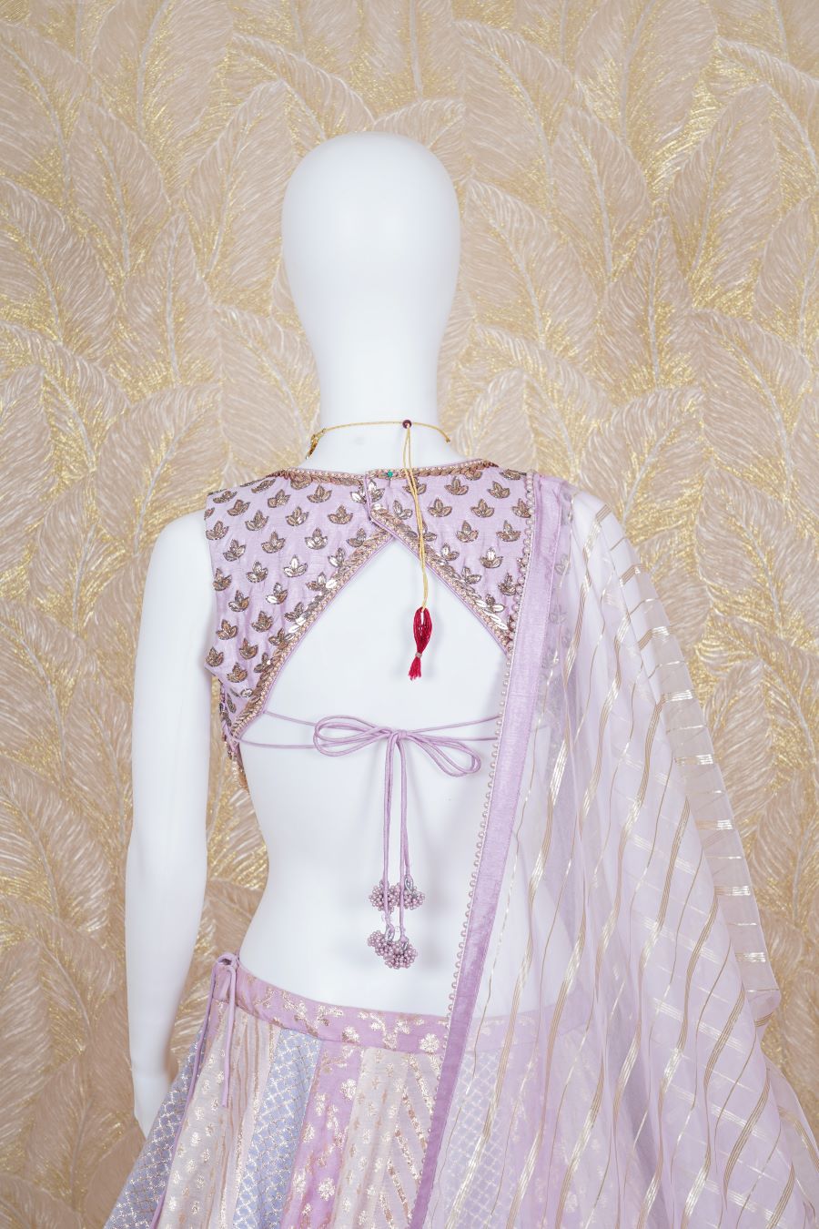 Lilac Multi Chanderi Brocade panel lehenga. The lehenga is paired with sequins, pearls and kardana handcrafted blouse with tassels and organza bordered dupatta. Model is wearing size, “Medium”.