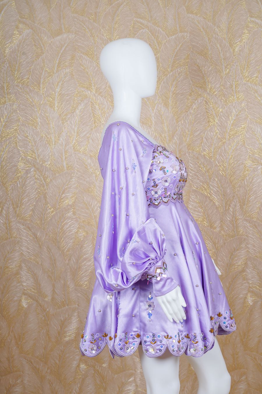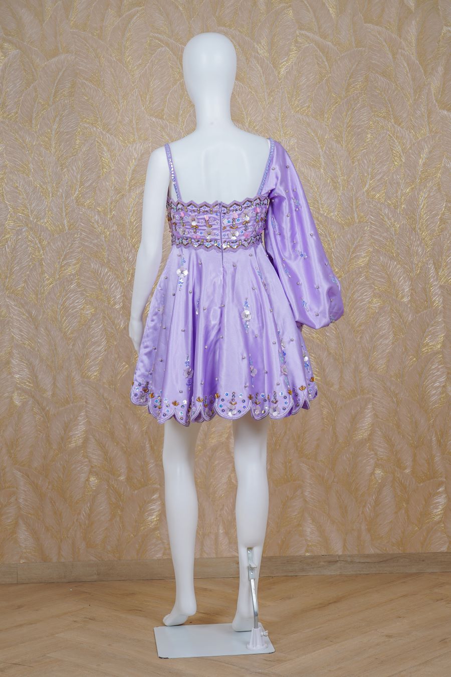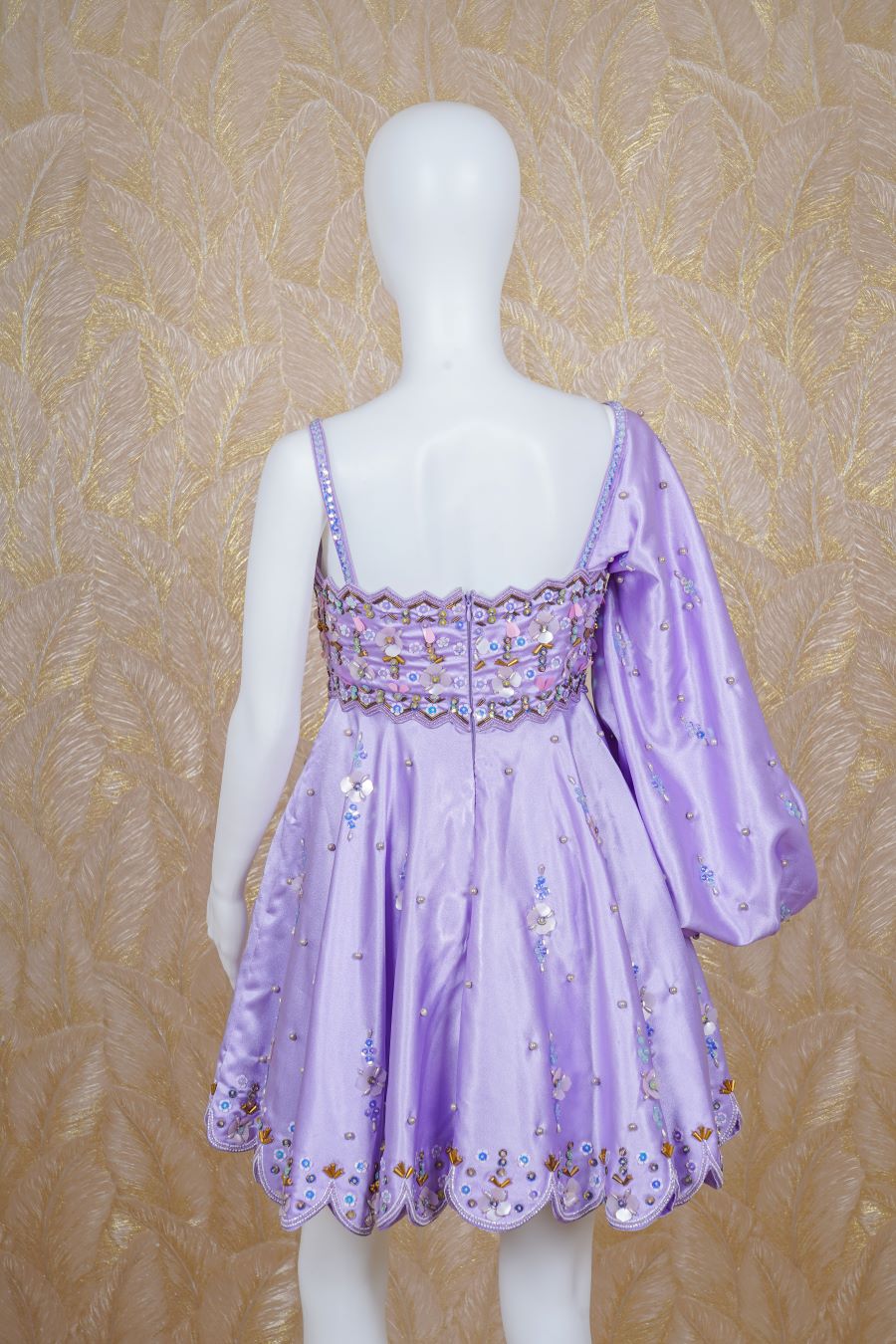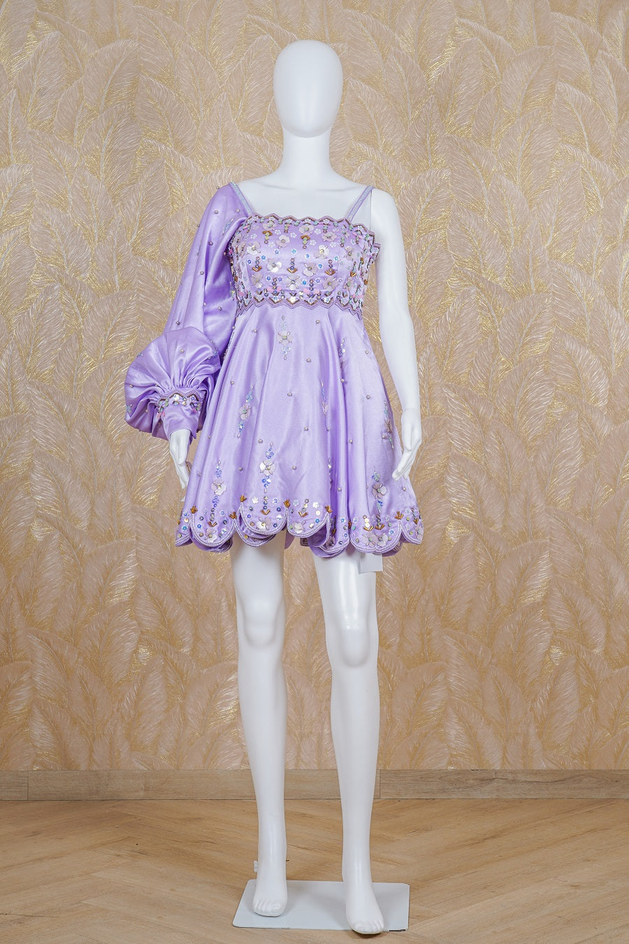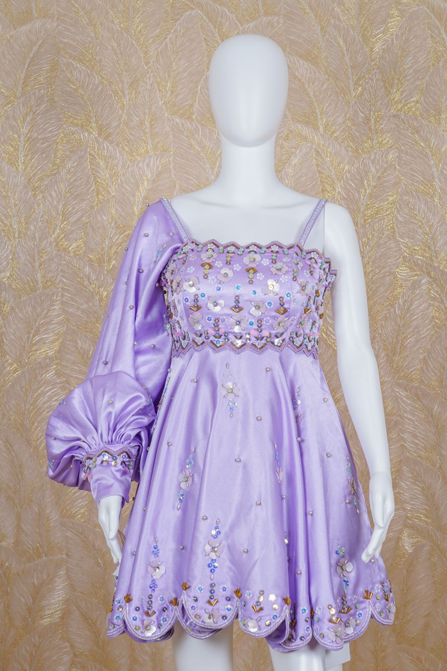 Lilac, One-shoulder short dress handcrafted with pearls, beads, kardana, salli and sequins, finished with a scallop look. Model is wearing size, “Medium”.