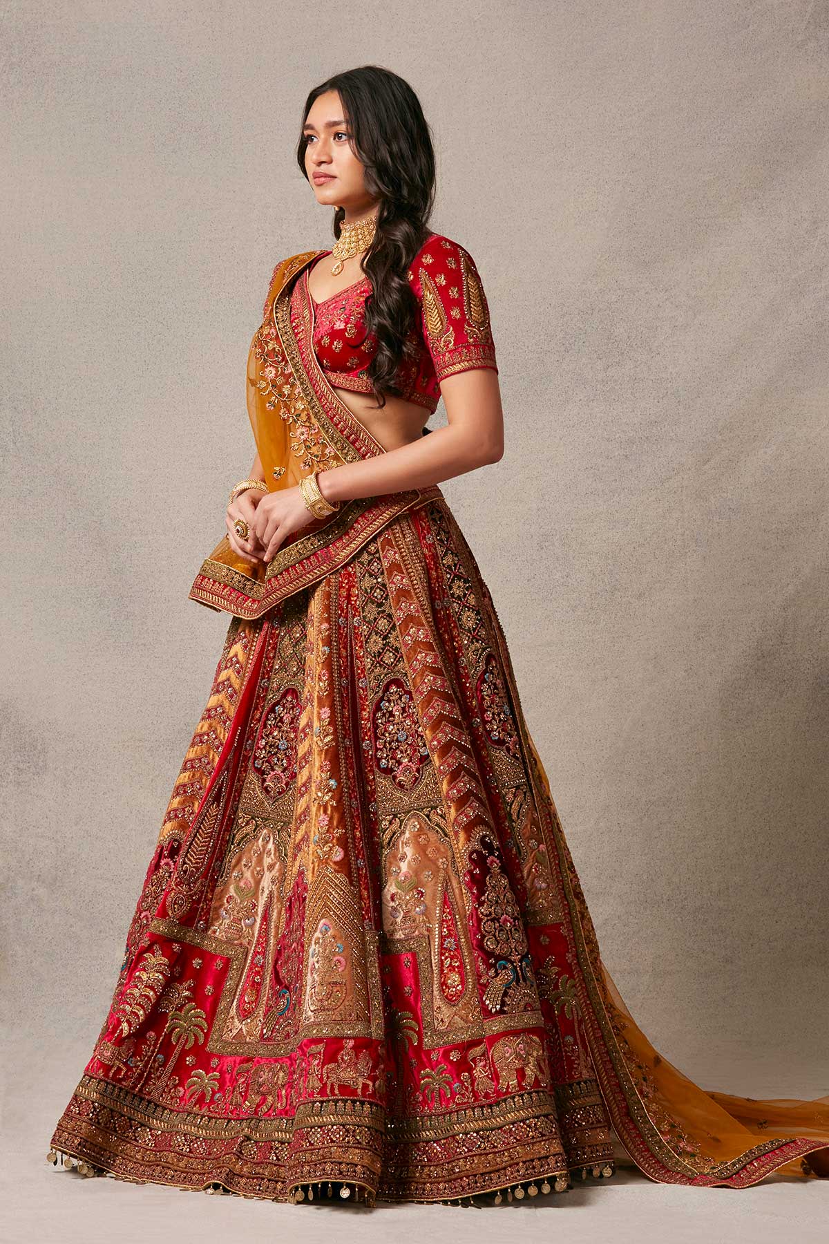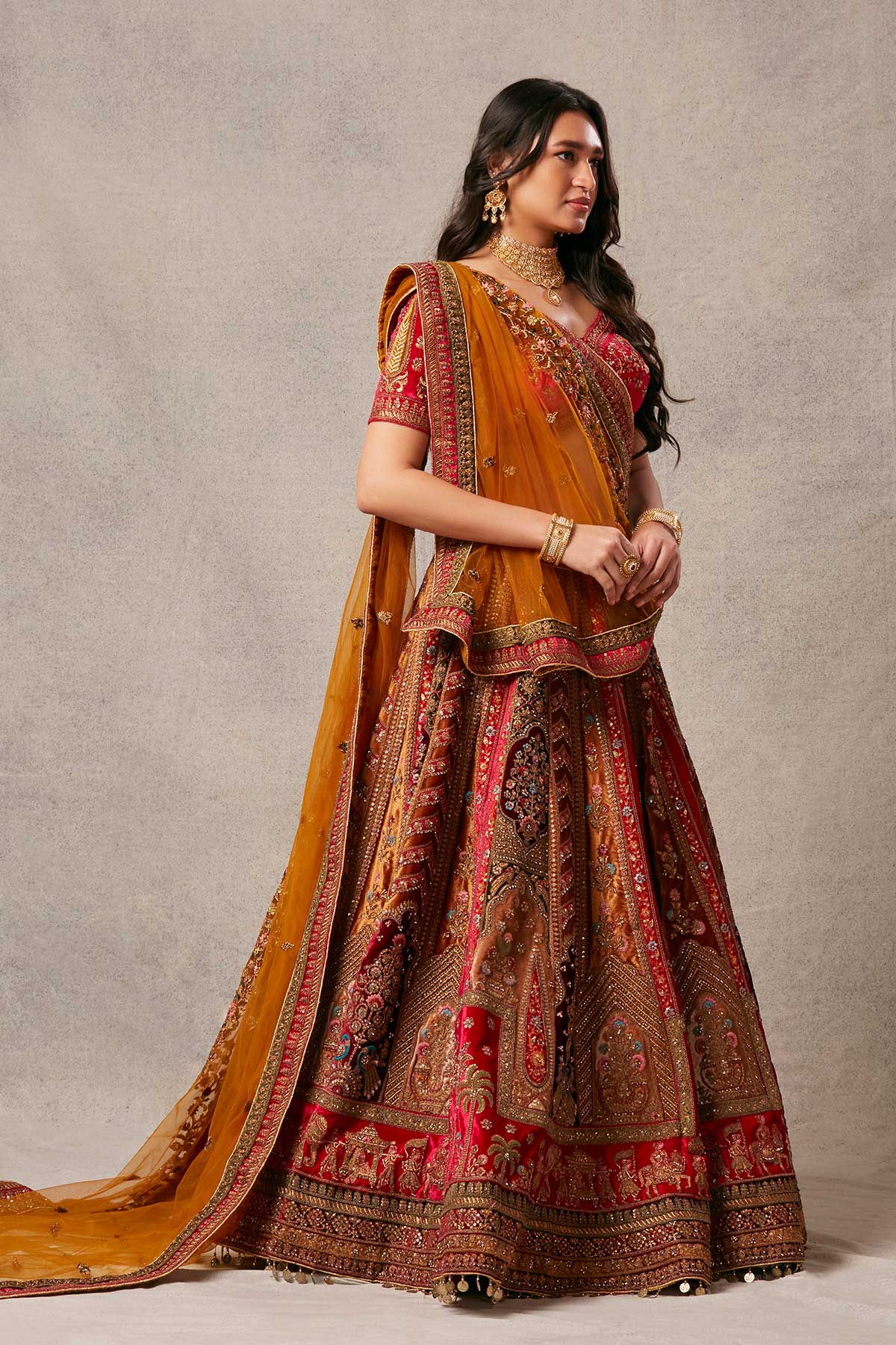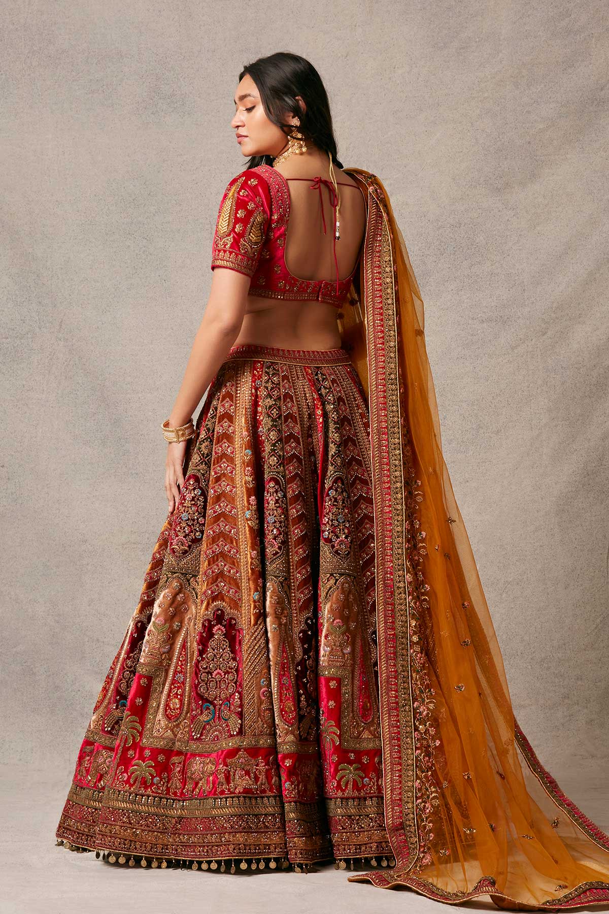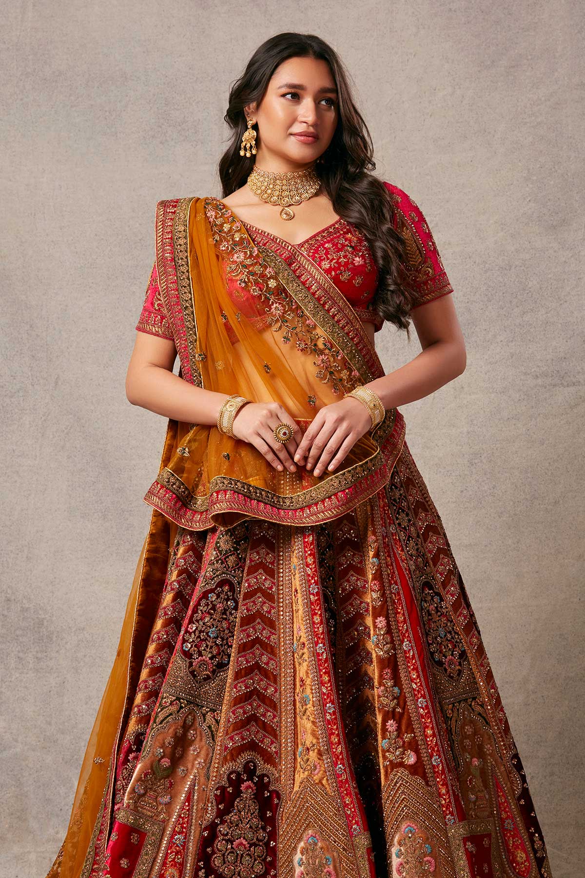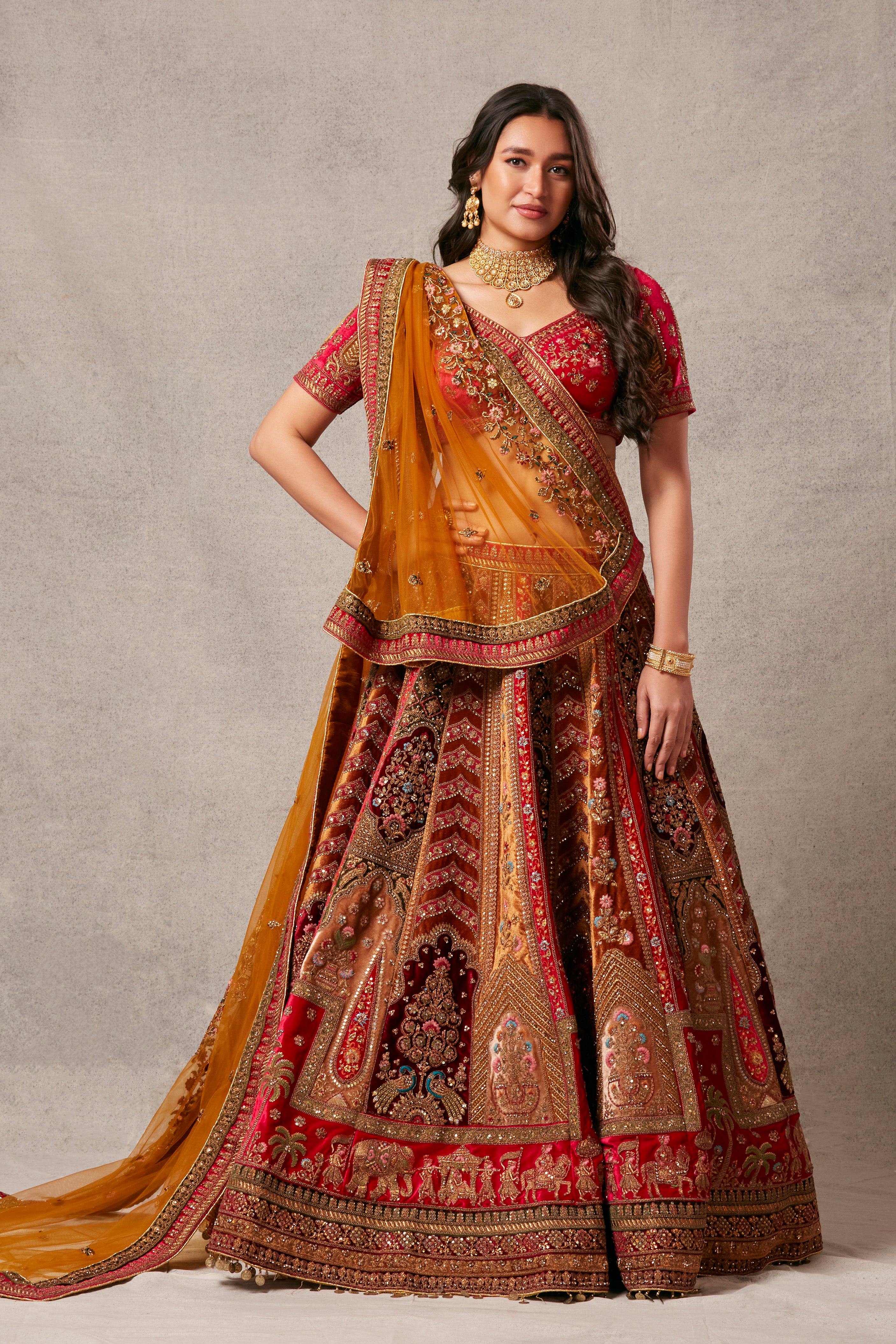 A sumptuous velvet lehenga adorned with a kaleidoscope of colors, intricately embellished with zari work and sparkling stones that radiate elegance.