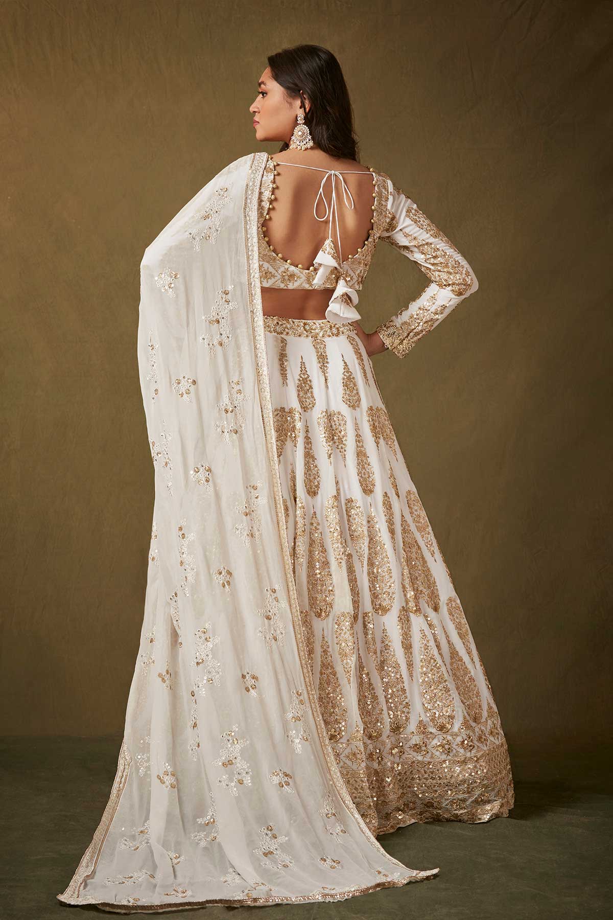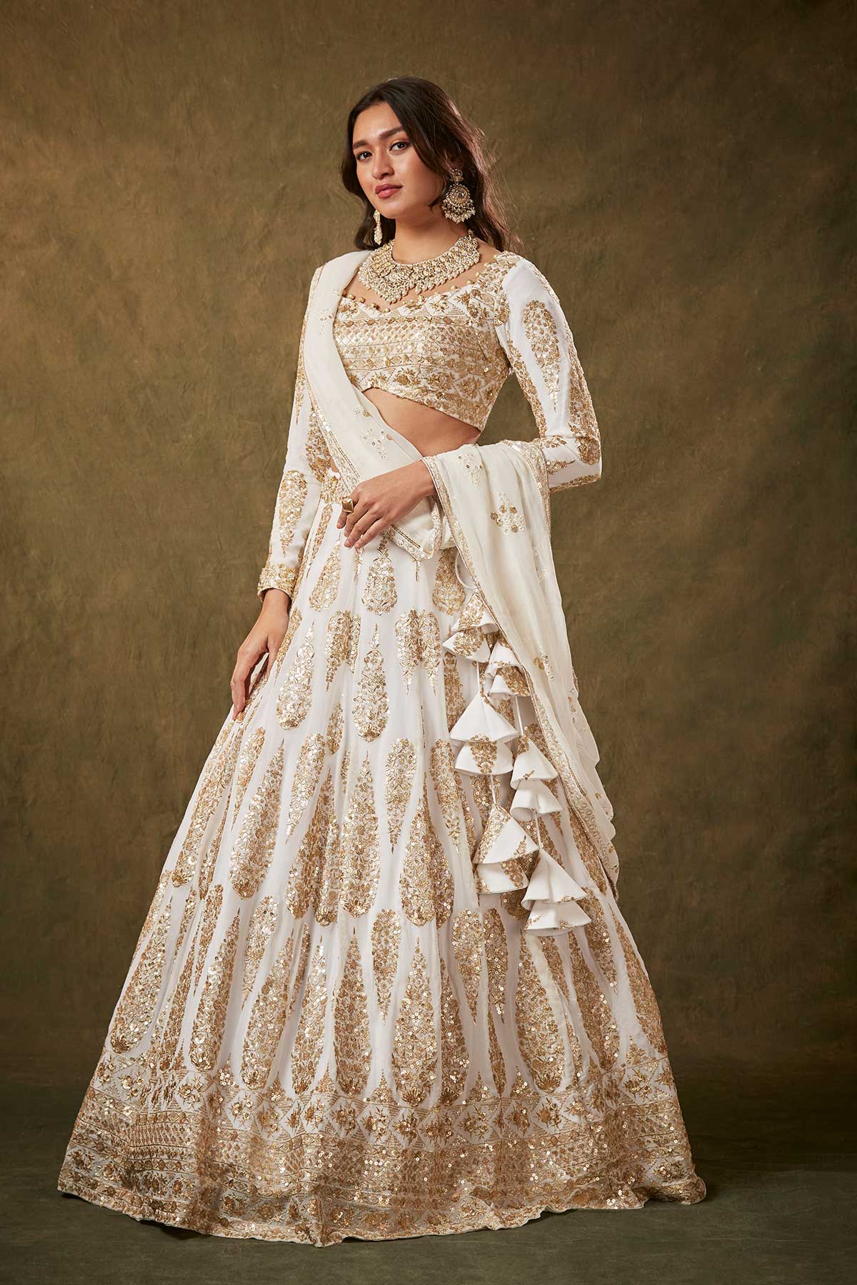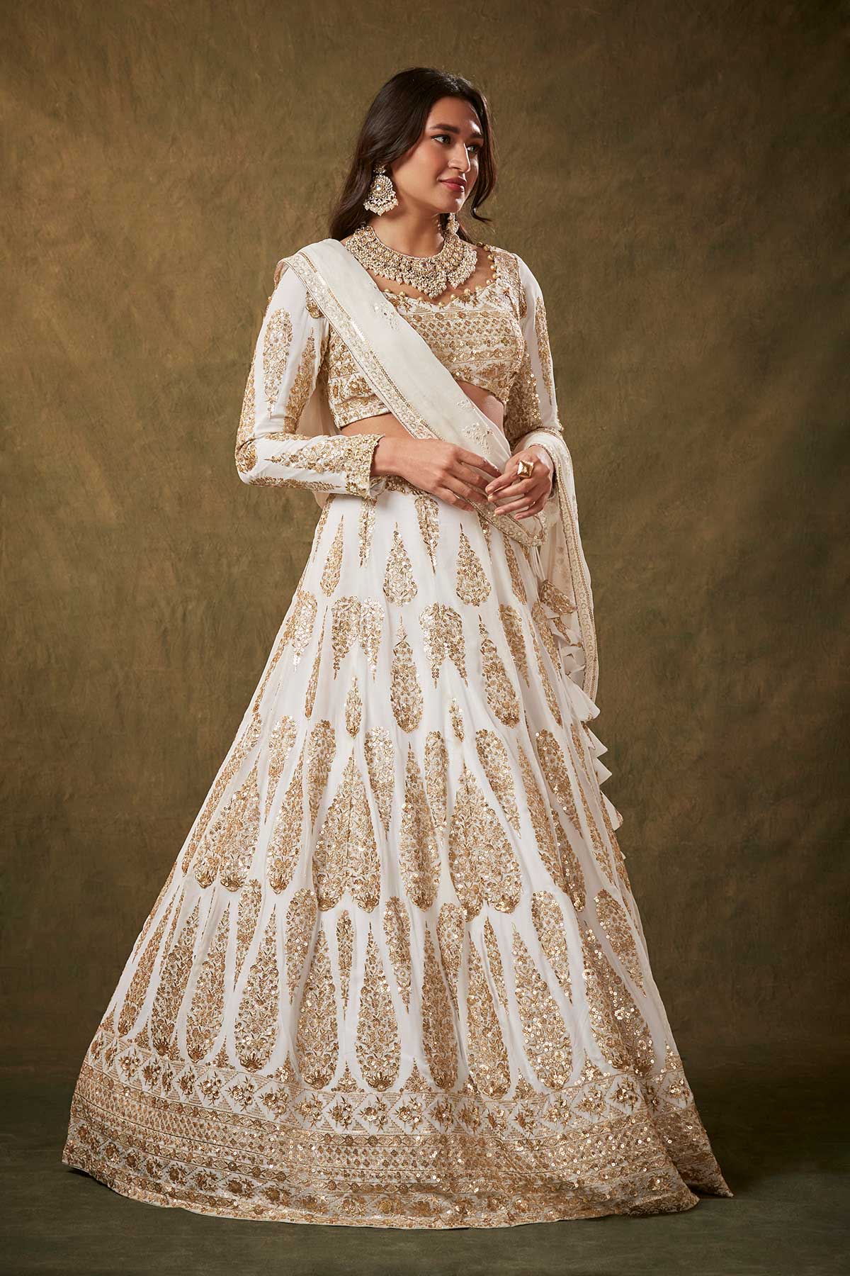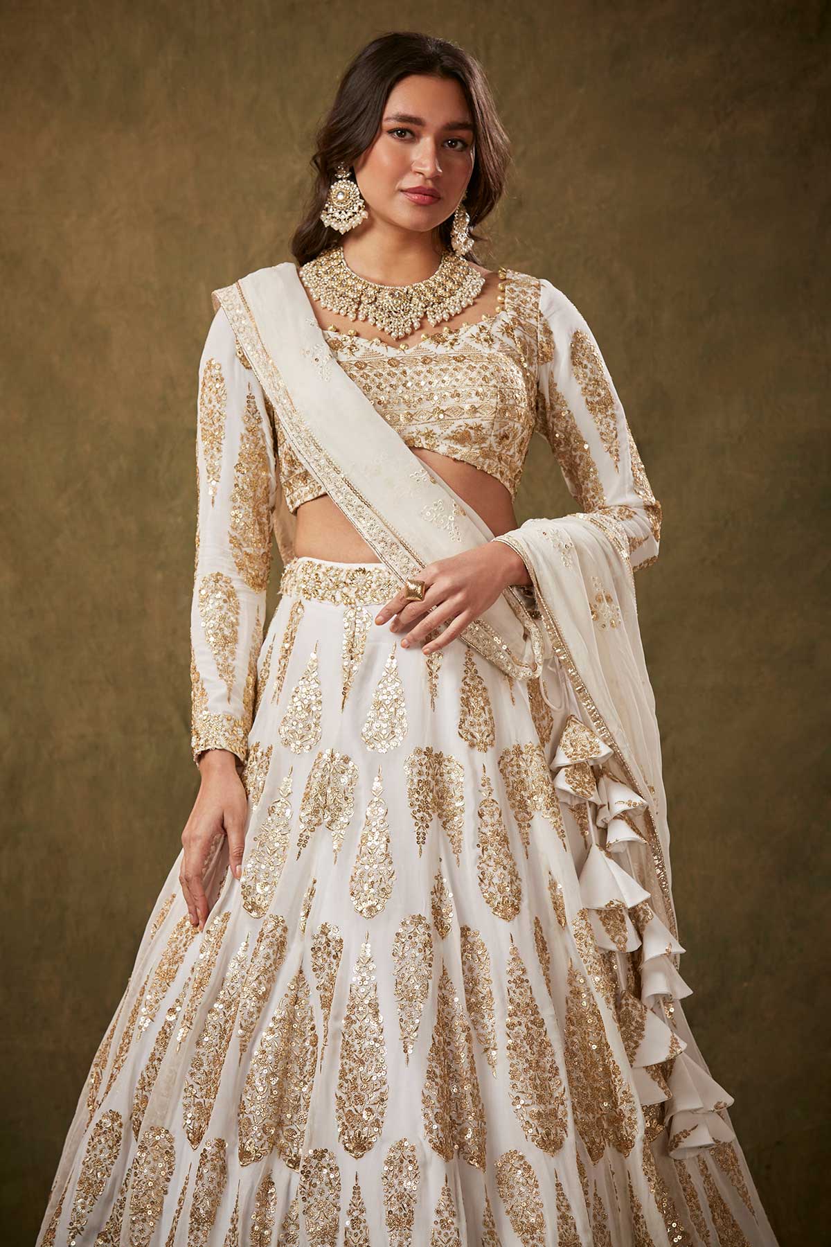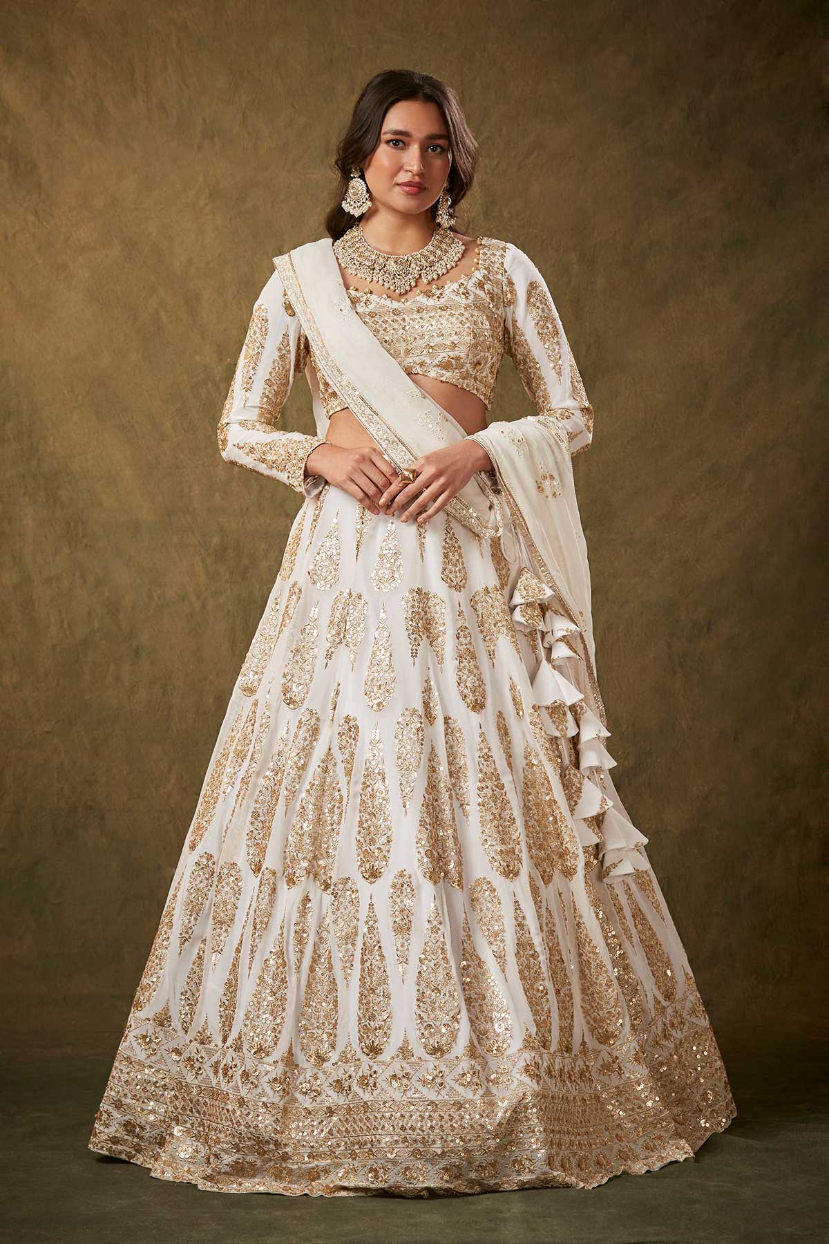 A stunning lehenga adorned with exquisite sequence gold drop work and a lavish gold border and net dupatta.