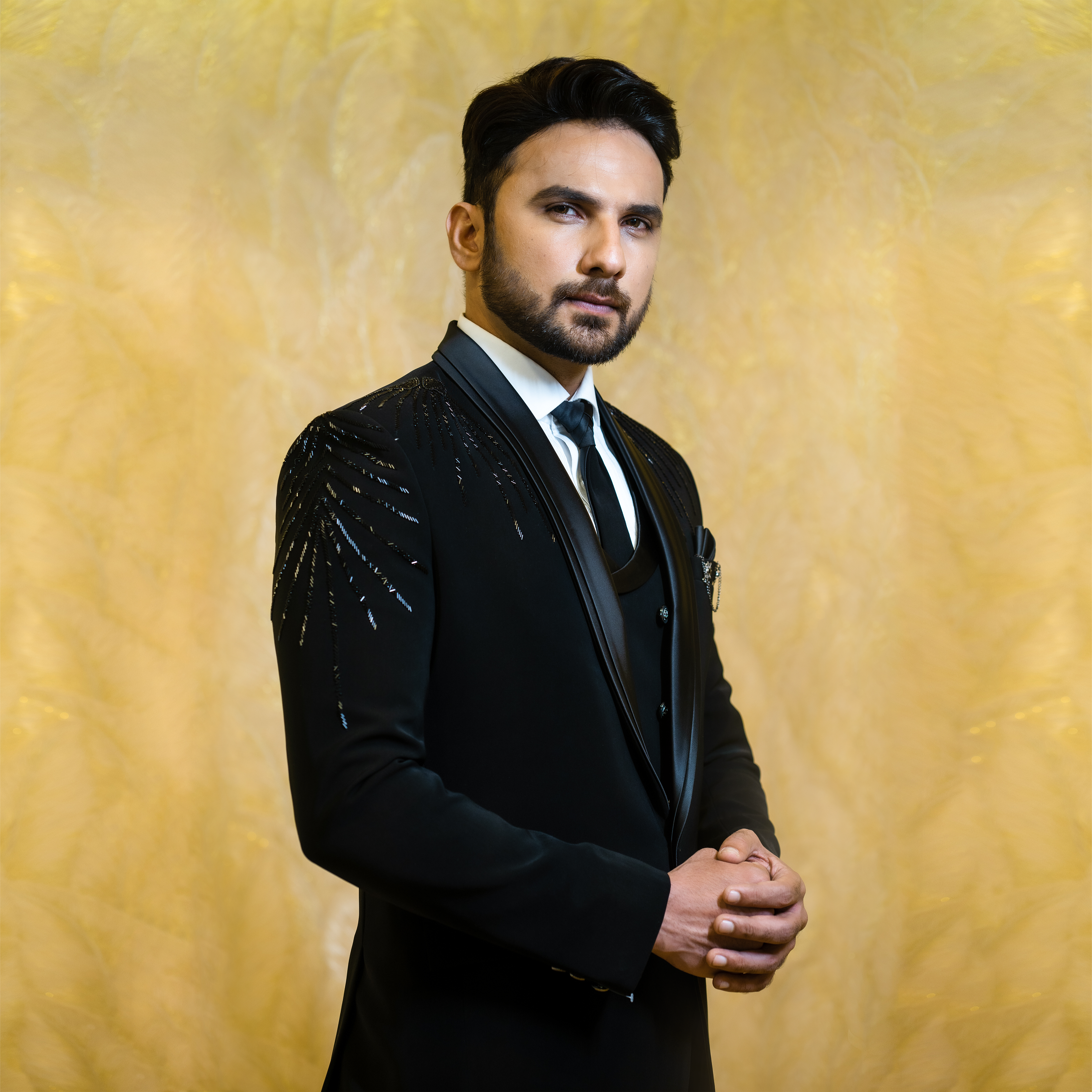 This exquisite black blazer suit set, adorned with stunning salli work, exudes an air of sophistication and elegance.