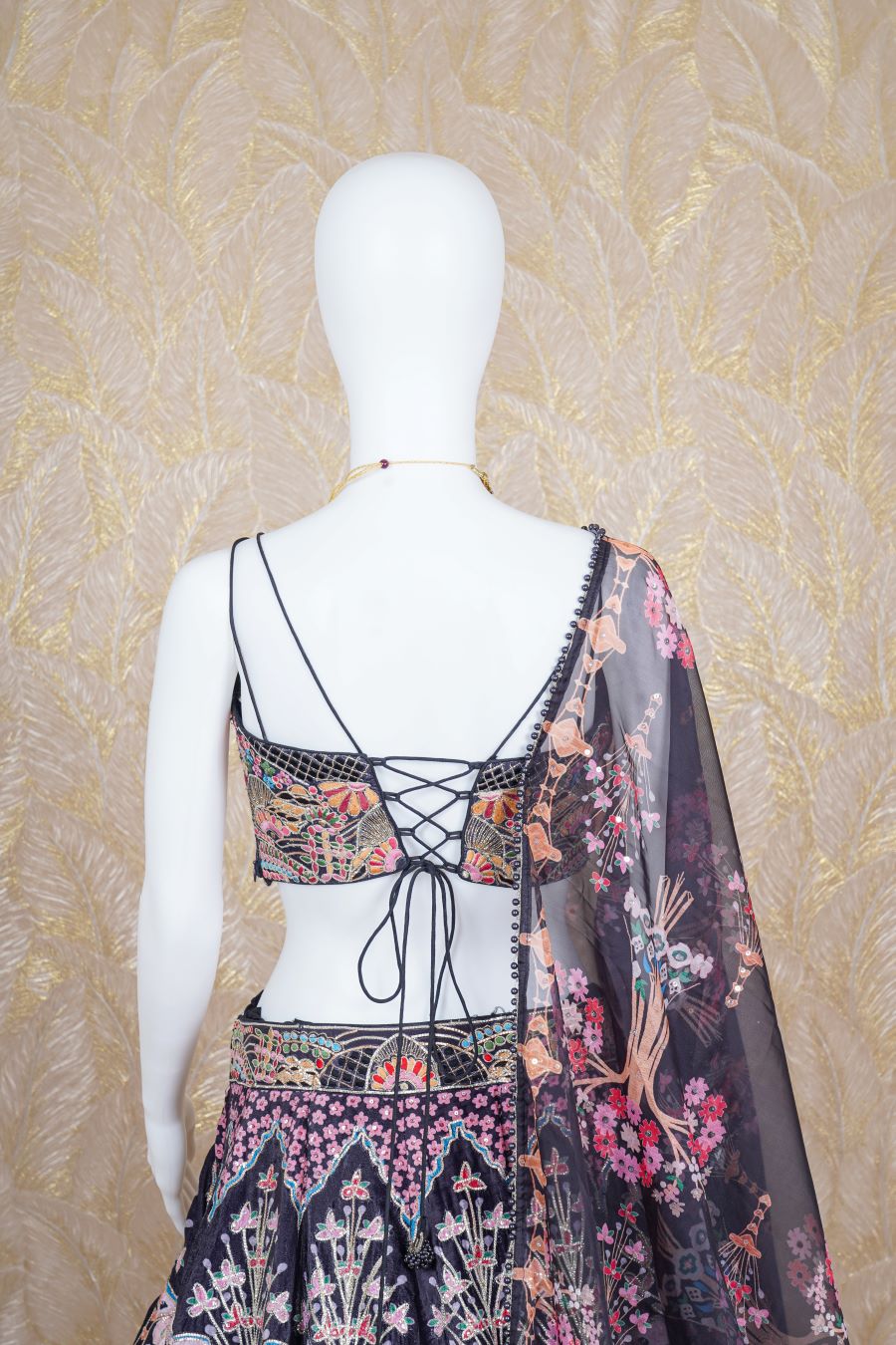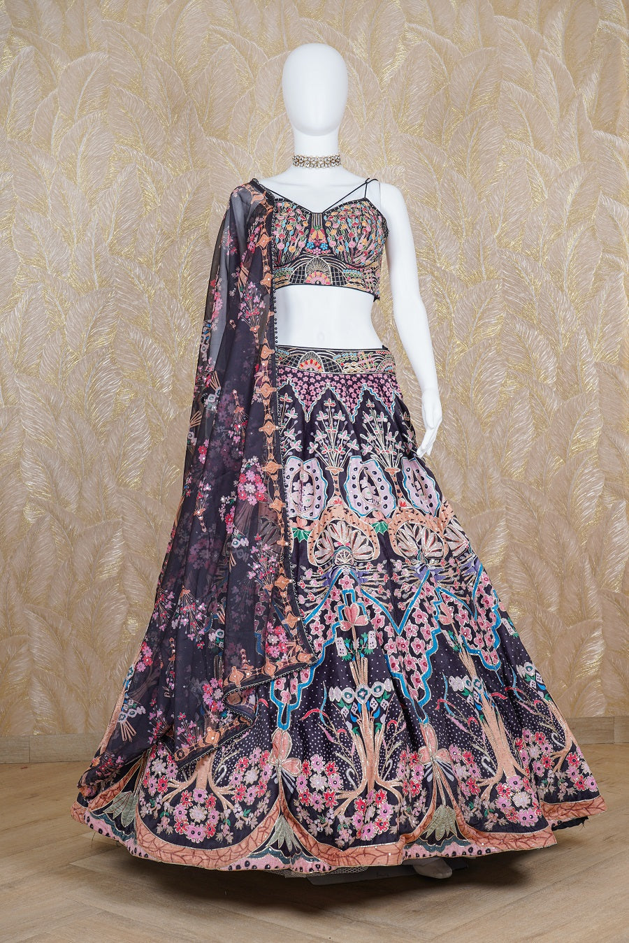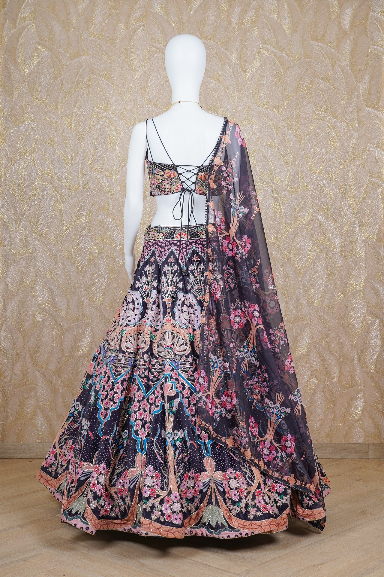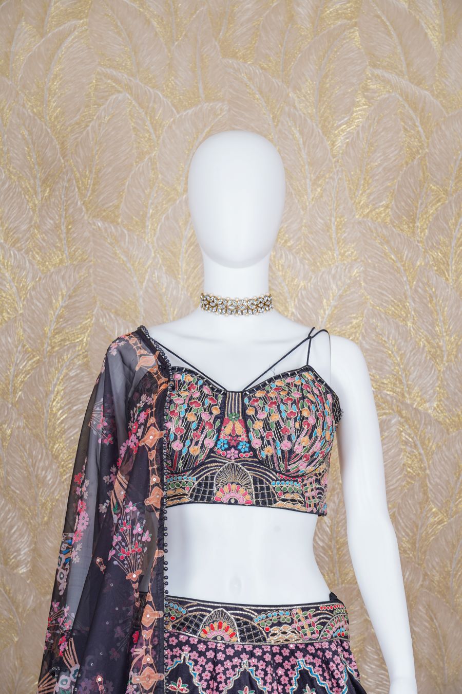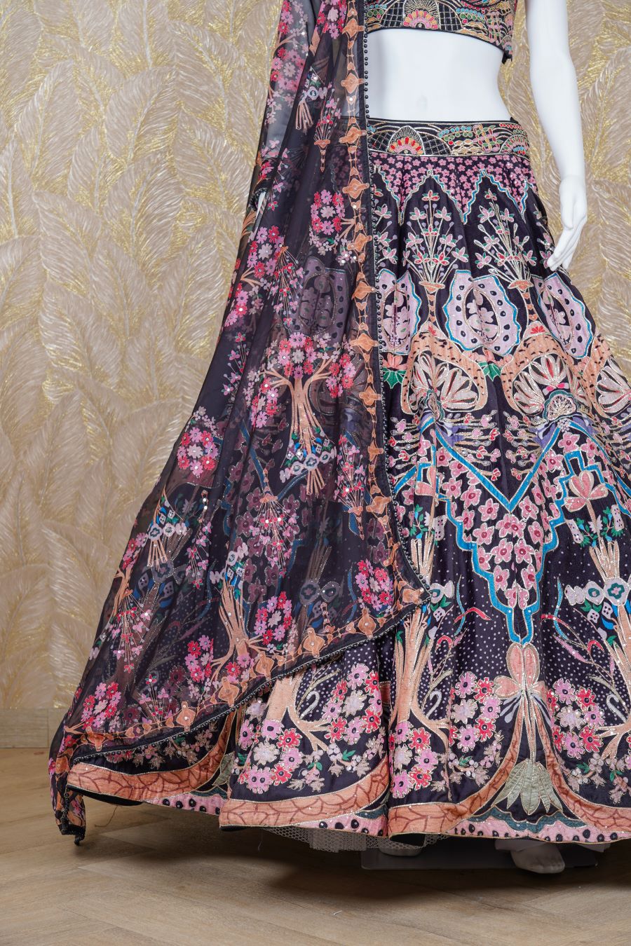 Black Multicolor Velvet Digital print lehenga adorned with resham, sequins, fine dori and pearls highlighted work. The lehenga is styled with a handcrafted blouse and a printed organza dupatta. Model is wearing size, “Medium”.