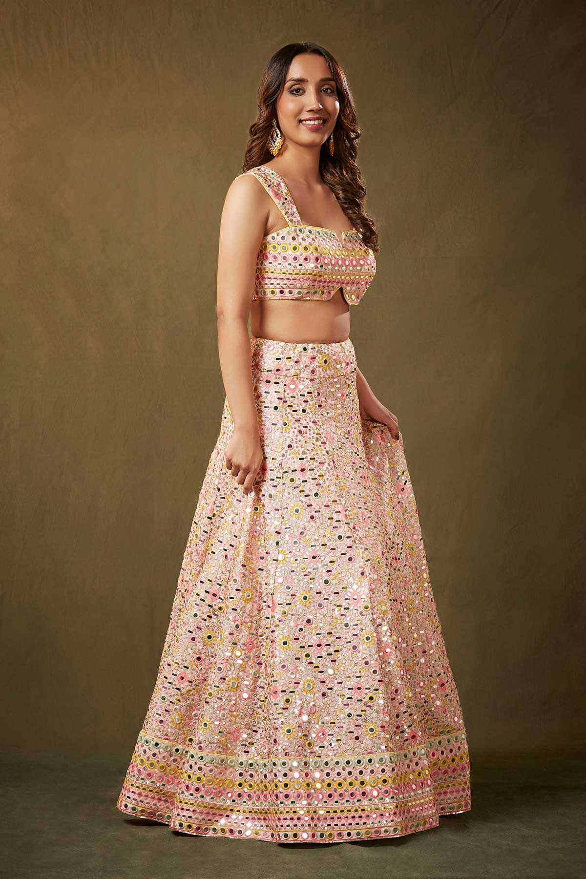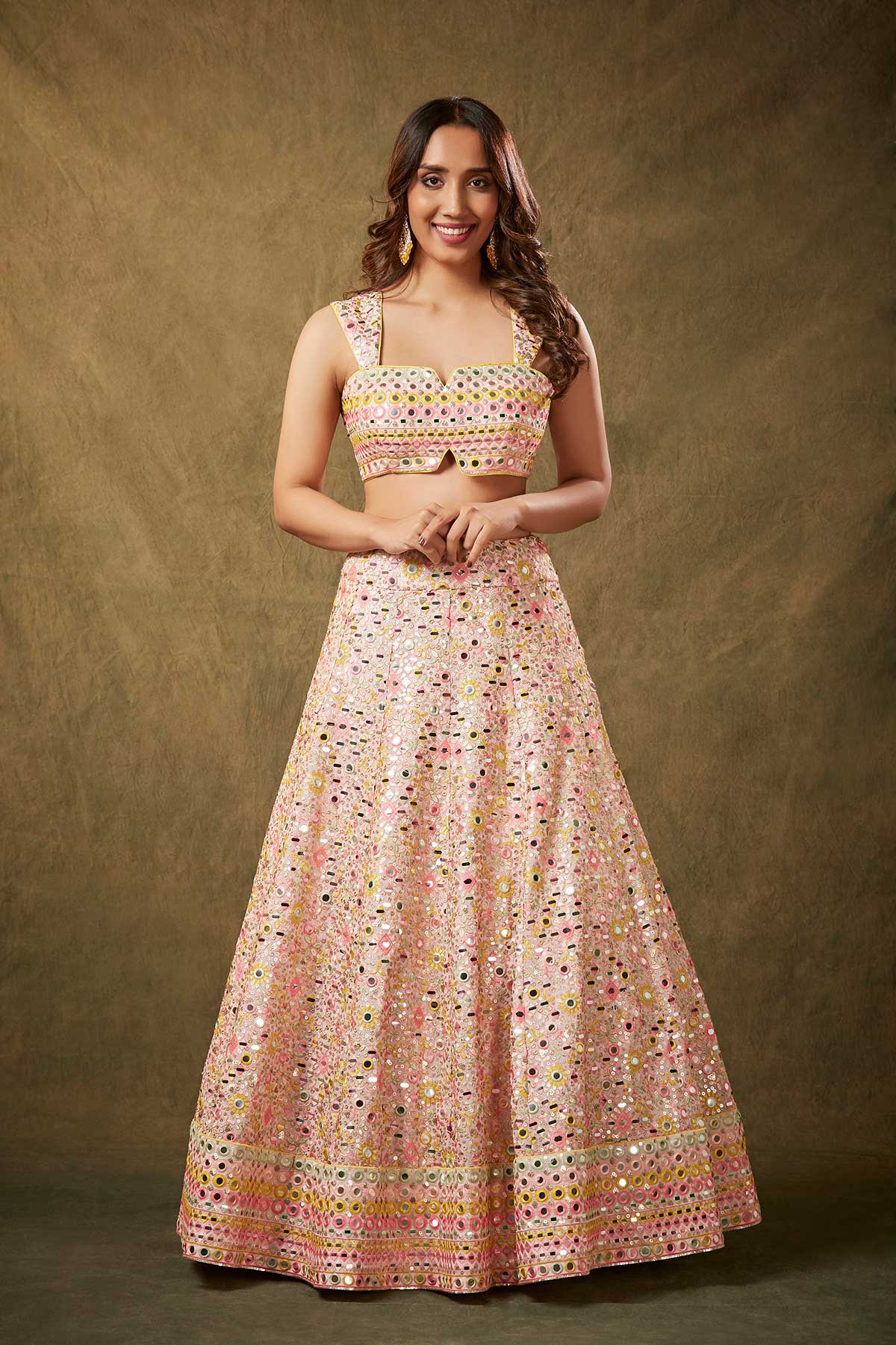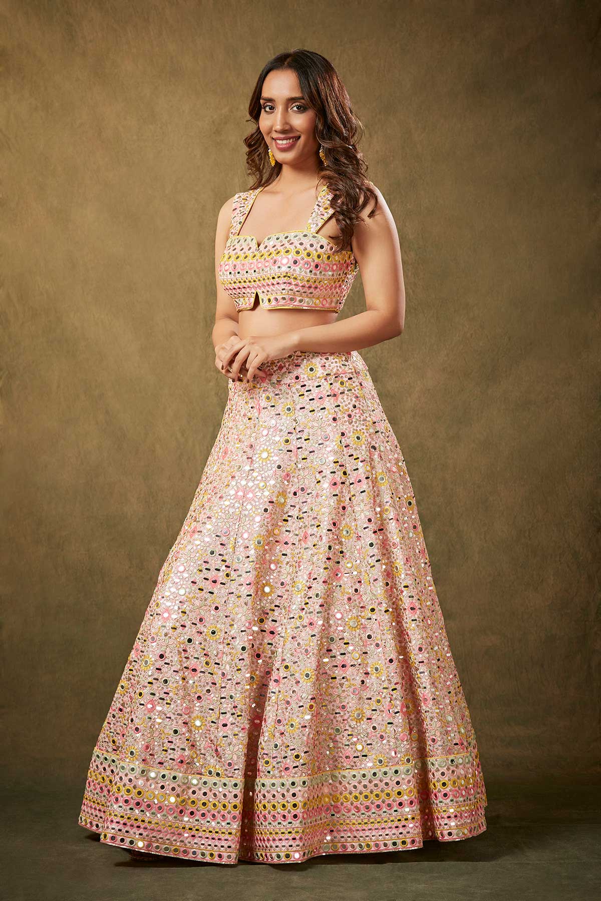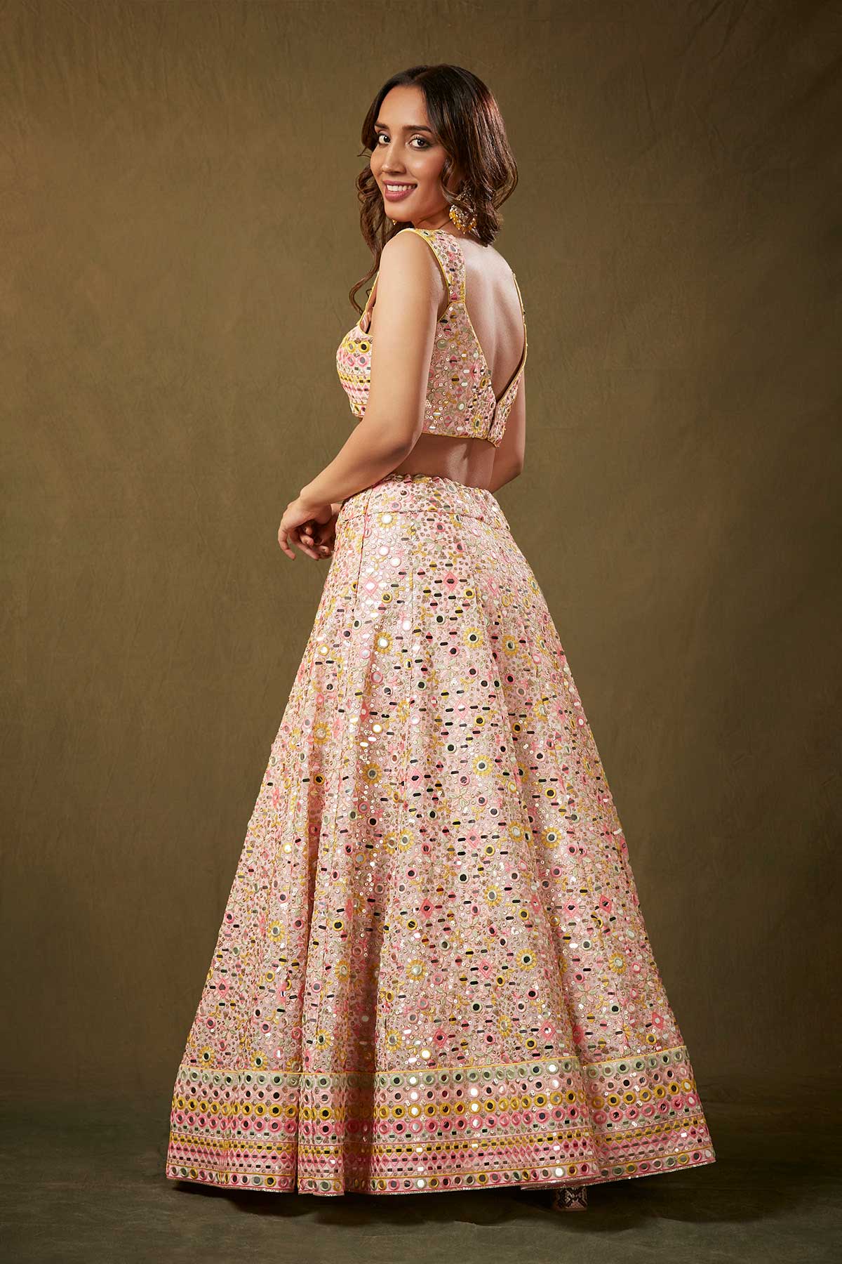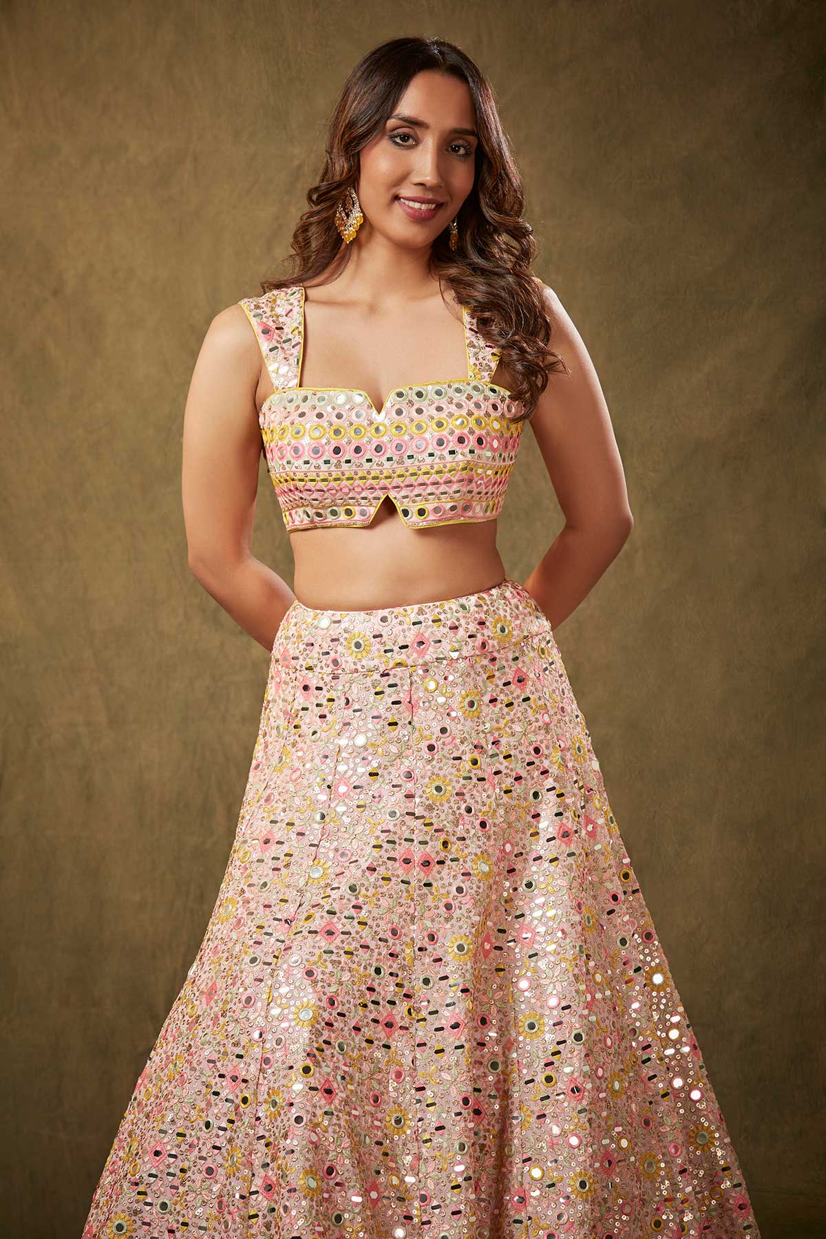 A stunning, colour rich lehenga adorned with intricate mirror work, evoking the warmth and brilliance of a sunlit day.