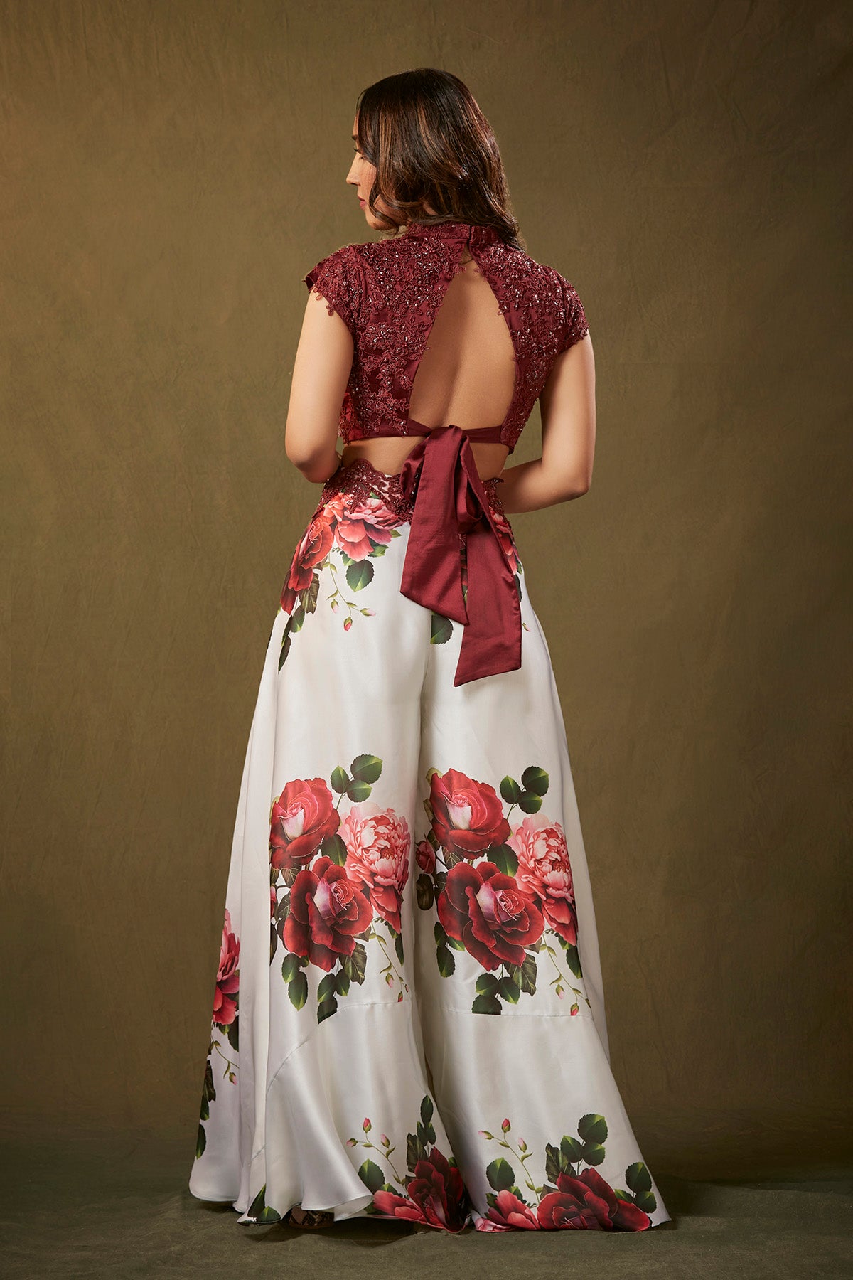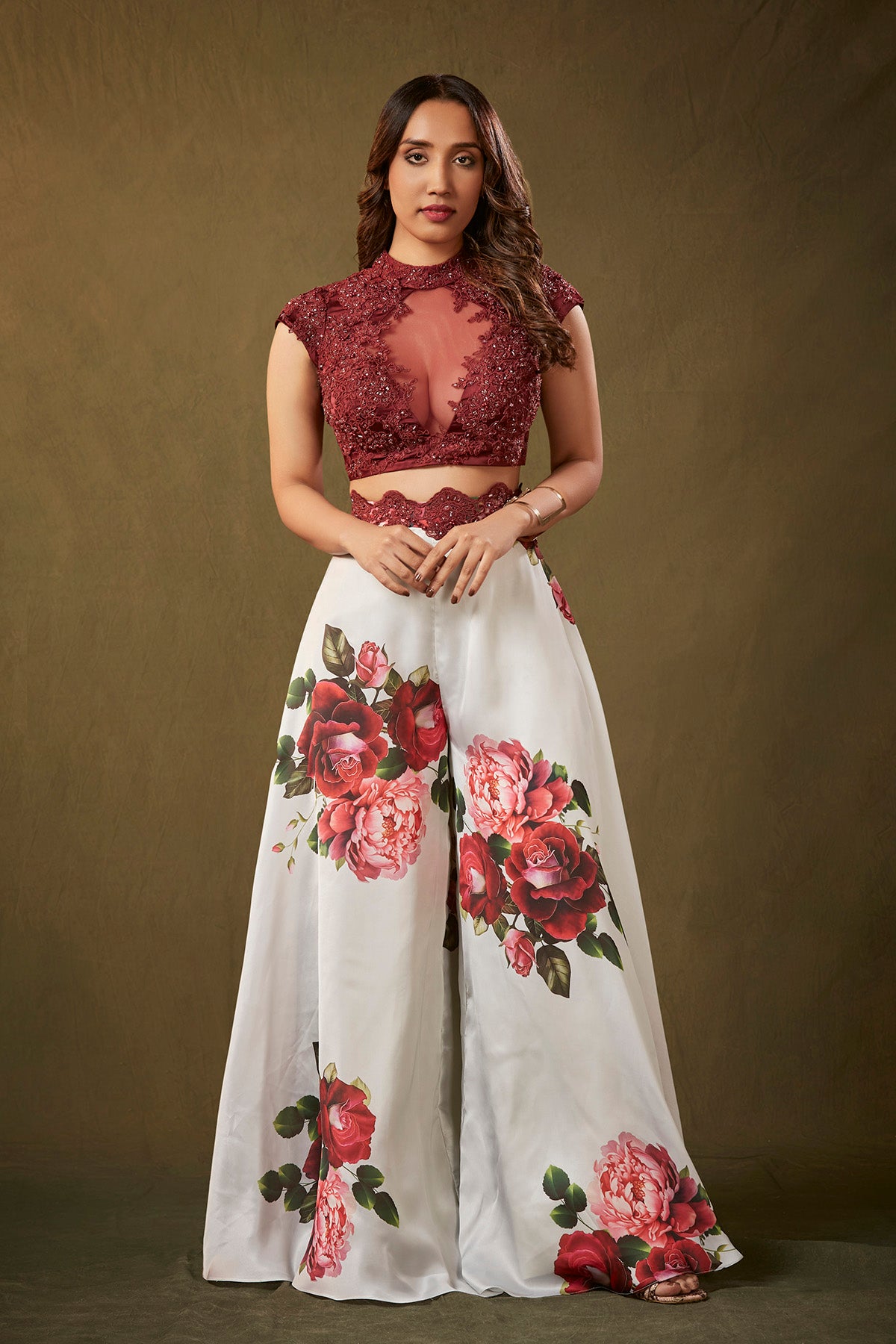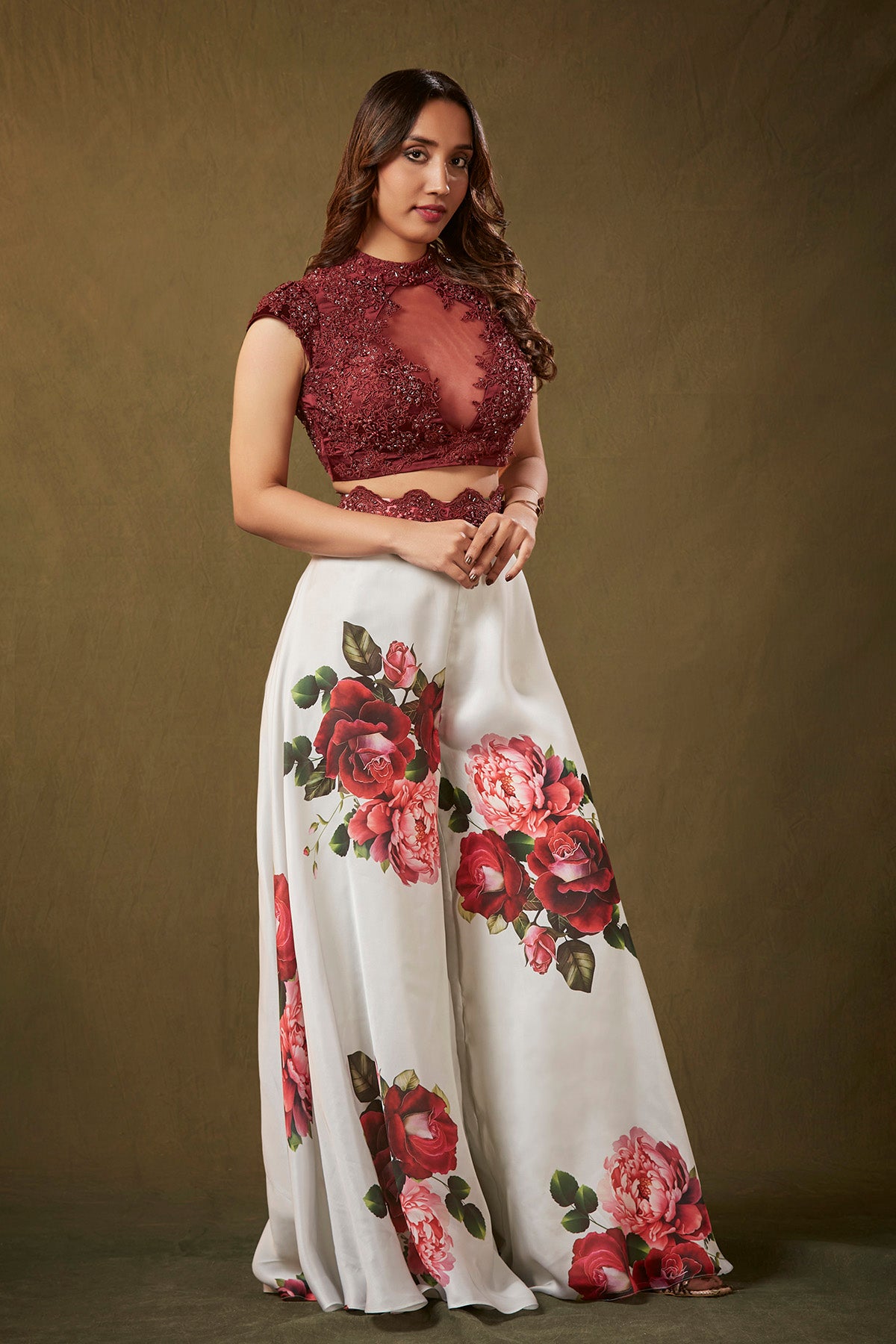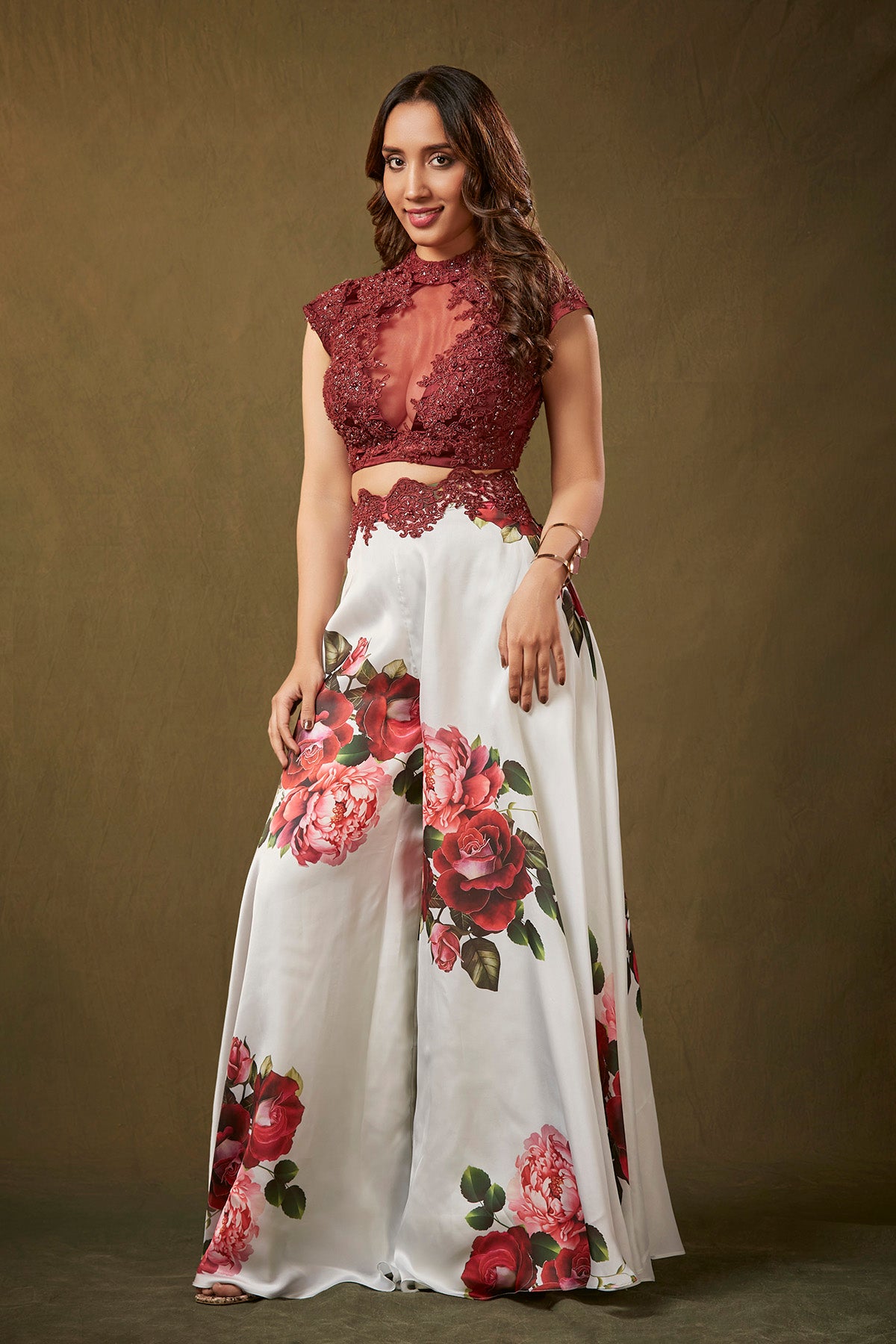 This beautiful ensemble features a satin georgette plazo embellished with intricate digital prints and delicate handwork on the blouse.