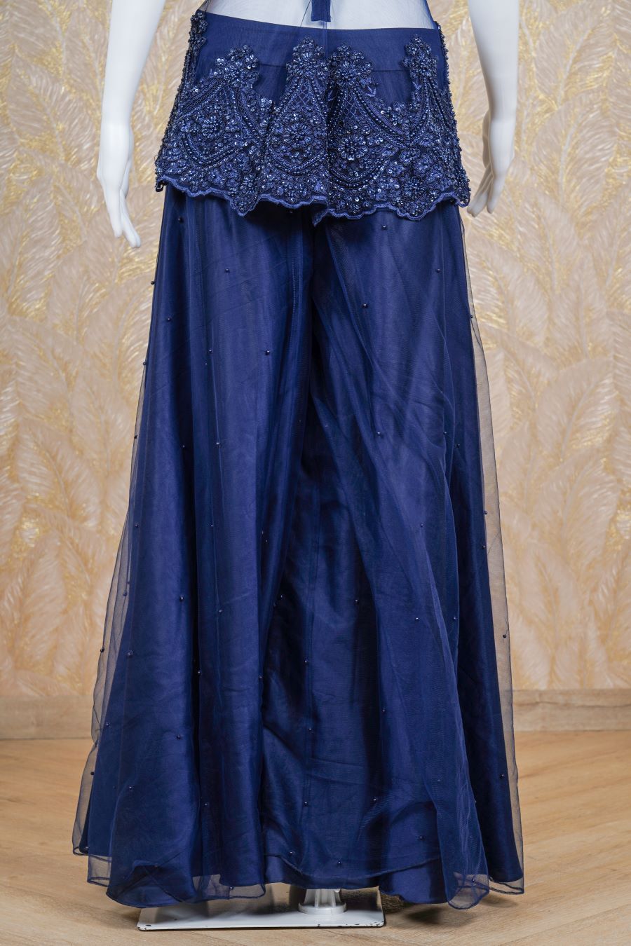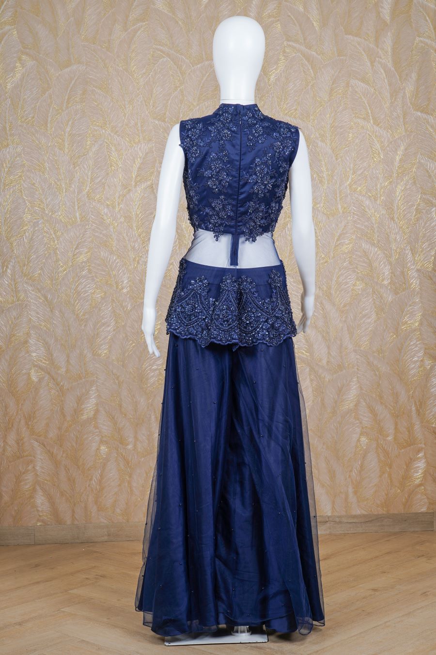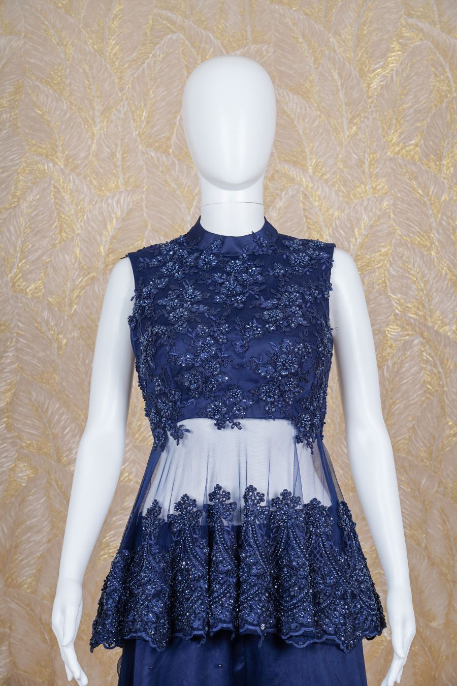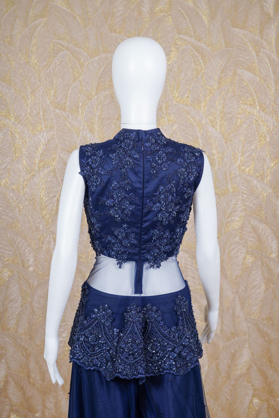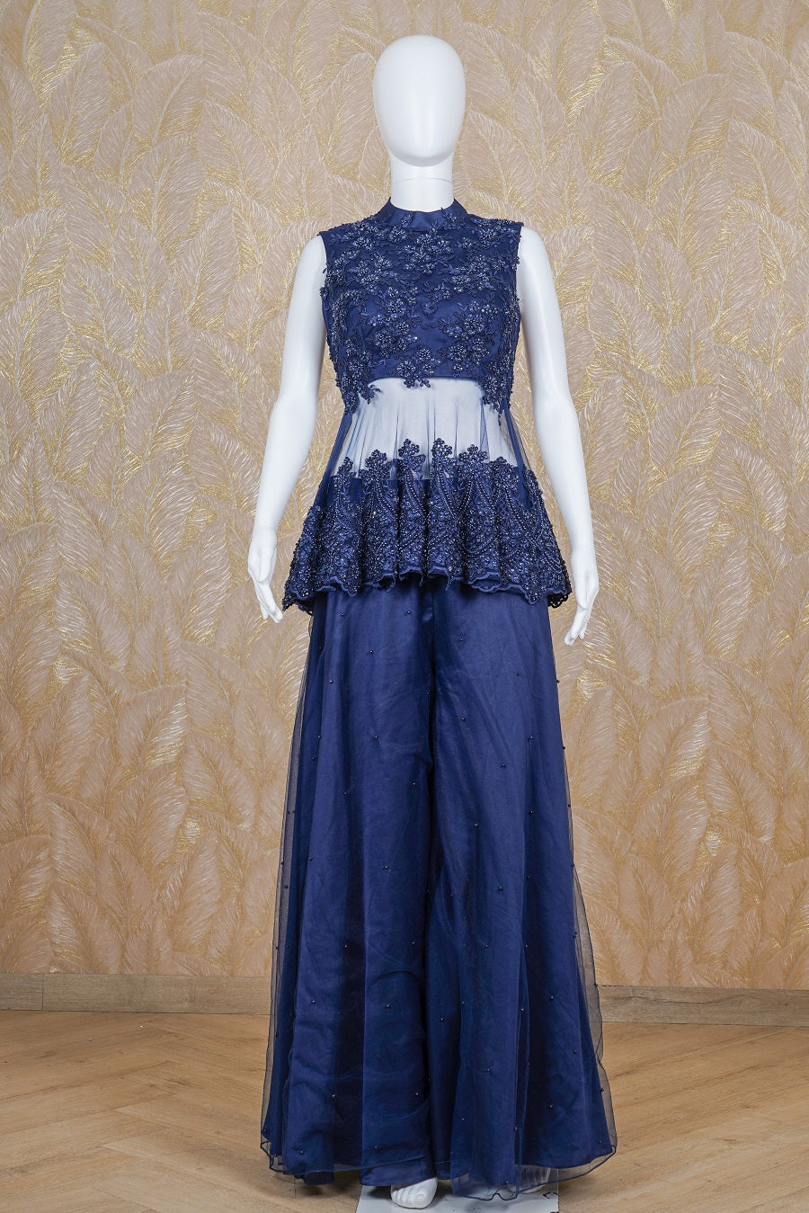 Navy blue, Peplum finished with sequins, kardana, pearls and thread embroidered patchwork, styled with palazzo pants. Model is wearing size, “Medium”.