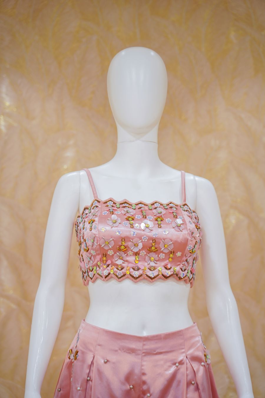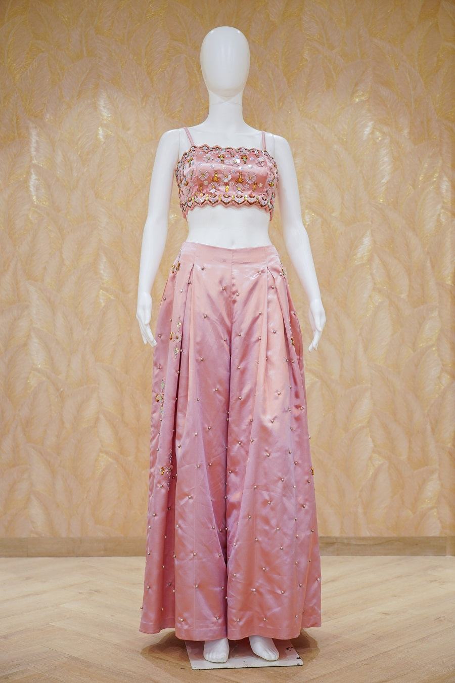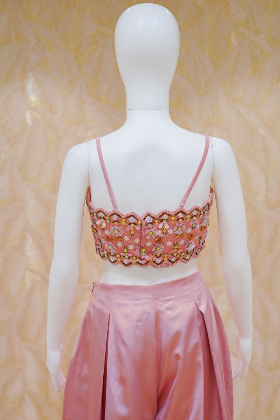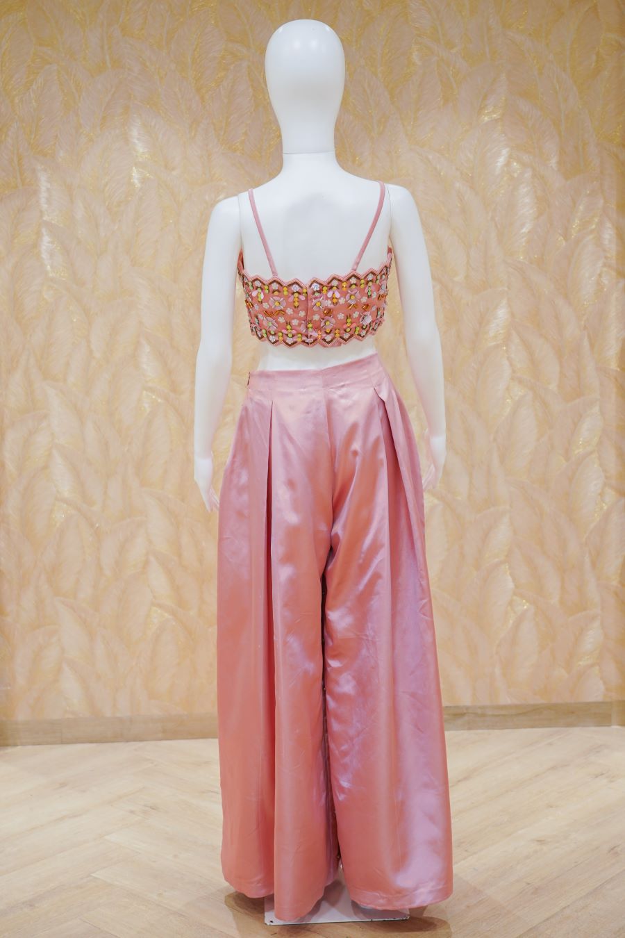 Peach, Crop top finished with sequins, kardana and pearls embroidered, Paired with matching embroidered box pants. Model is wearing size, “Medium”.