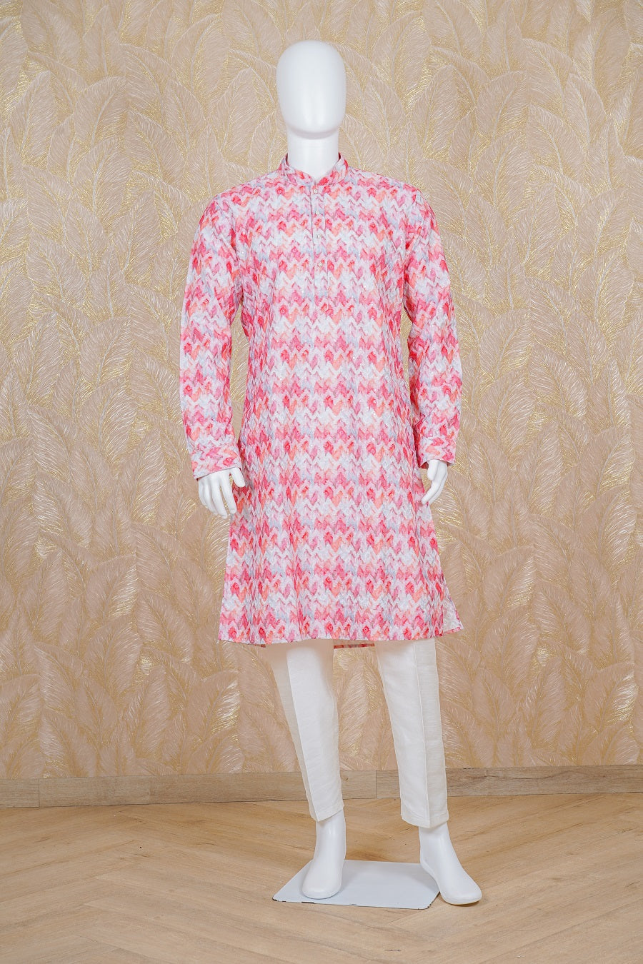 Ivory kurta with geometric thread embroidery, Styled with cotton pants. Model is wearing size, “Medium”.