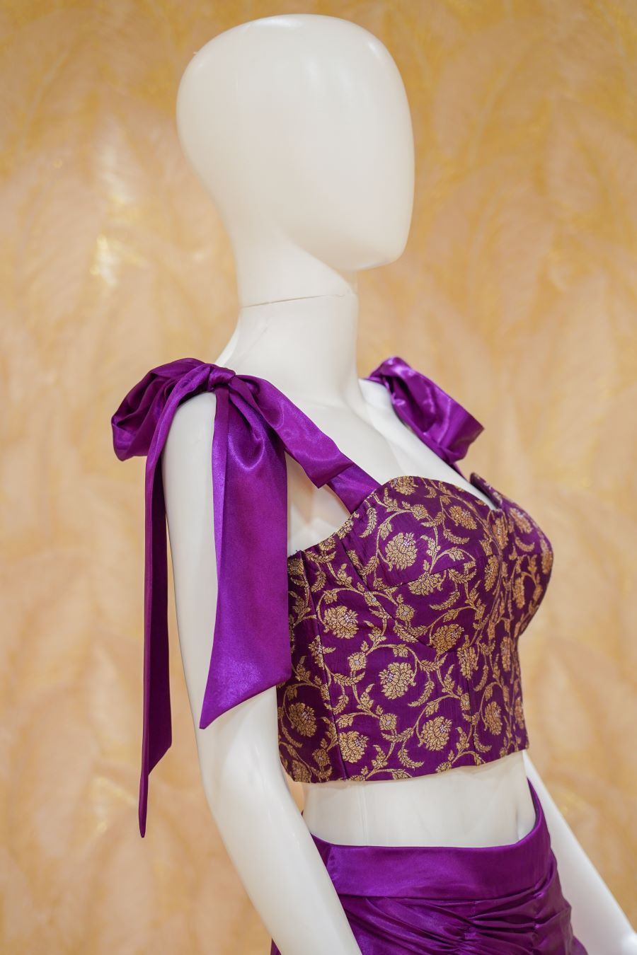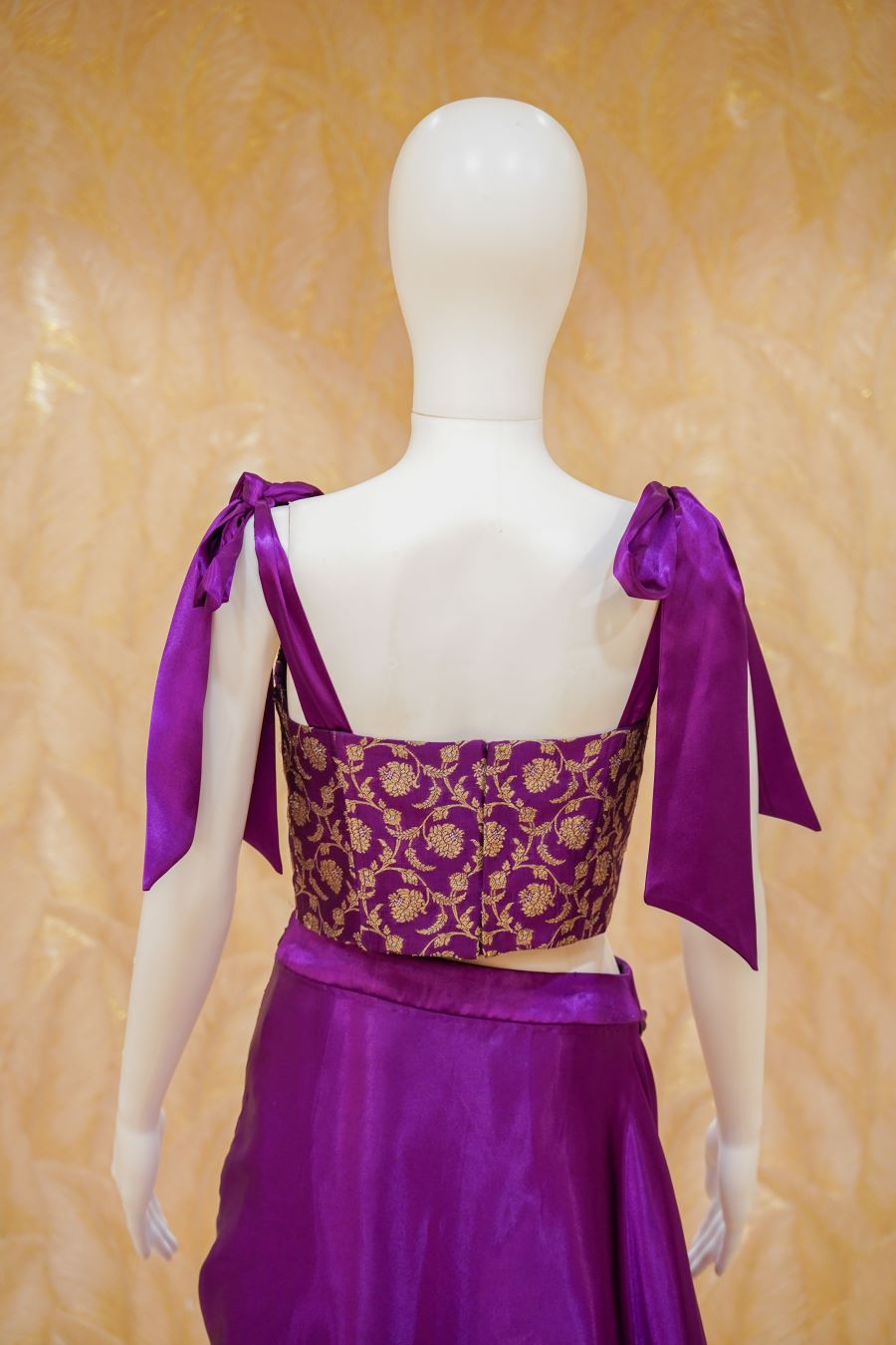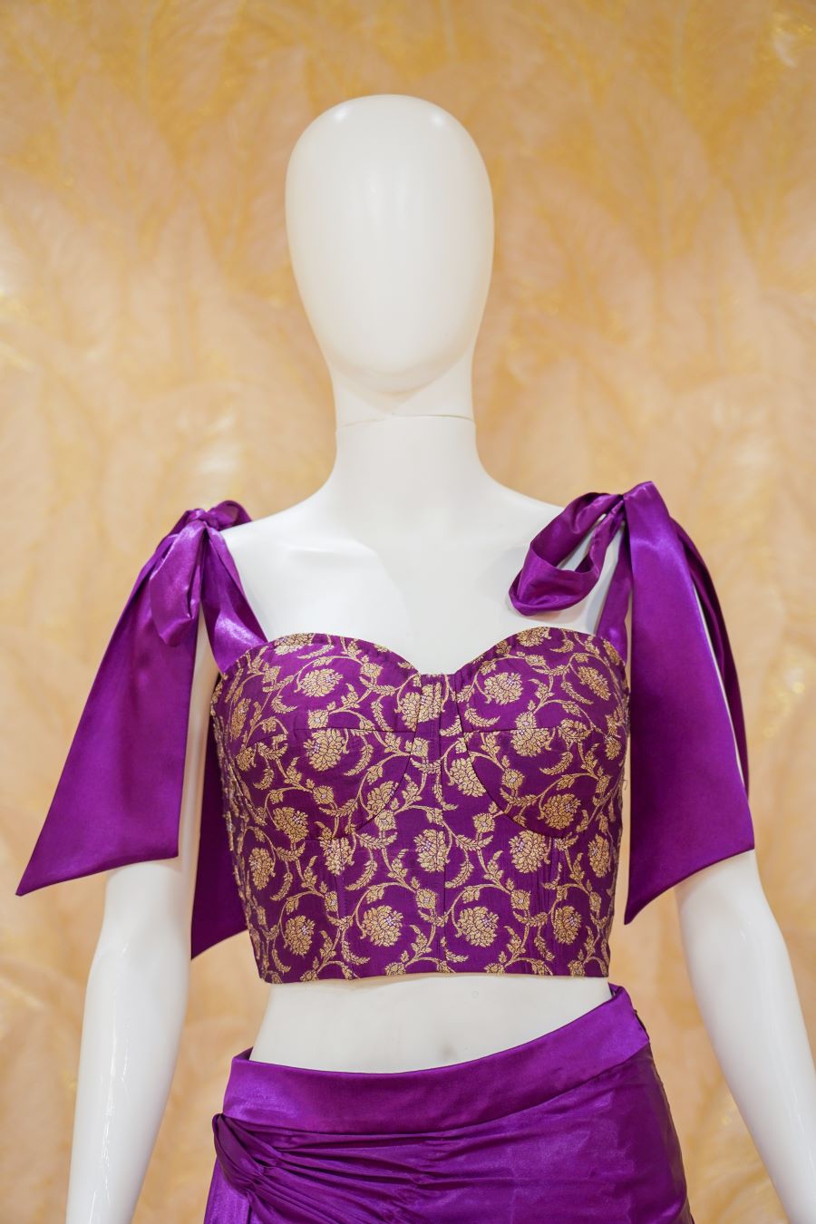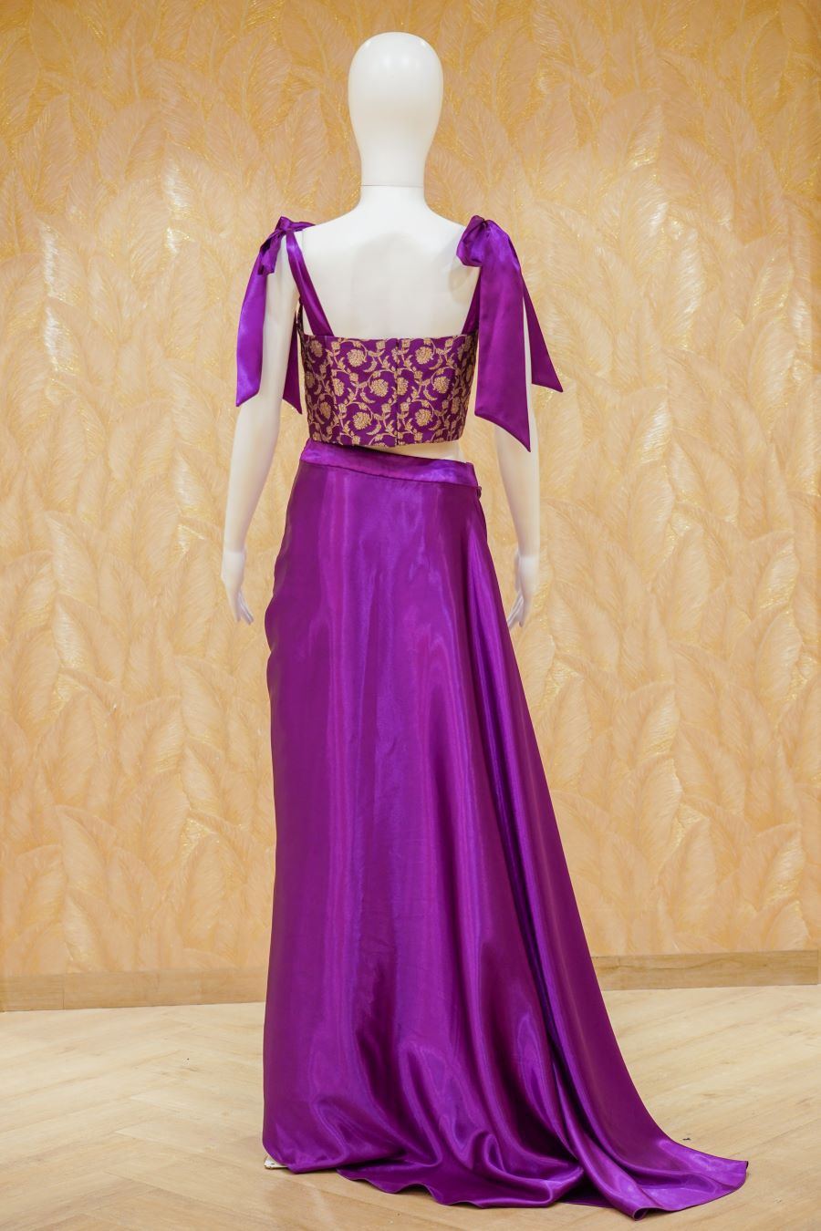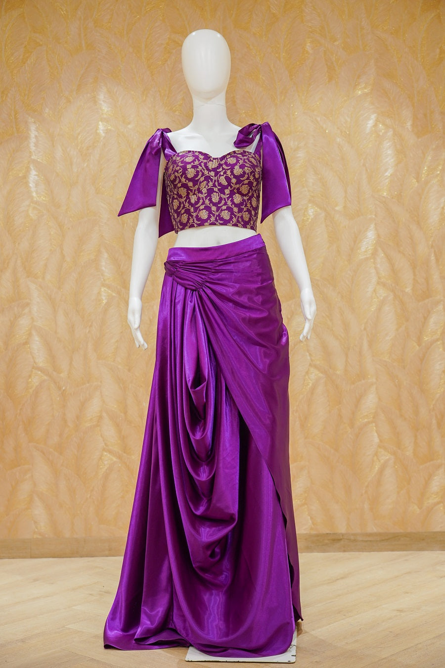 Drape skirt set comes with purple satin, banarasi brocade corset, adding to its charm. Model is wearing size, “Medium”.