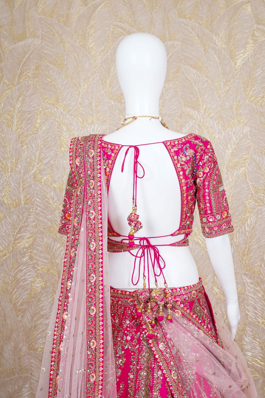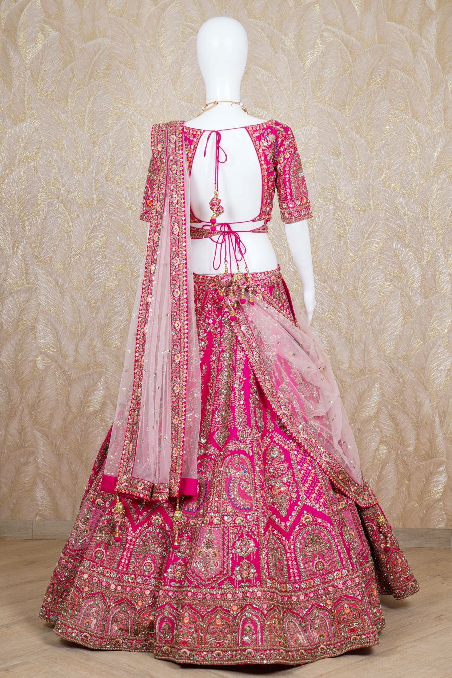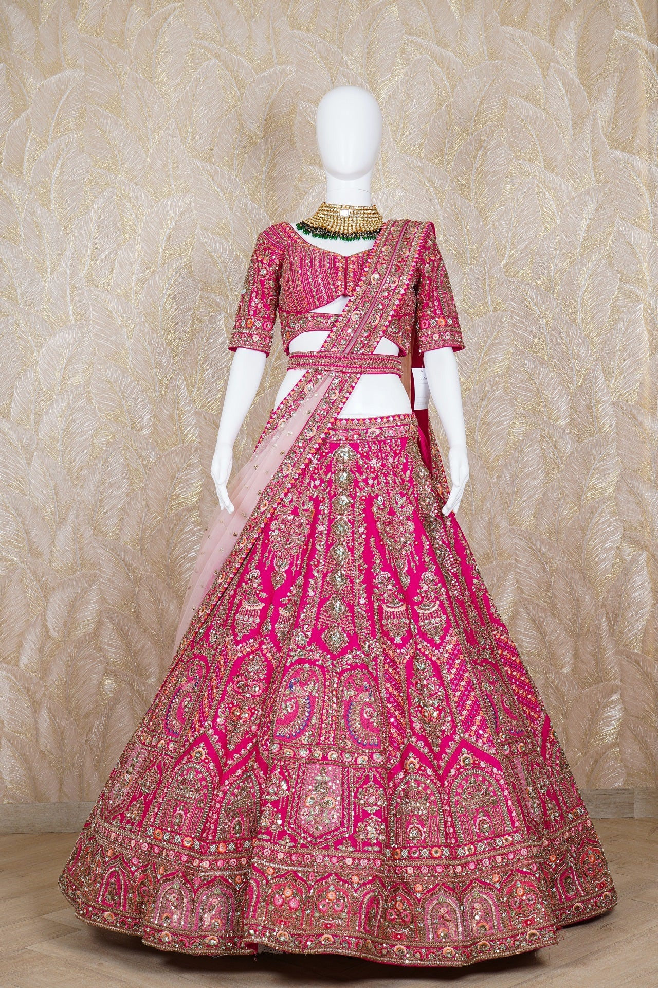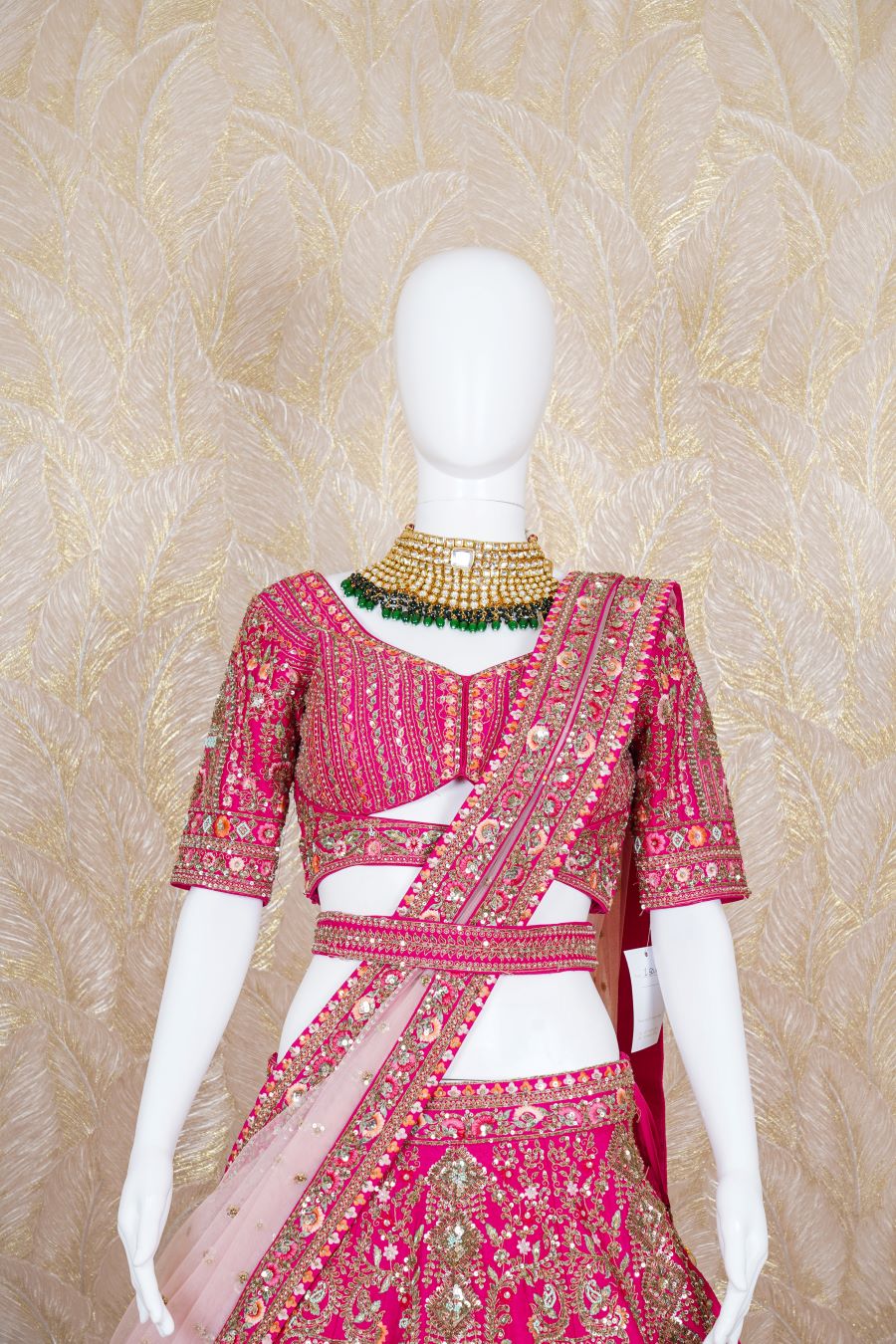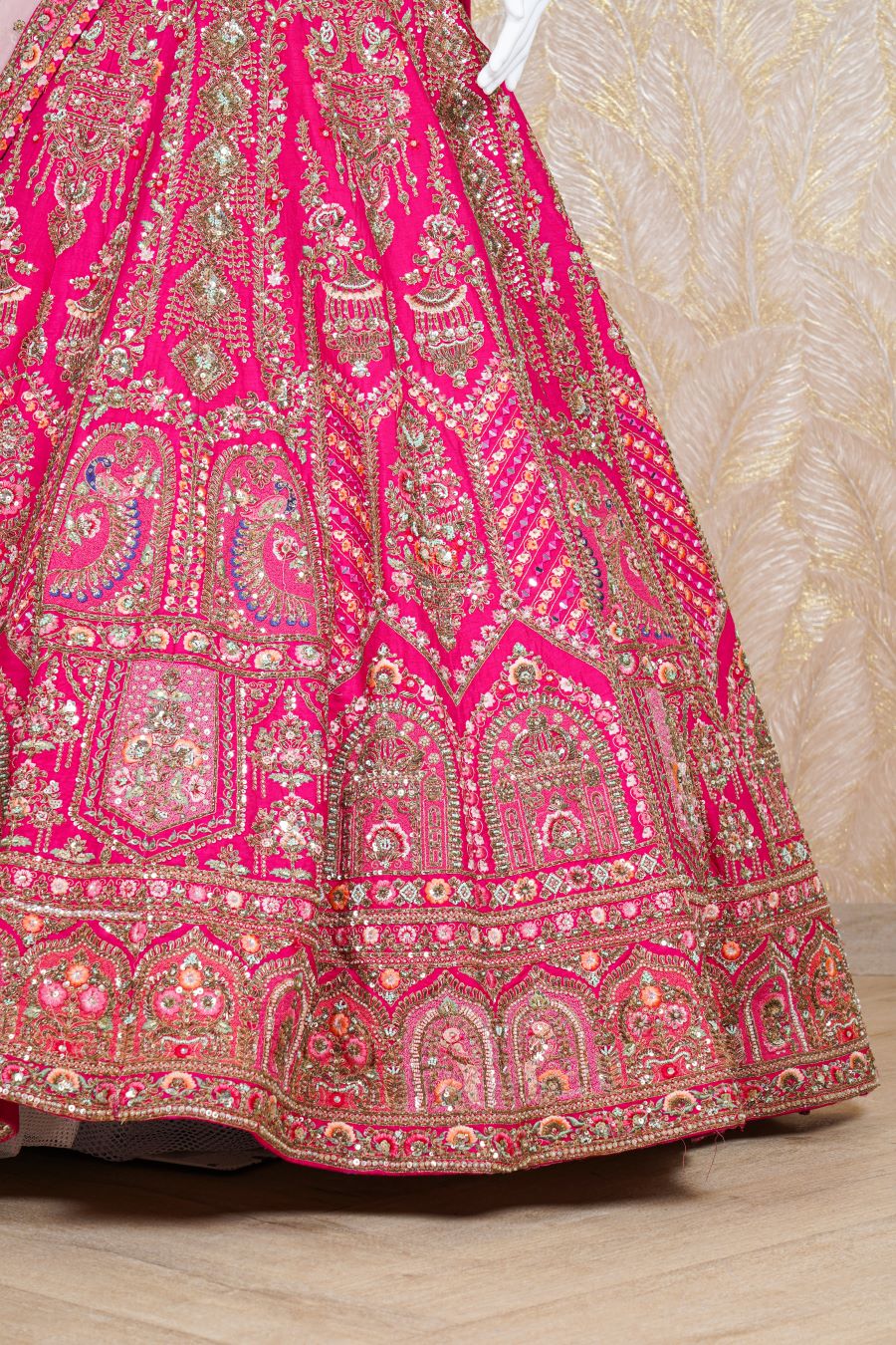Fuchsia Pink Rawsilk Lehenga with additional embellishments of golden fine dori, resham work, kardana, pearls, mirror and sequins work, paired with matching embroidered blouse, handcrafted bordered dupatta and styled with a headveil. Model is wearing size, “Medium”.
