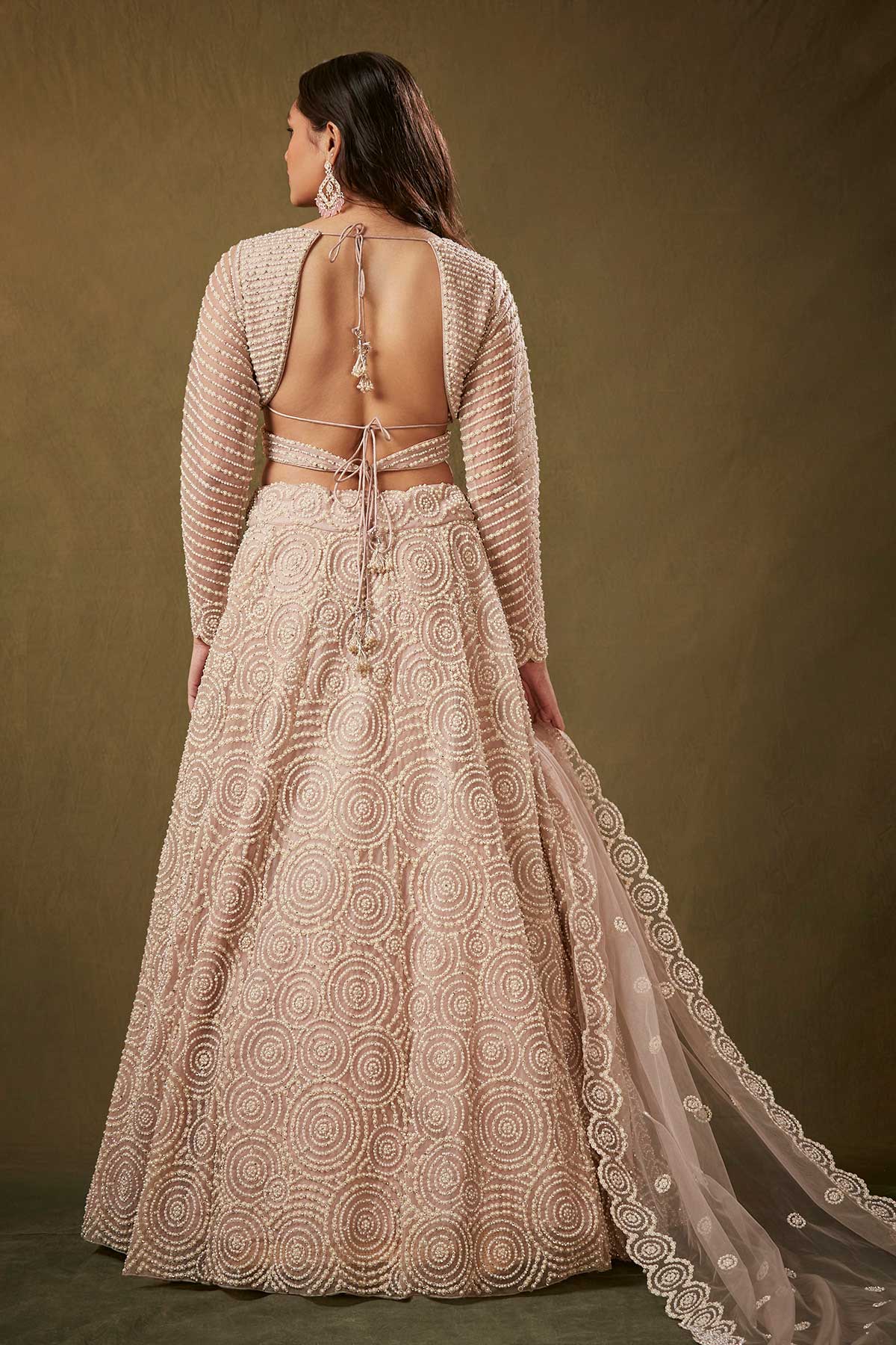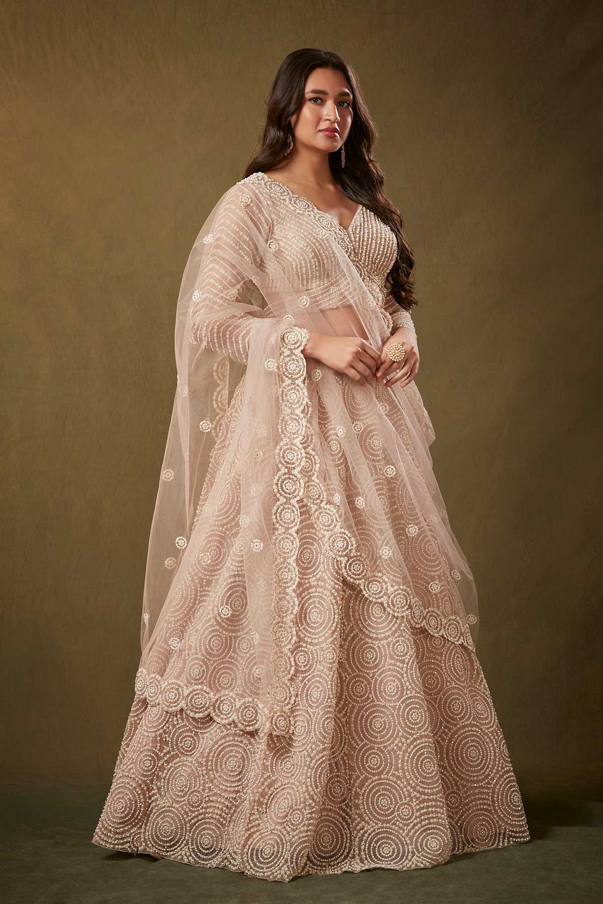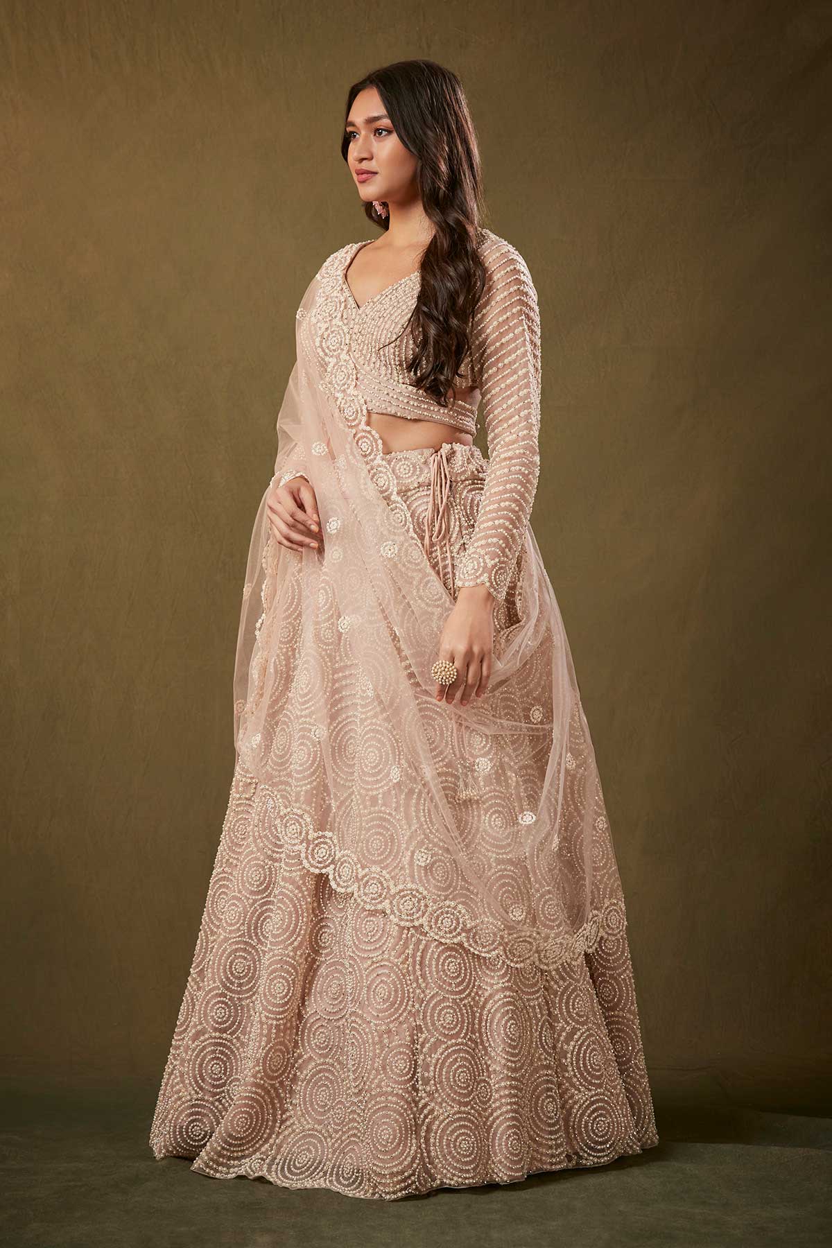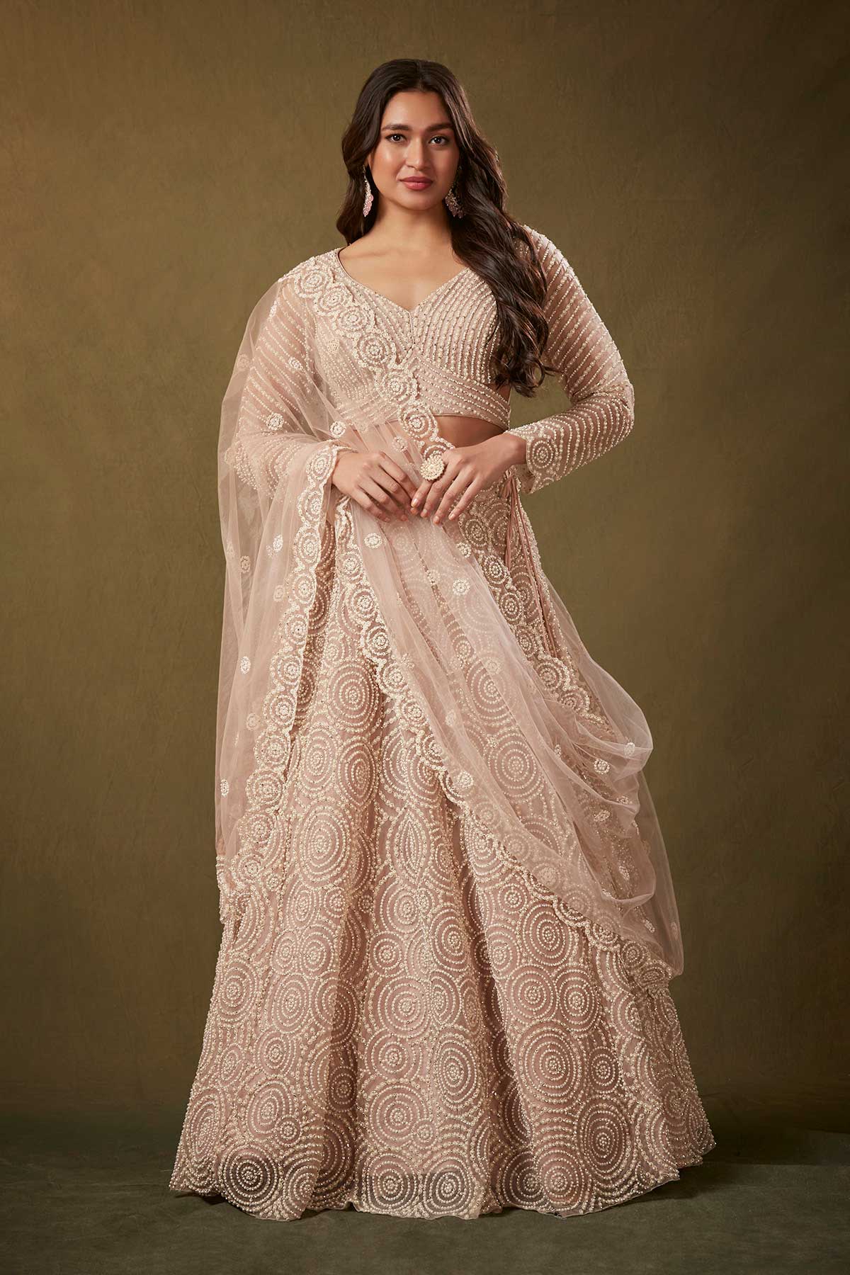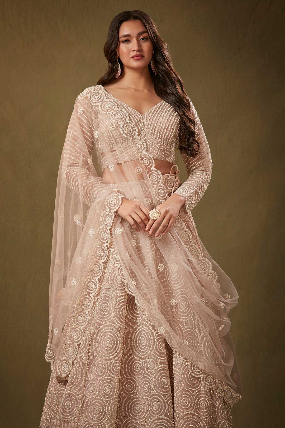 The lehenga showcases exquisite pearl work, adorned with intricate detailing and complemented by a stunning net dupatta, creating a truly beautiful ensemble.