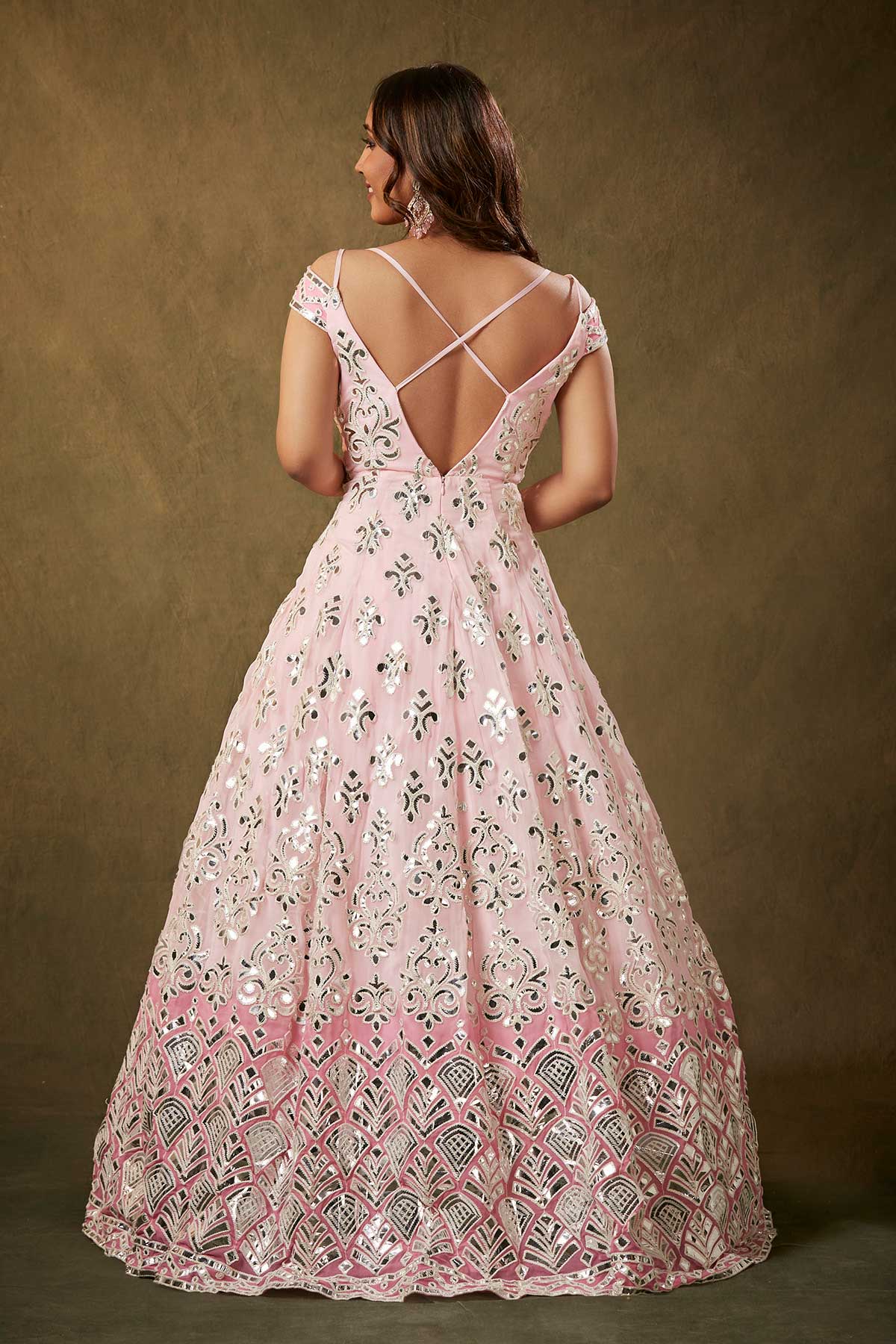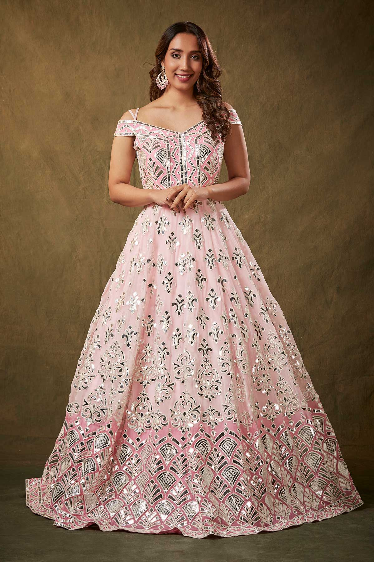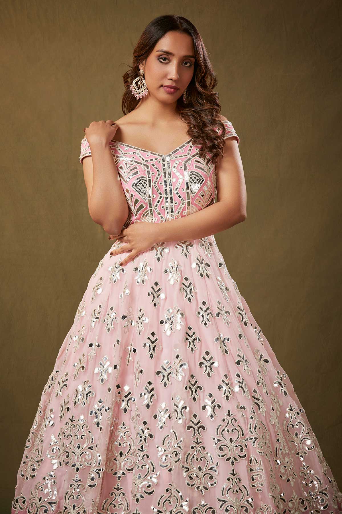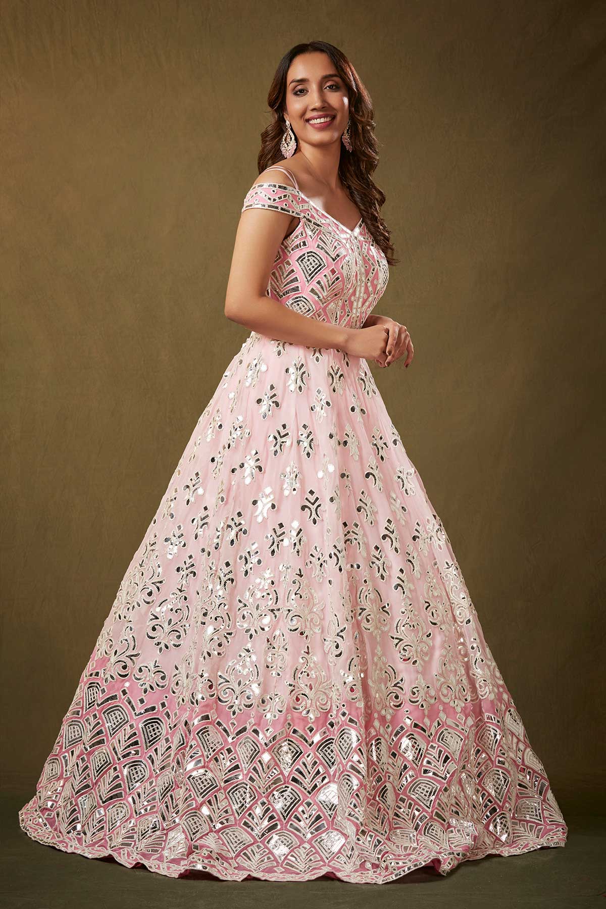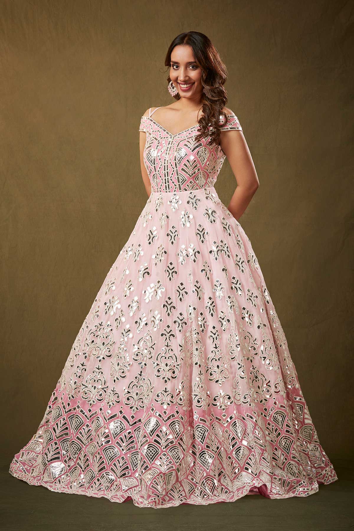 A stunning pink off-shoulder gown adorned with exquisite gota patti detailing, featuring a graceful flare that exudes elegance.