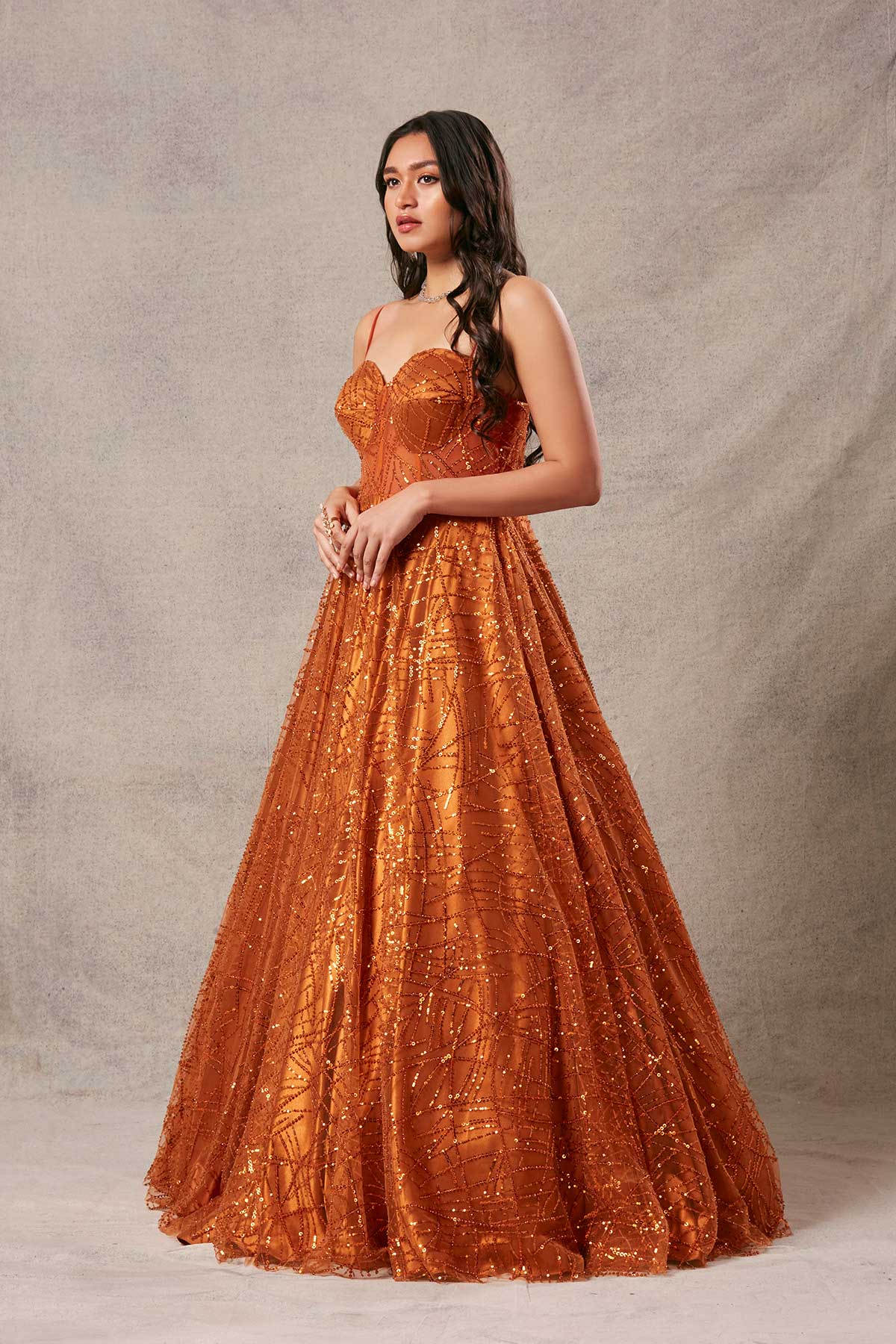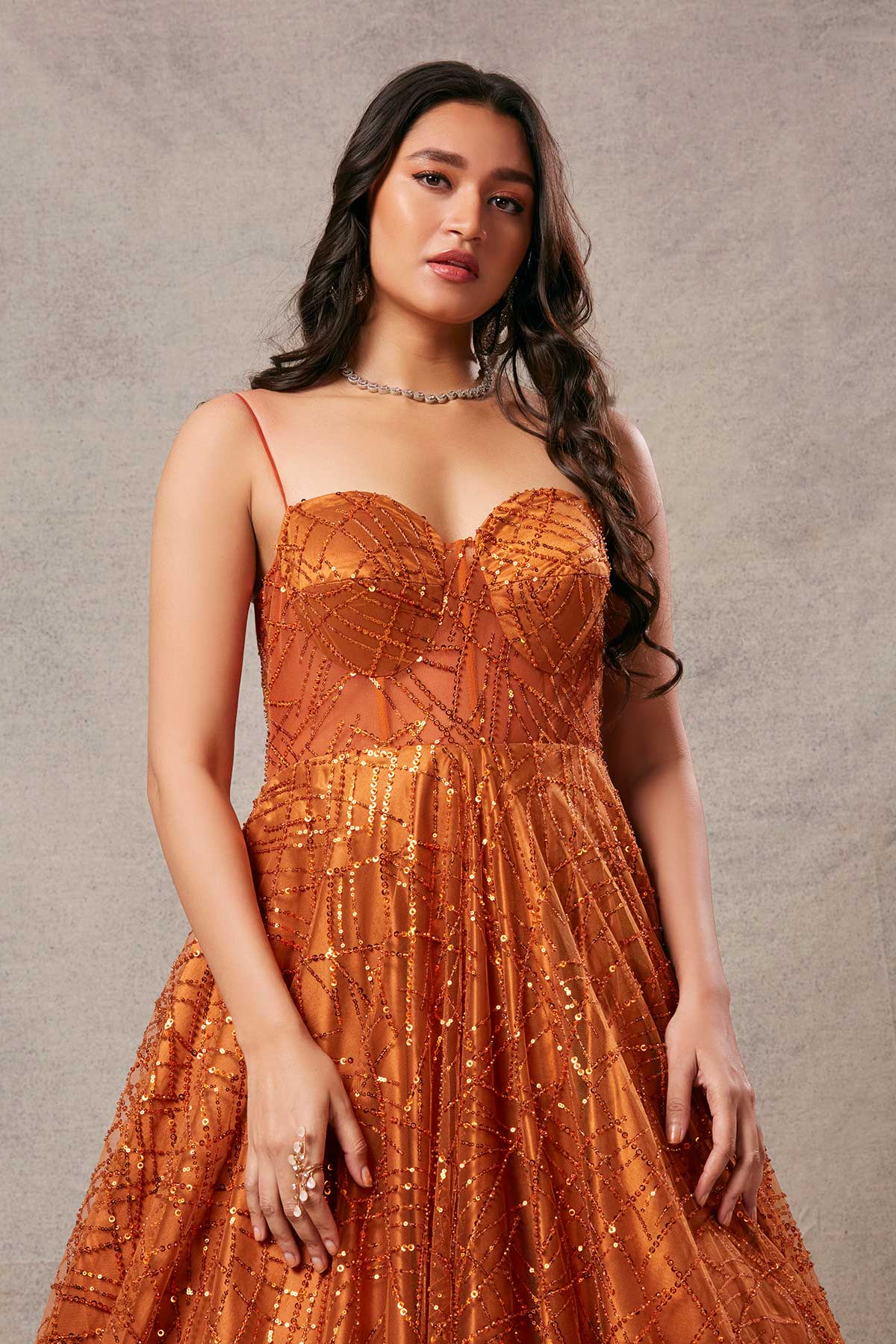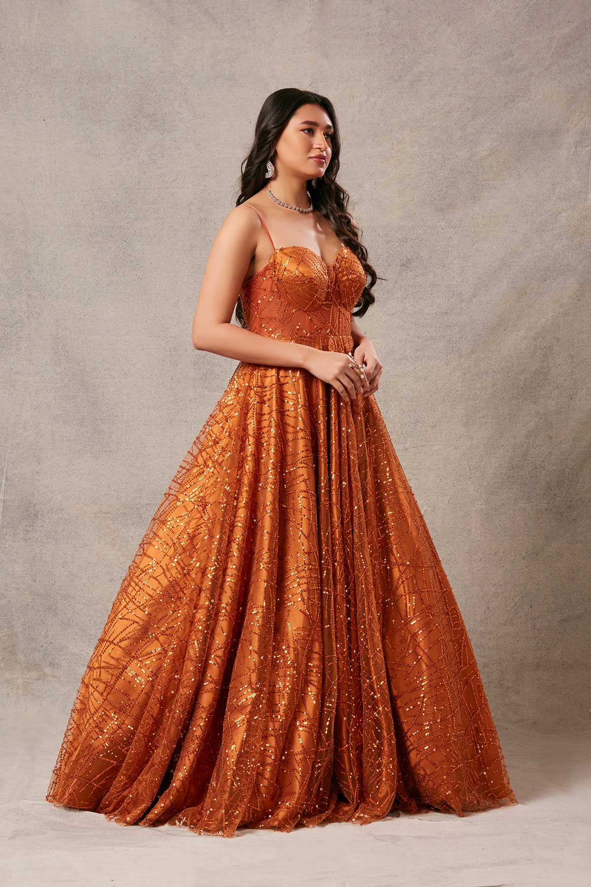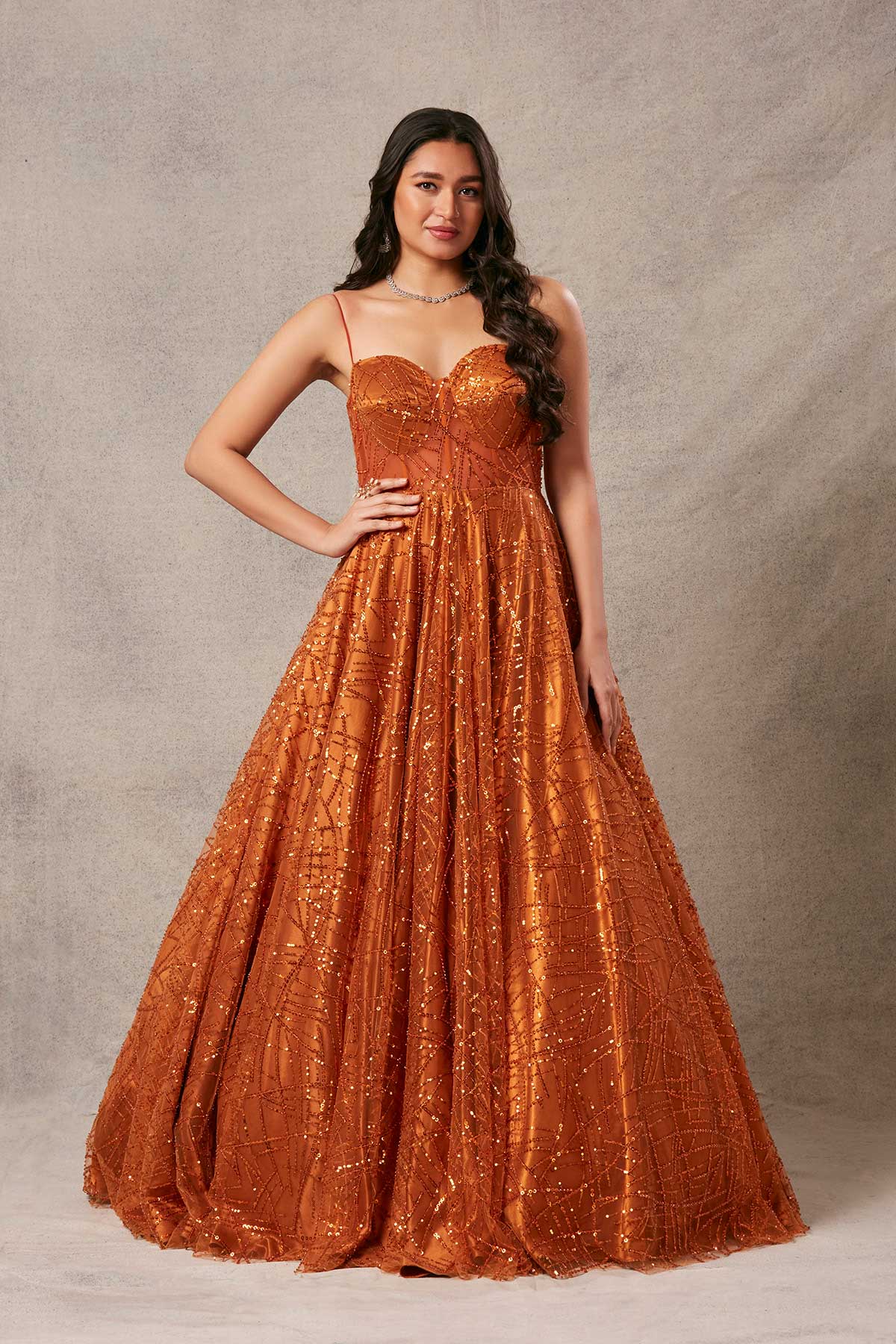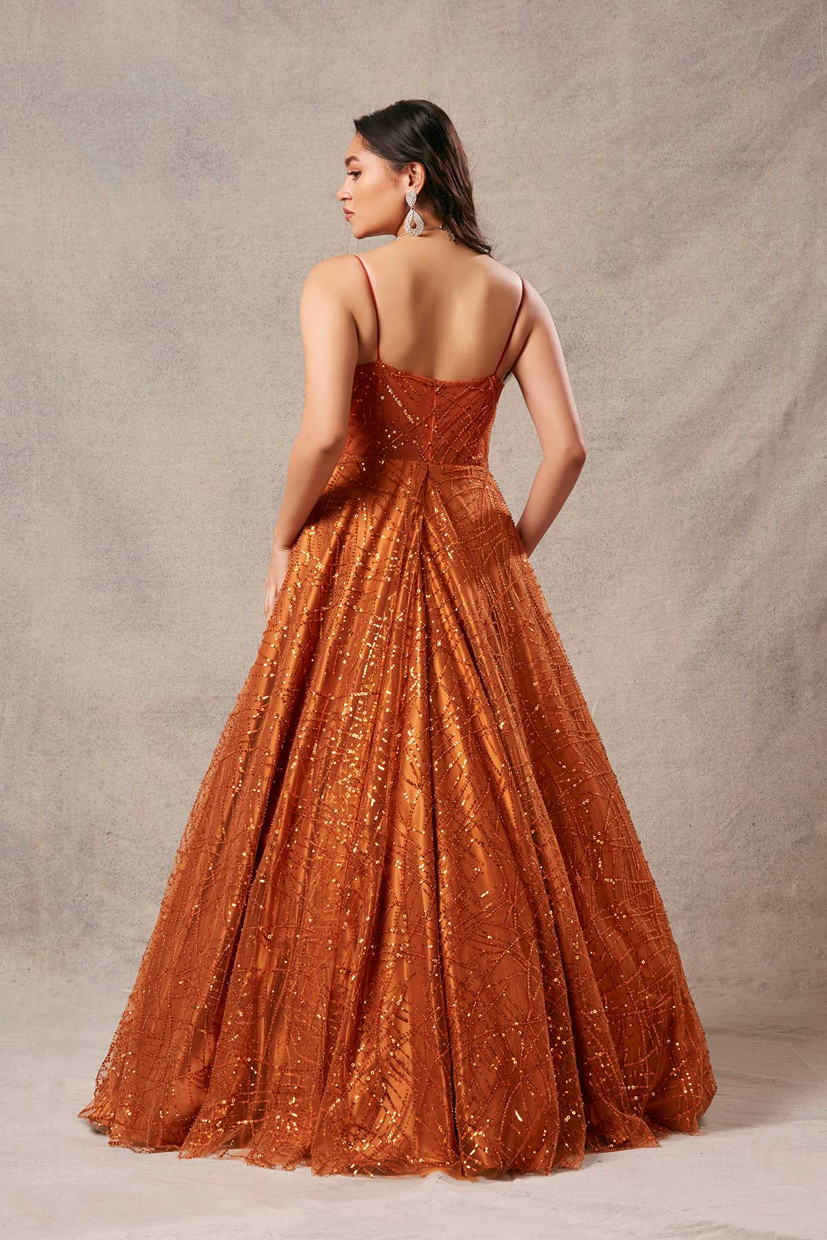 A rust orange gown, elegantly adorned with intricate embroidery on delicate net fabric and complemented by a sumptuous satin lining.