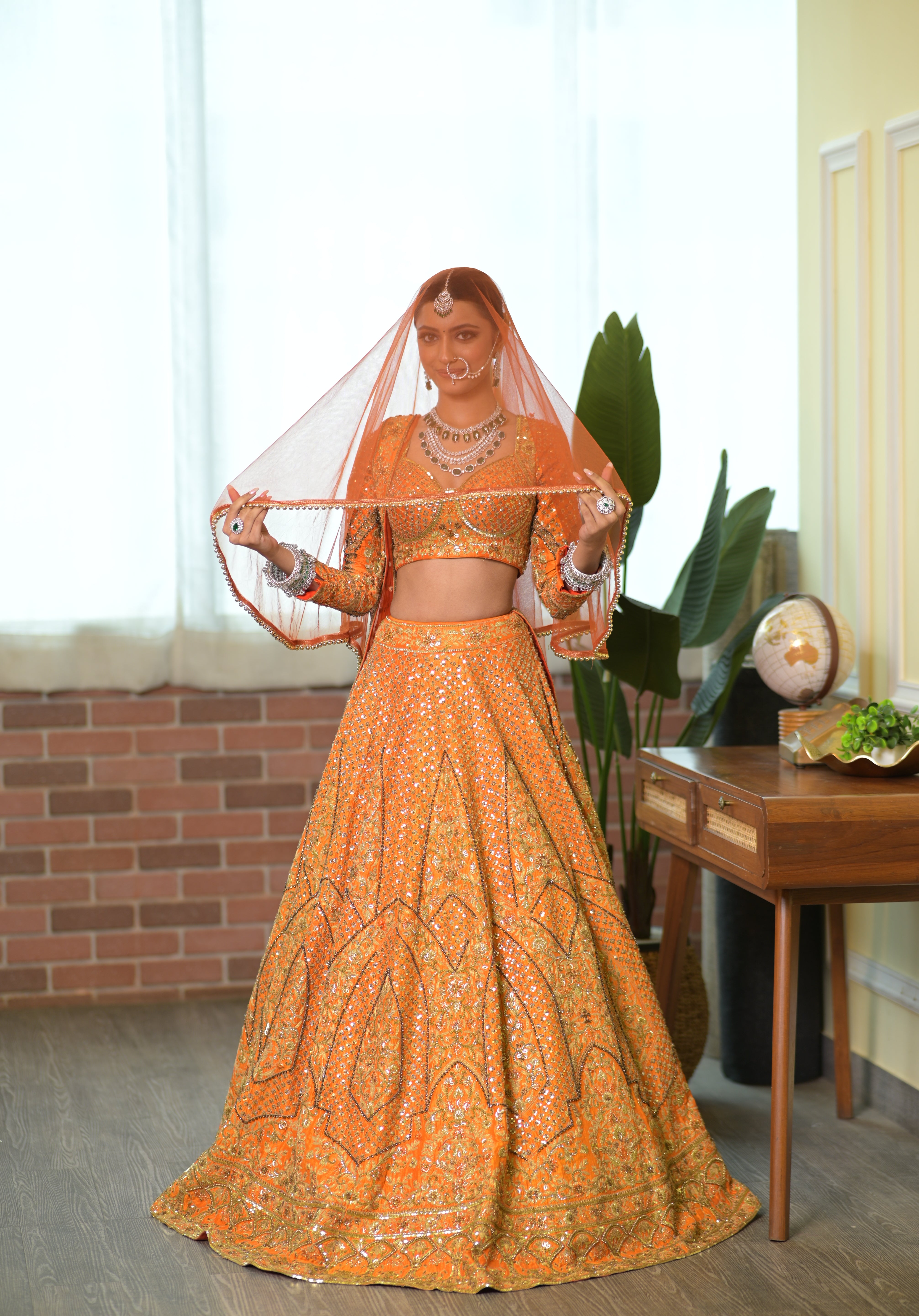 This exquisite orange creation captivates the eye, adorned with intricate gold and tikli craftsmanship.
