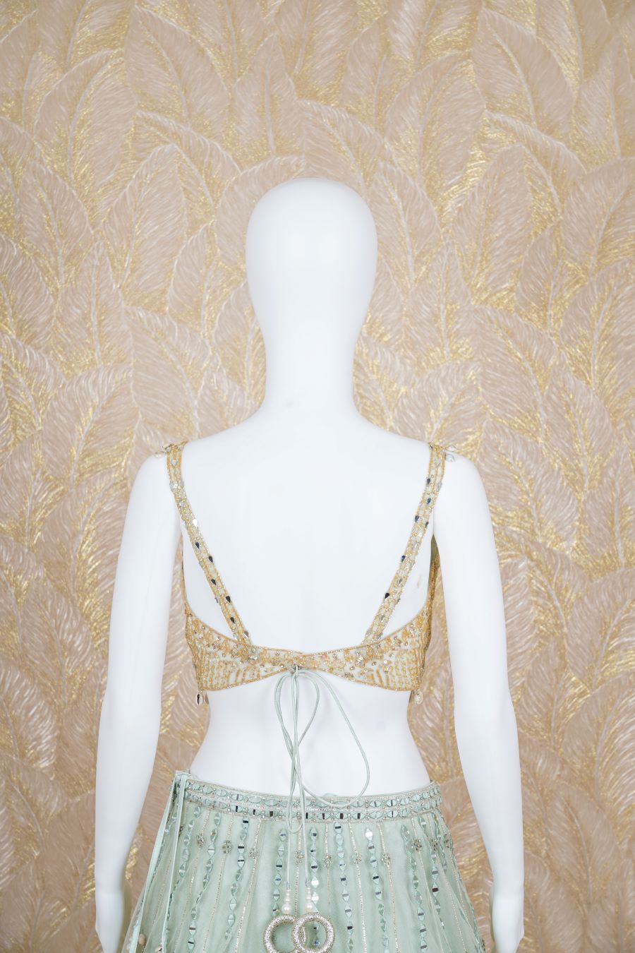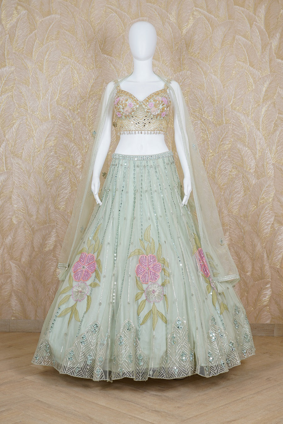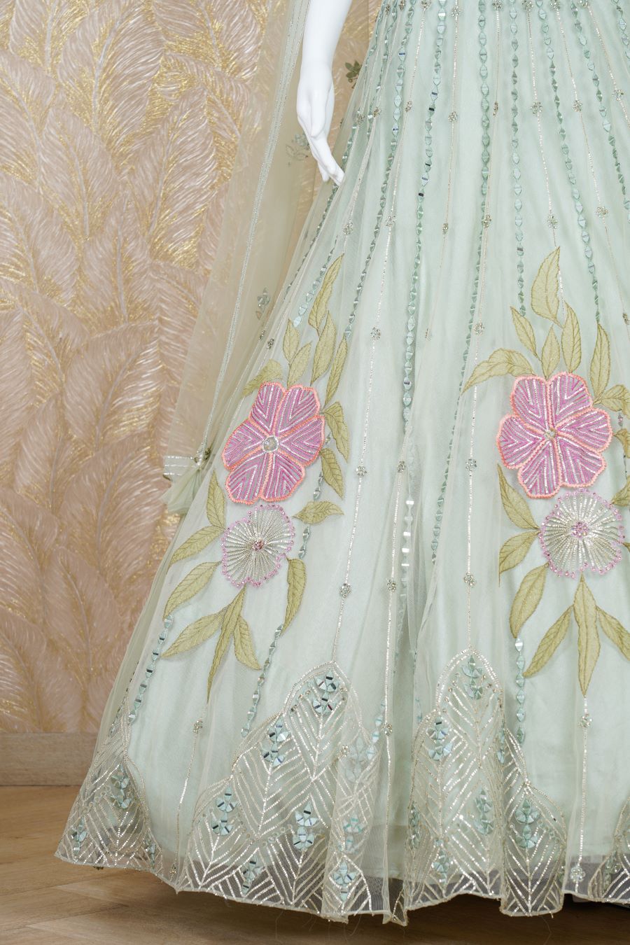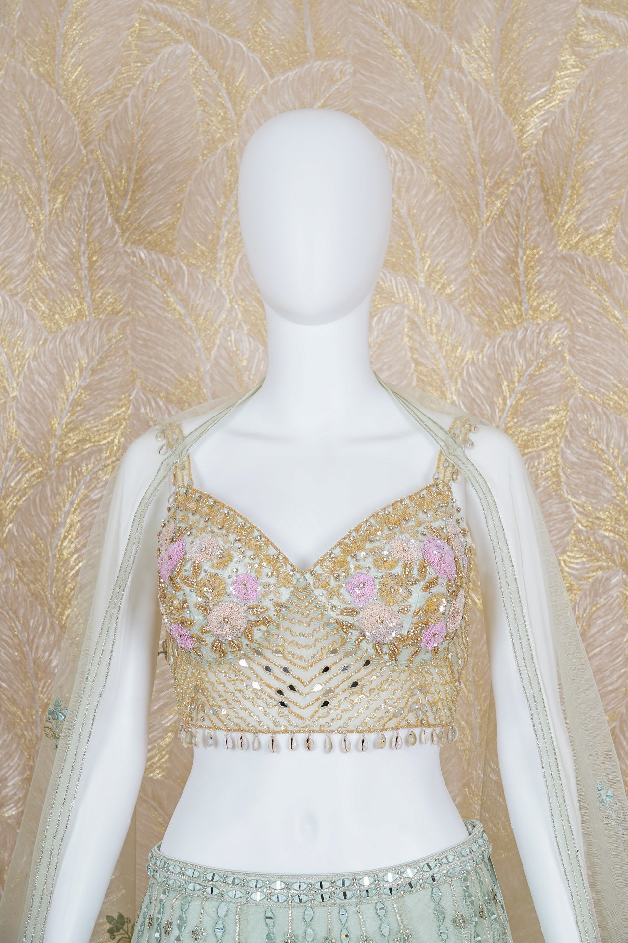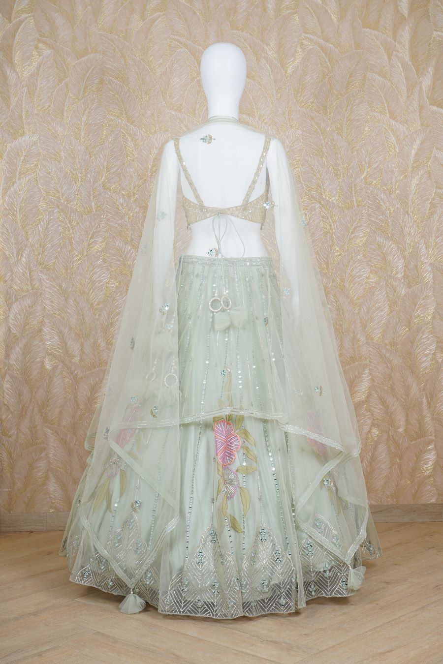 Pista Tulle Lehenga adorned with sequins, kardana, resham, pearls, mirror and organza patch work. Paired with a matching embroidered blouse with tassels and bordered tulle dupatta. Model is wearing size, “Medium”.