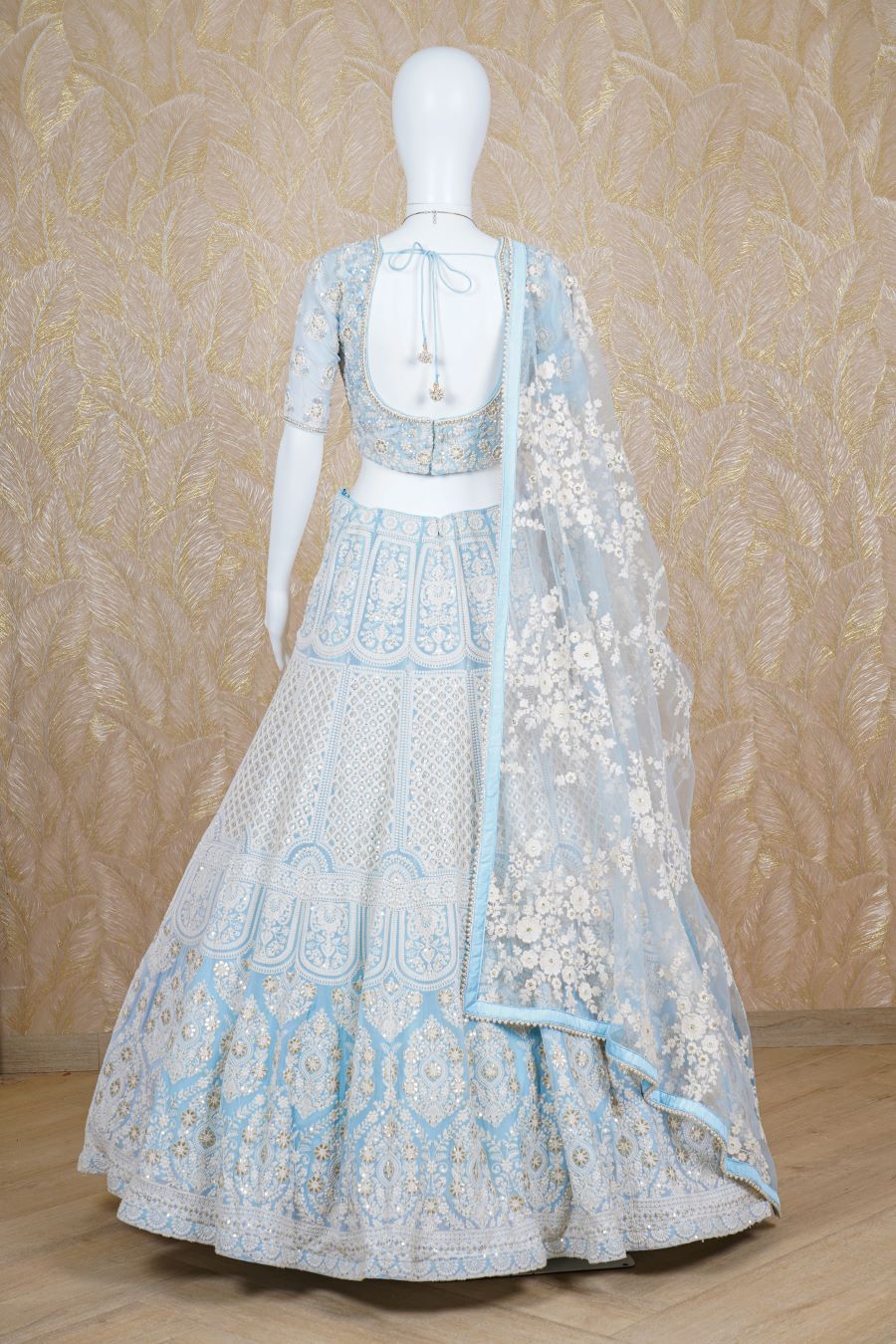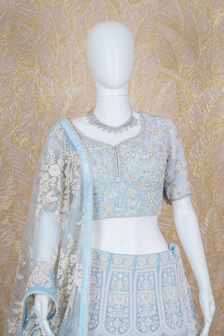 Powder Blue Georgette based Lucknowi thread embroidered lehenga with kardana, pearl, thread handcrafted embroidered blouse and styled with all-over embroidered dupatta. Model is wearing size, “Medium”.