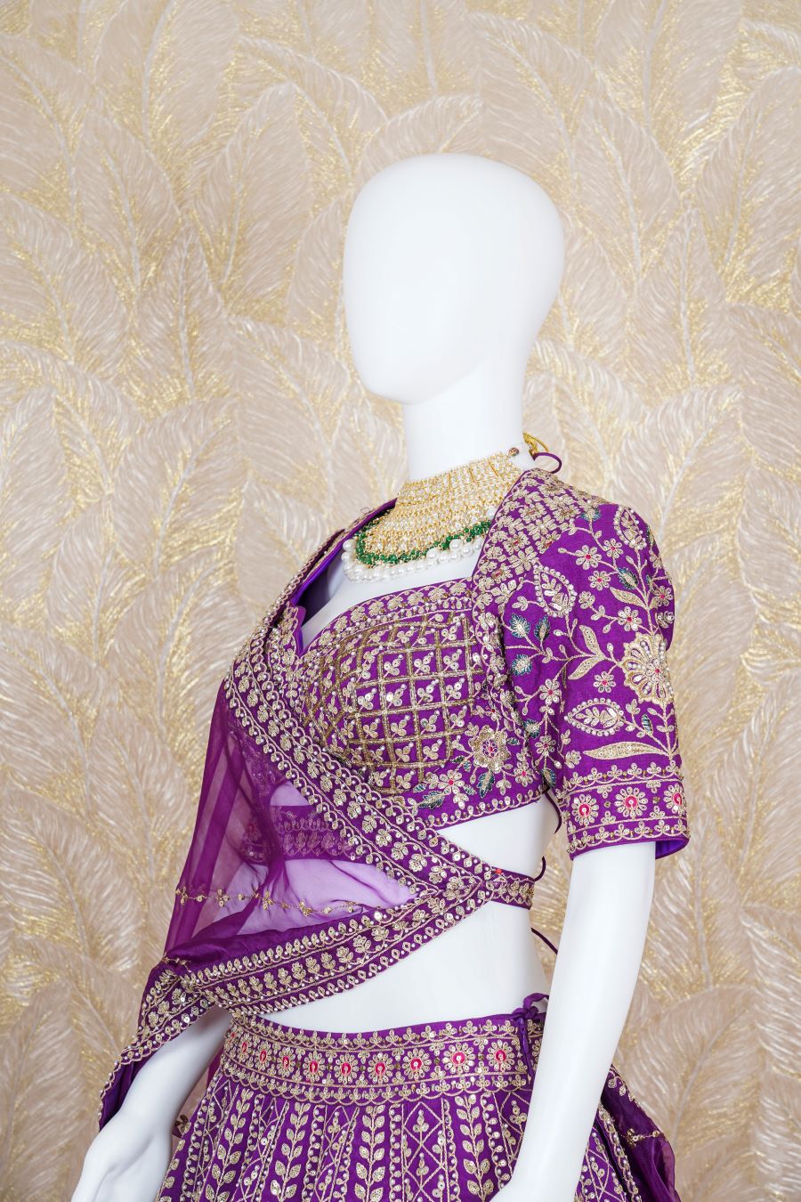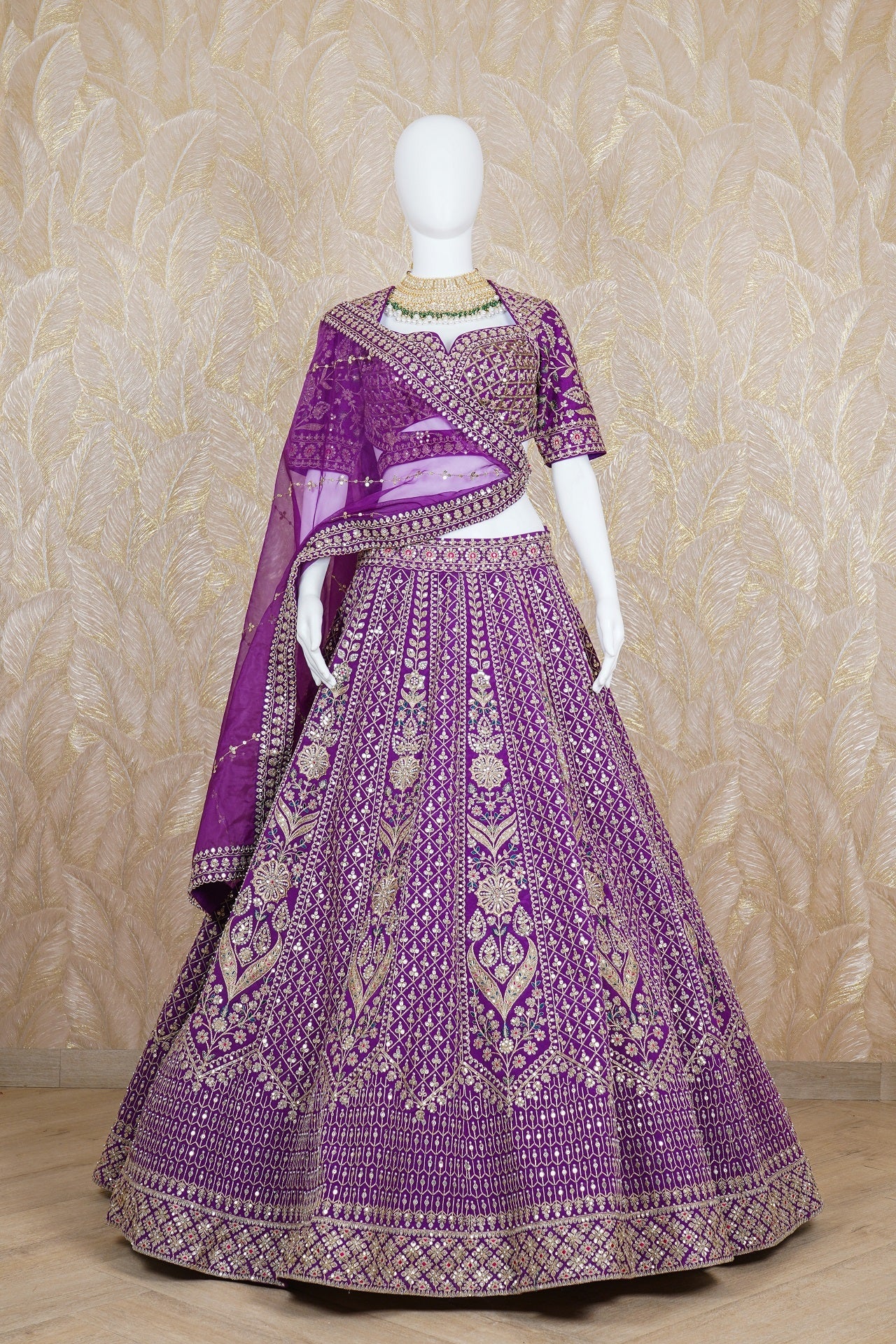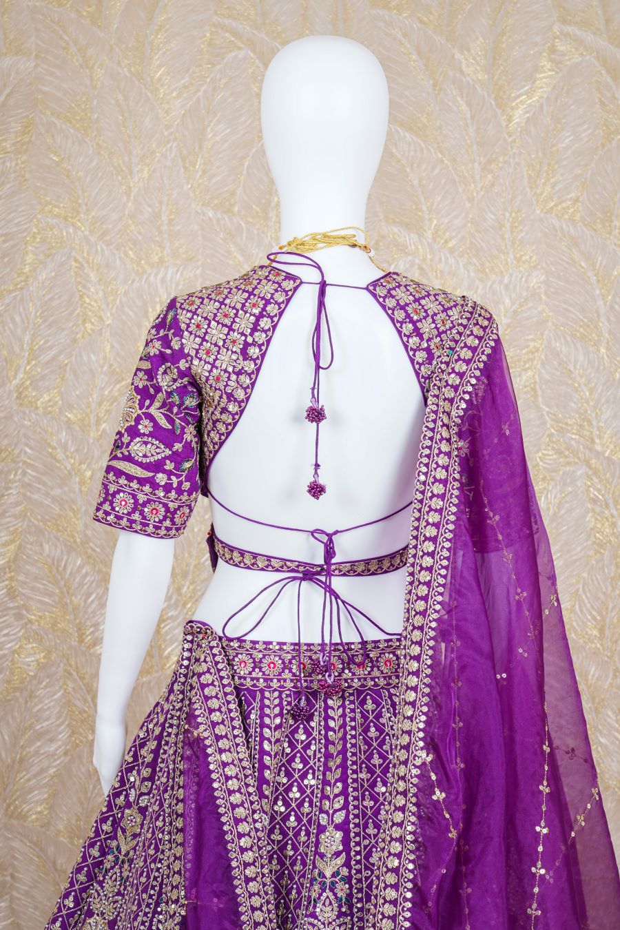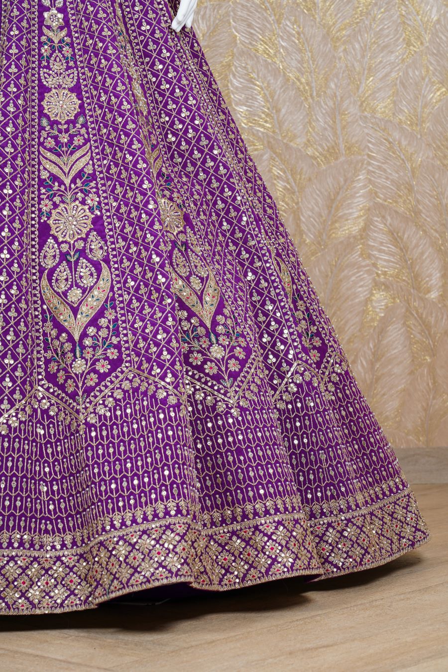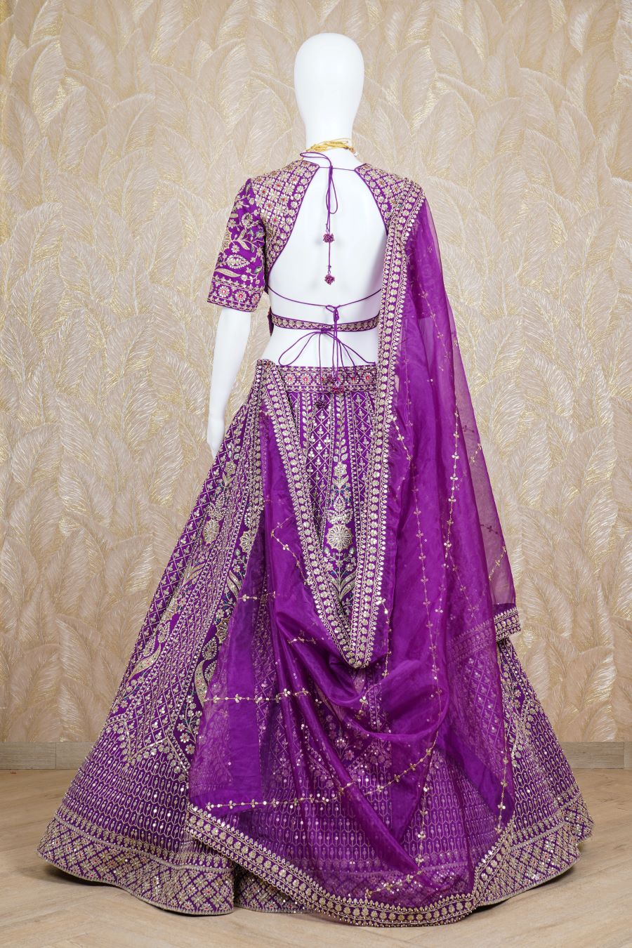 Purple Rawsilk Lehenga with additional embellishments of fine dori, resham, zari, kadana, pearls and sequins handcrafted. Paired with a purple embroidered blouse. Finished with a gold Jaal embroidery. Model is wearing size, “Medium”.